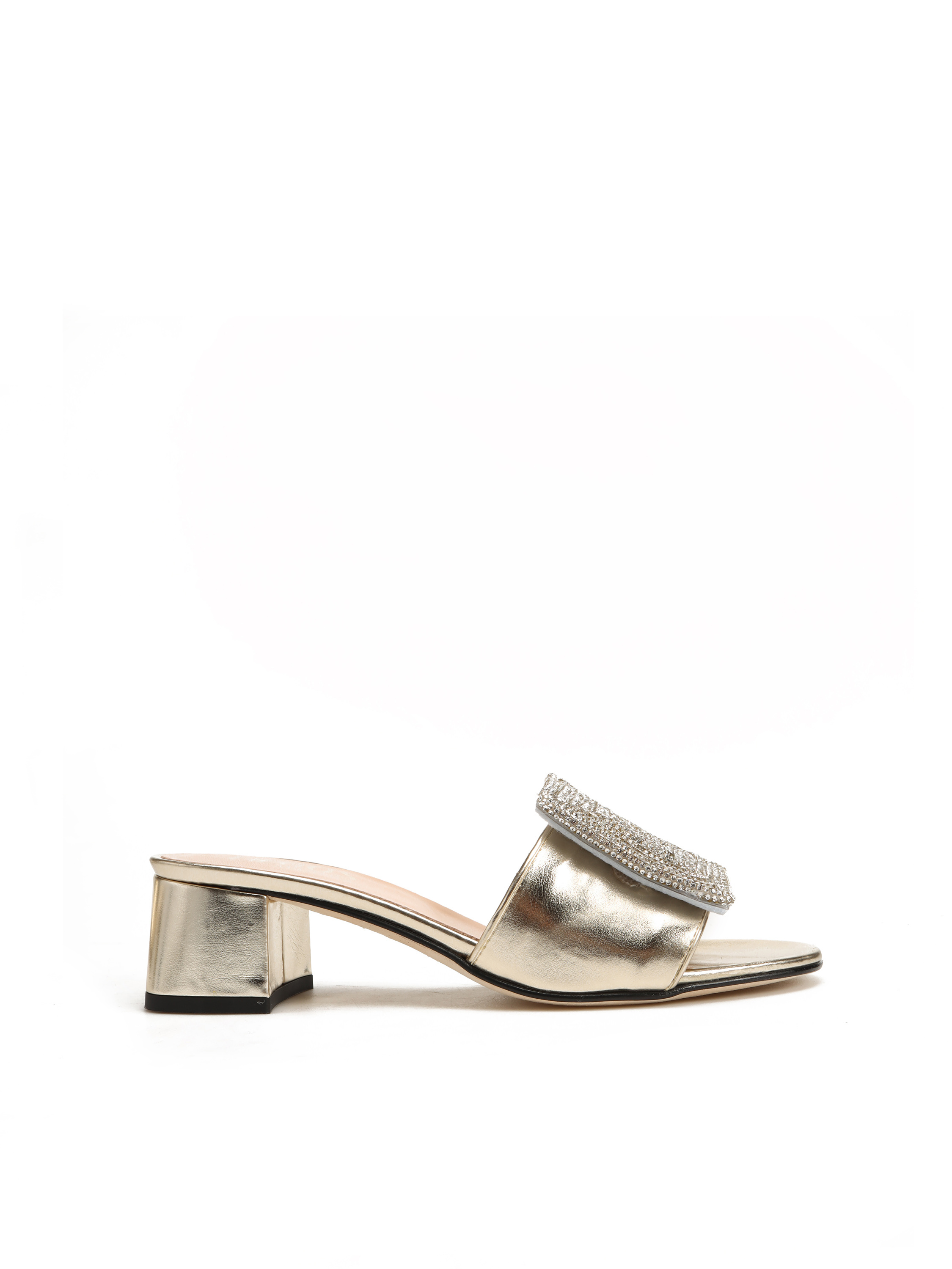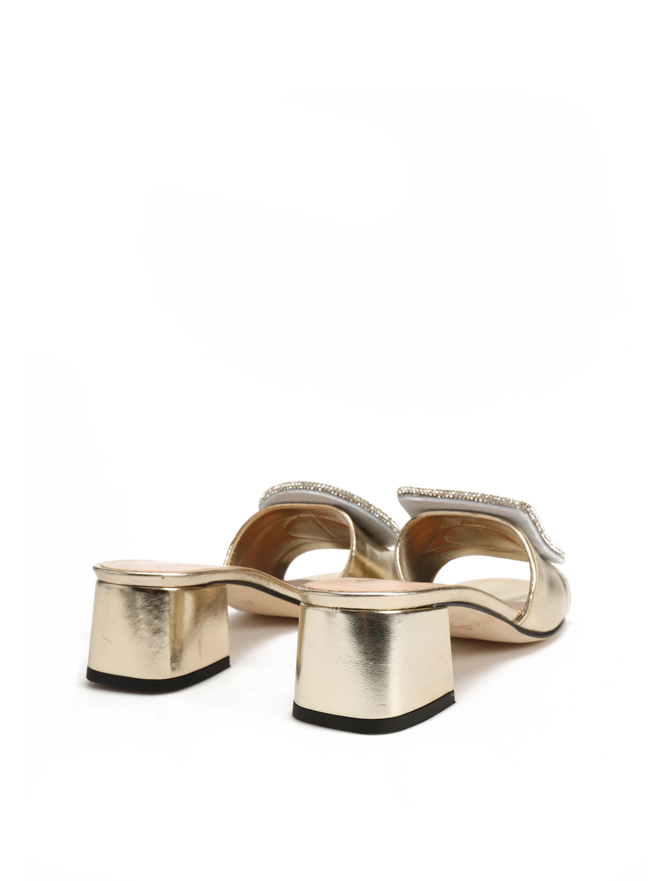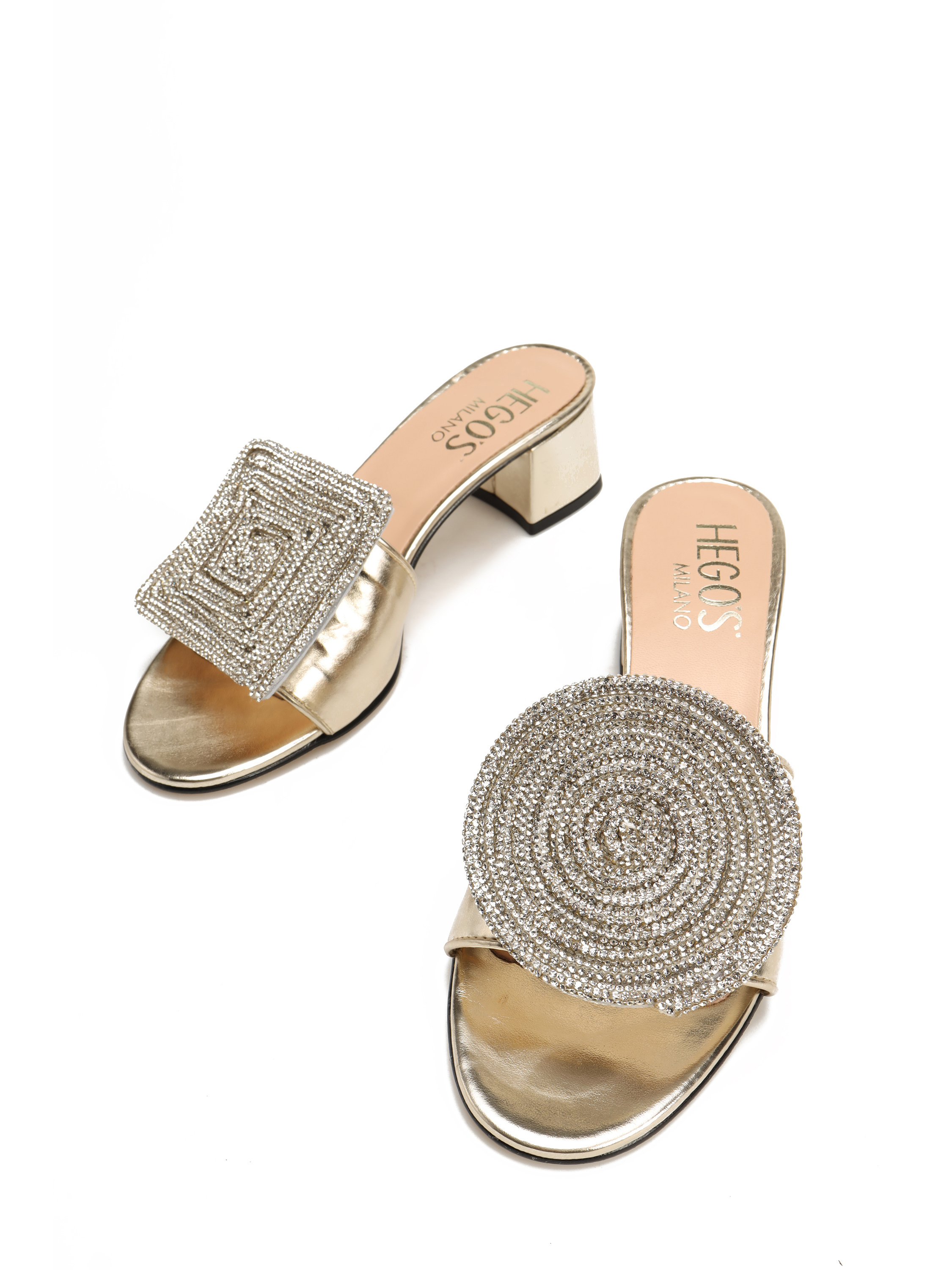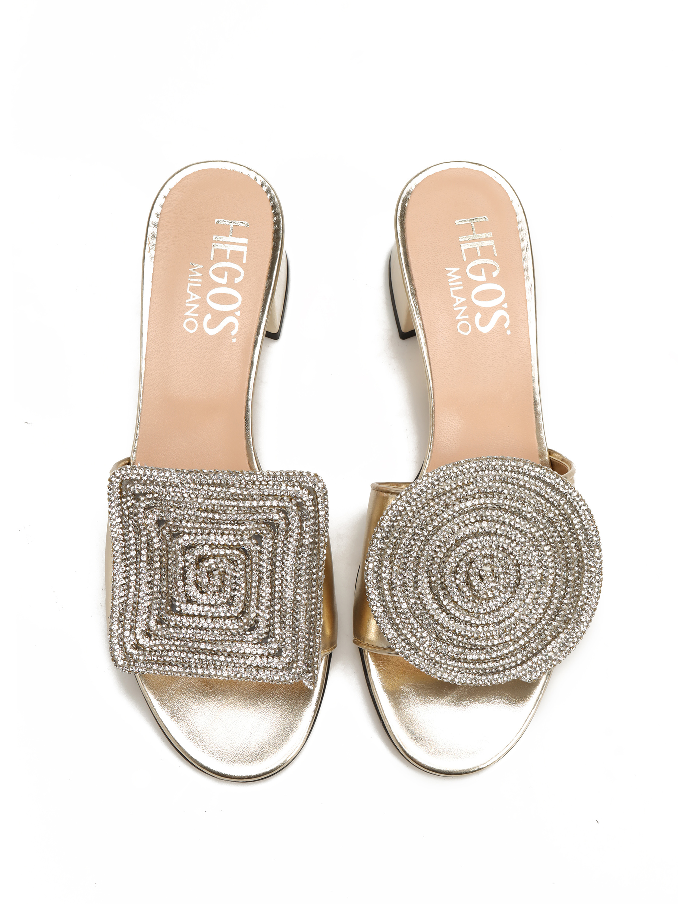 Wsuwane klapki na obcasie HEGO'S Milano to obowiązkowy element letniej garderoby. Cholewka w złotym kolorze posiada geometryczną, połyskującą ozdobę która wyróżnia ten model. Klapki na niewysokim, wygodnym obcasie.