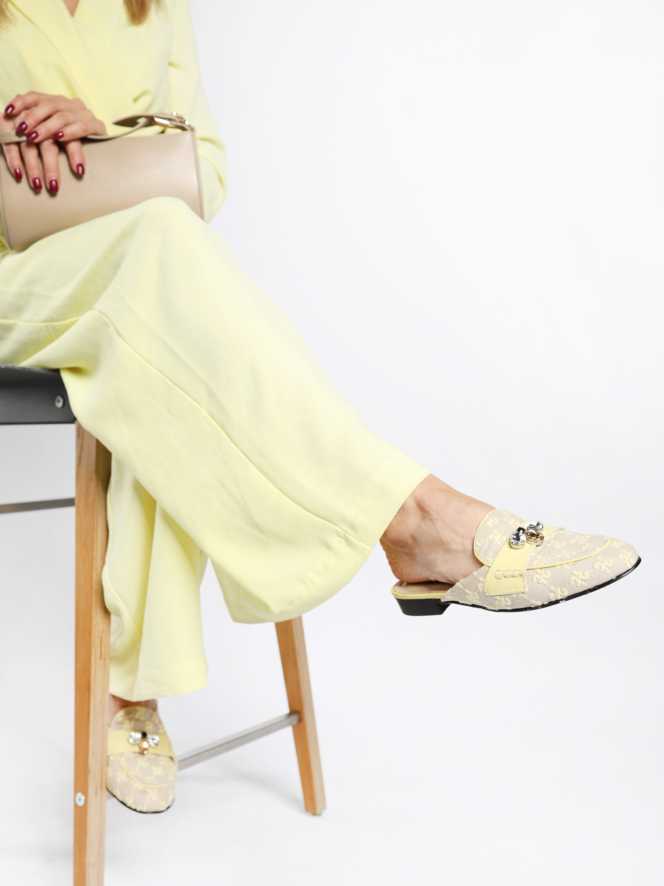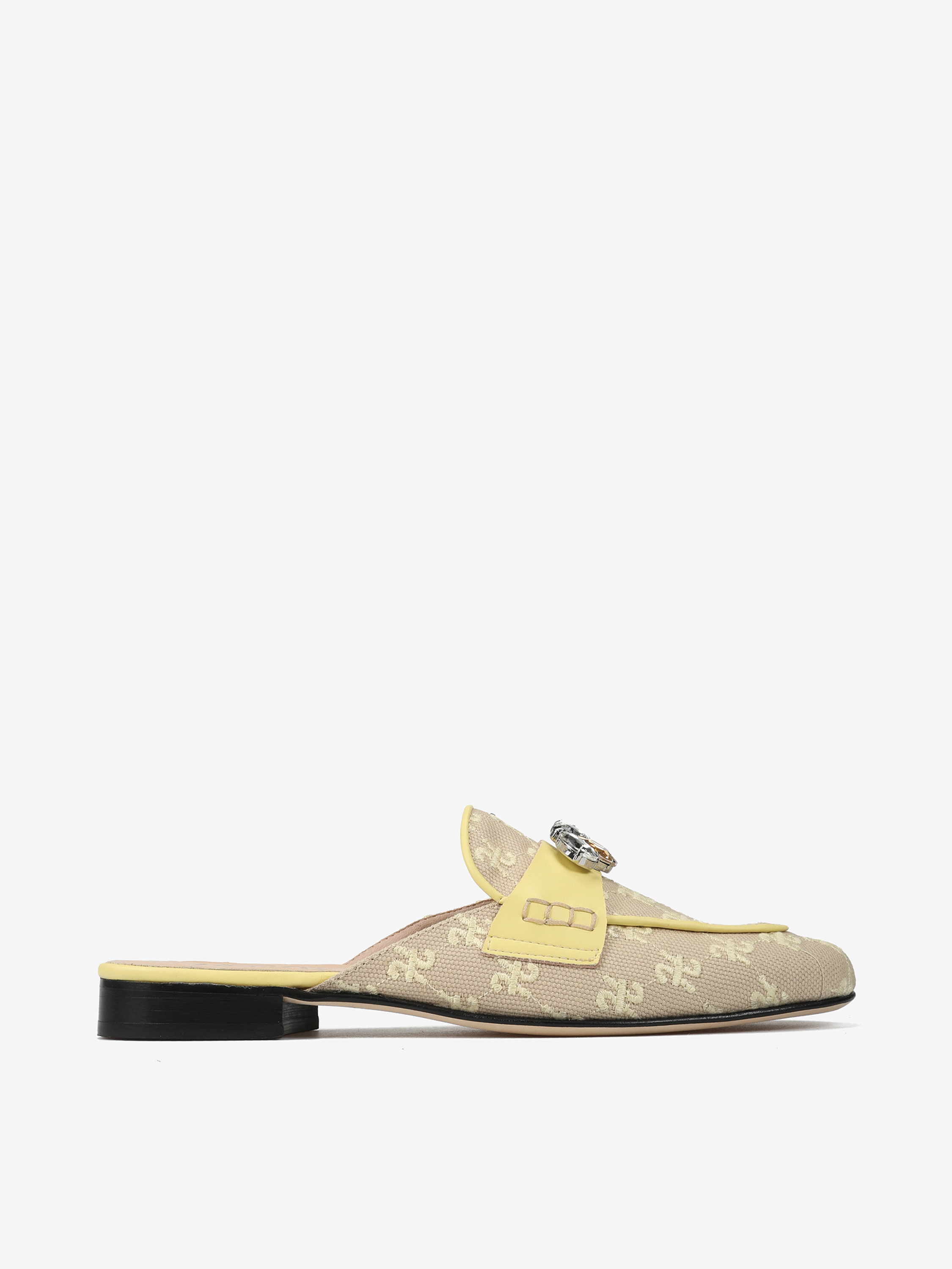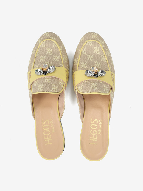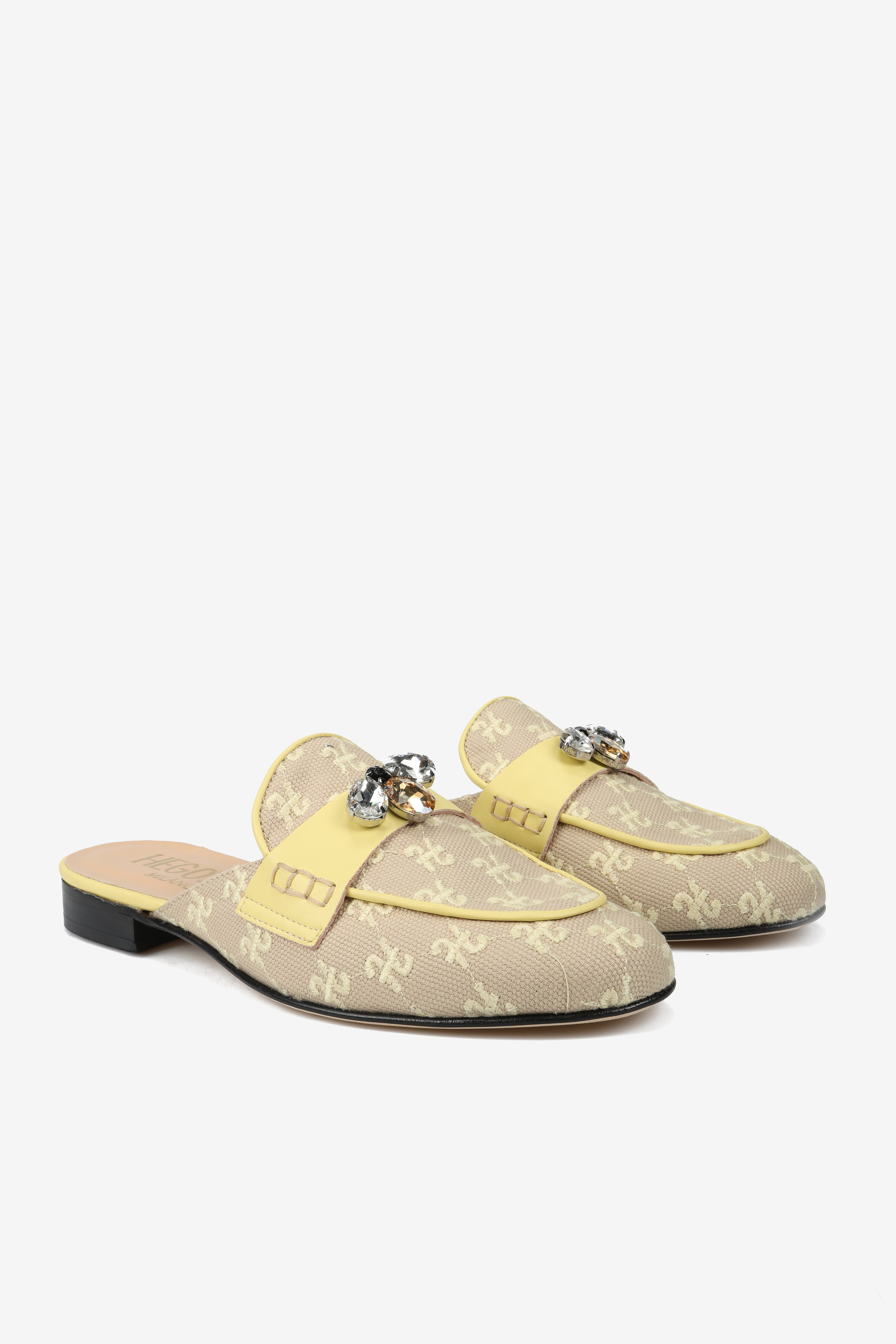 Materiałowe mule z haftowanym monogramem, skórzanymi przeszyciami i biżuteryjną aplikacją.