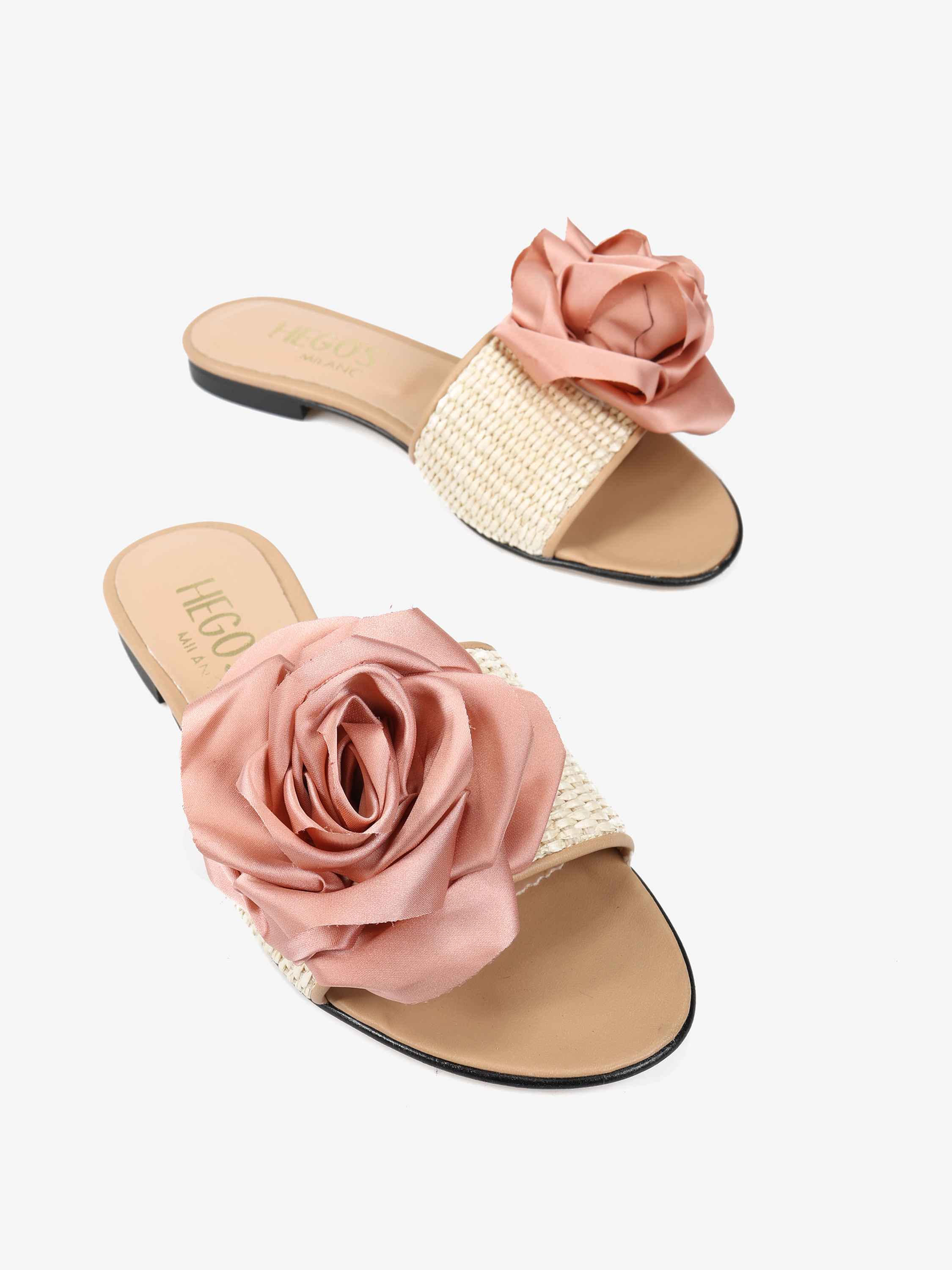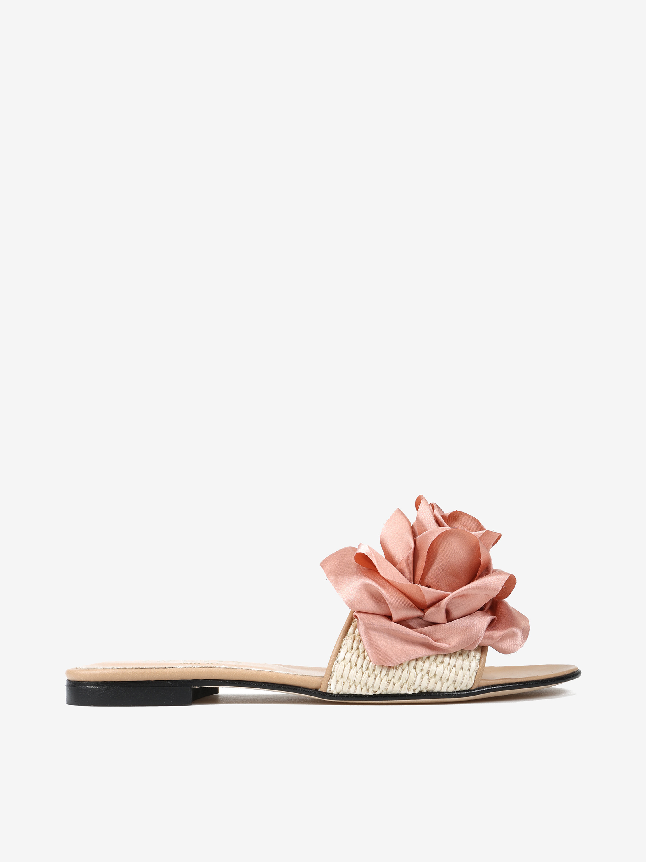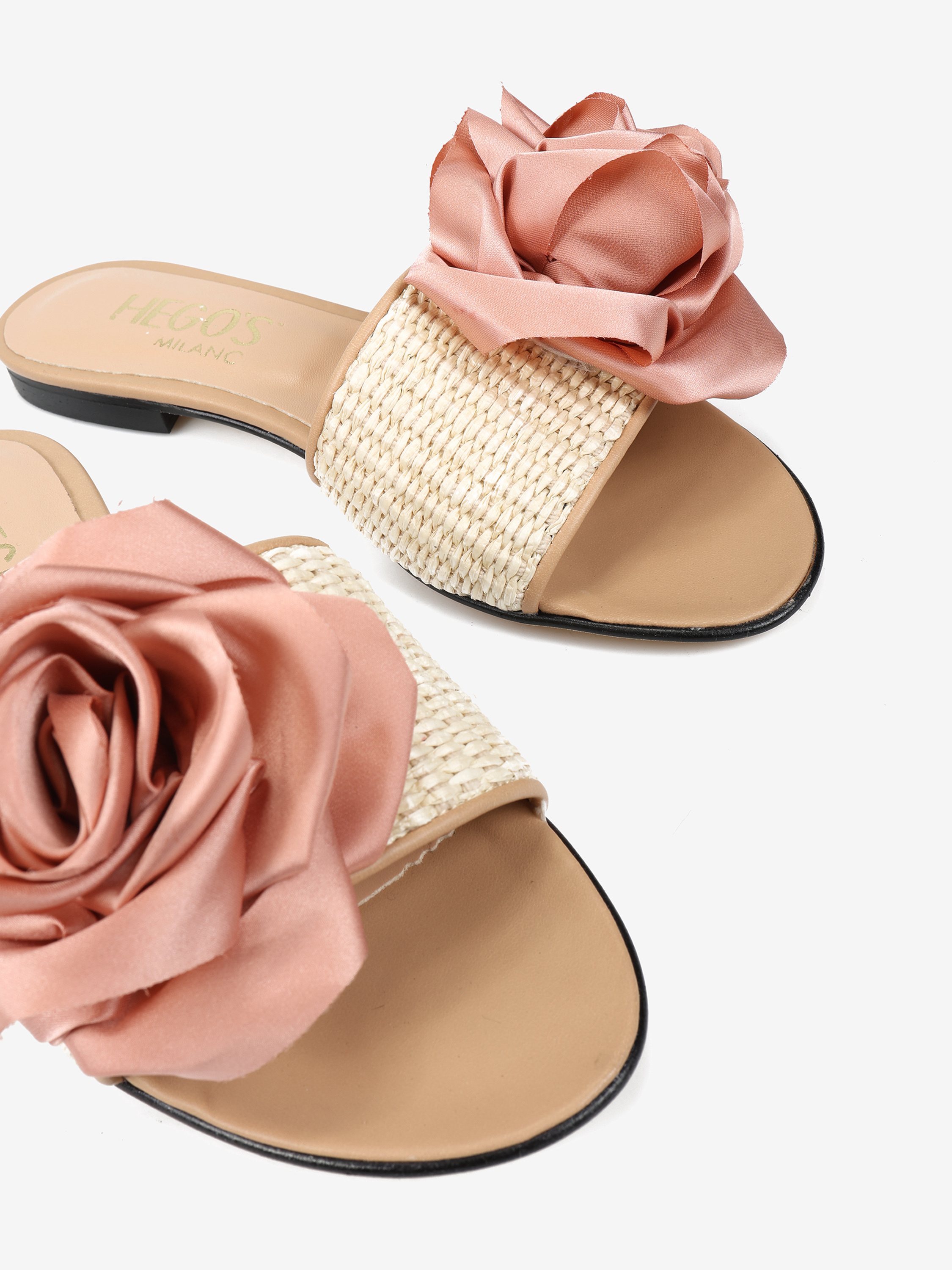 Klapki z rafii i skóry naturalnej z ozdobnym kwiatem.