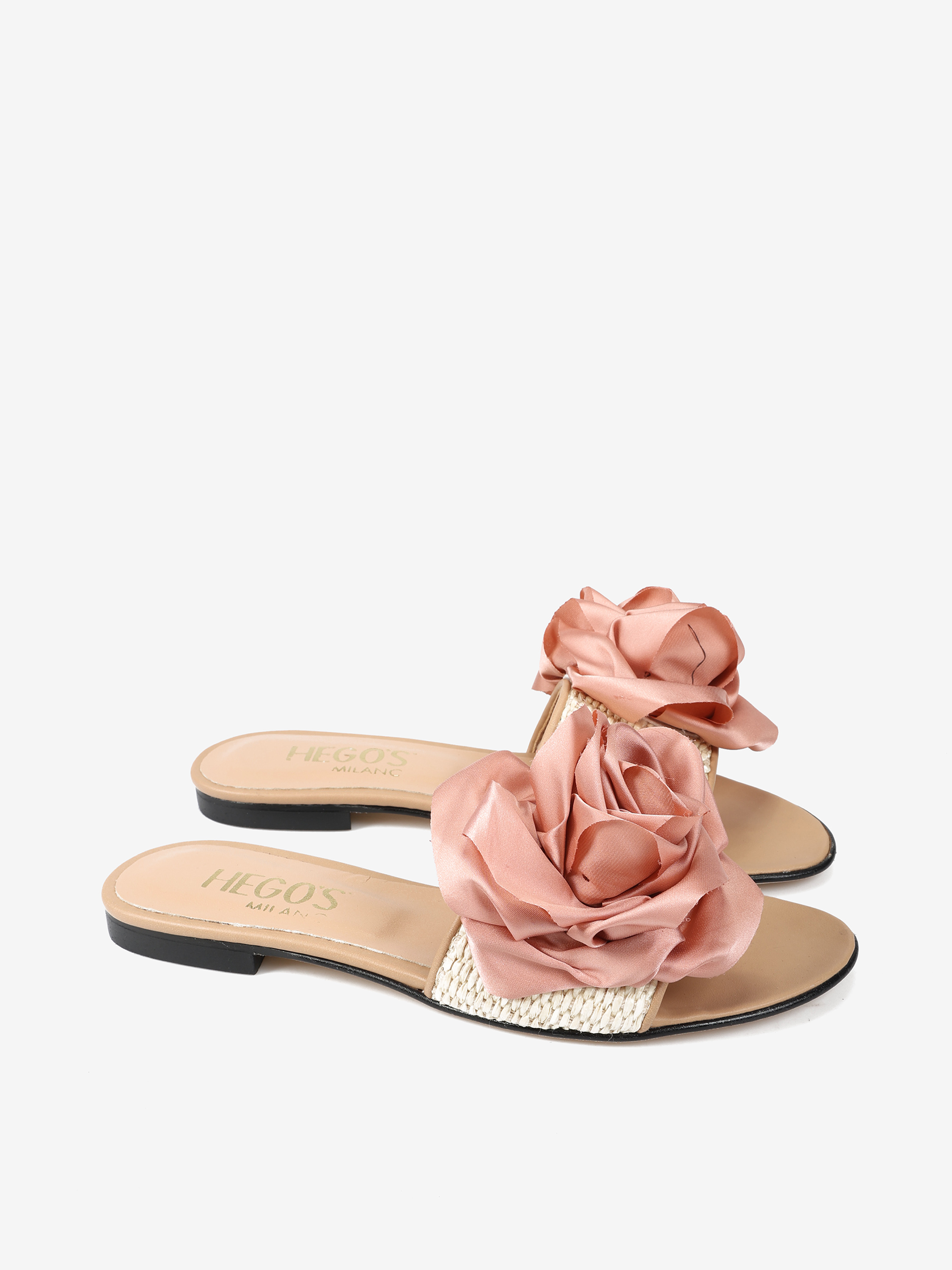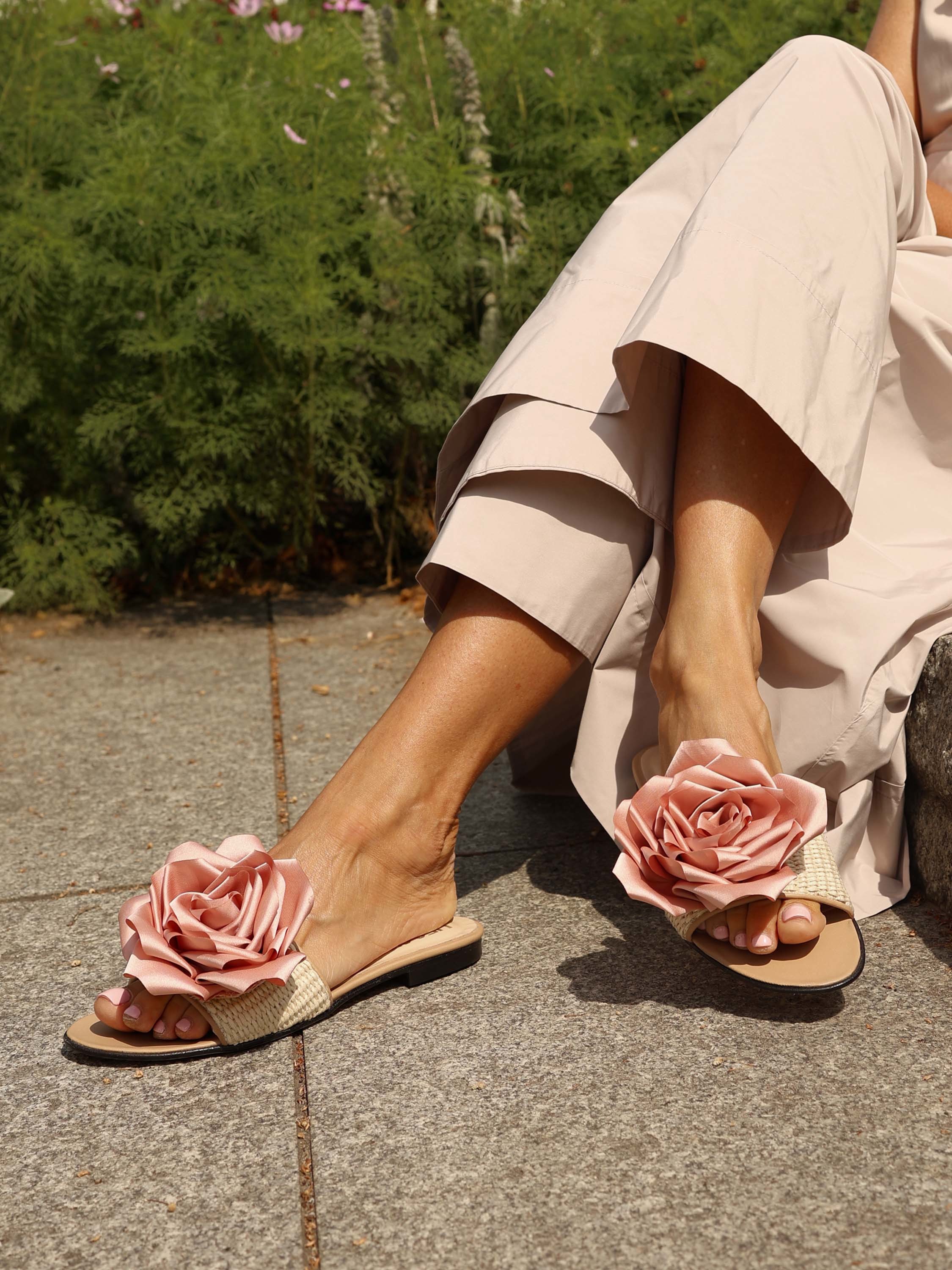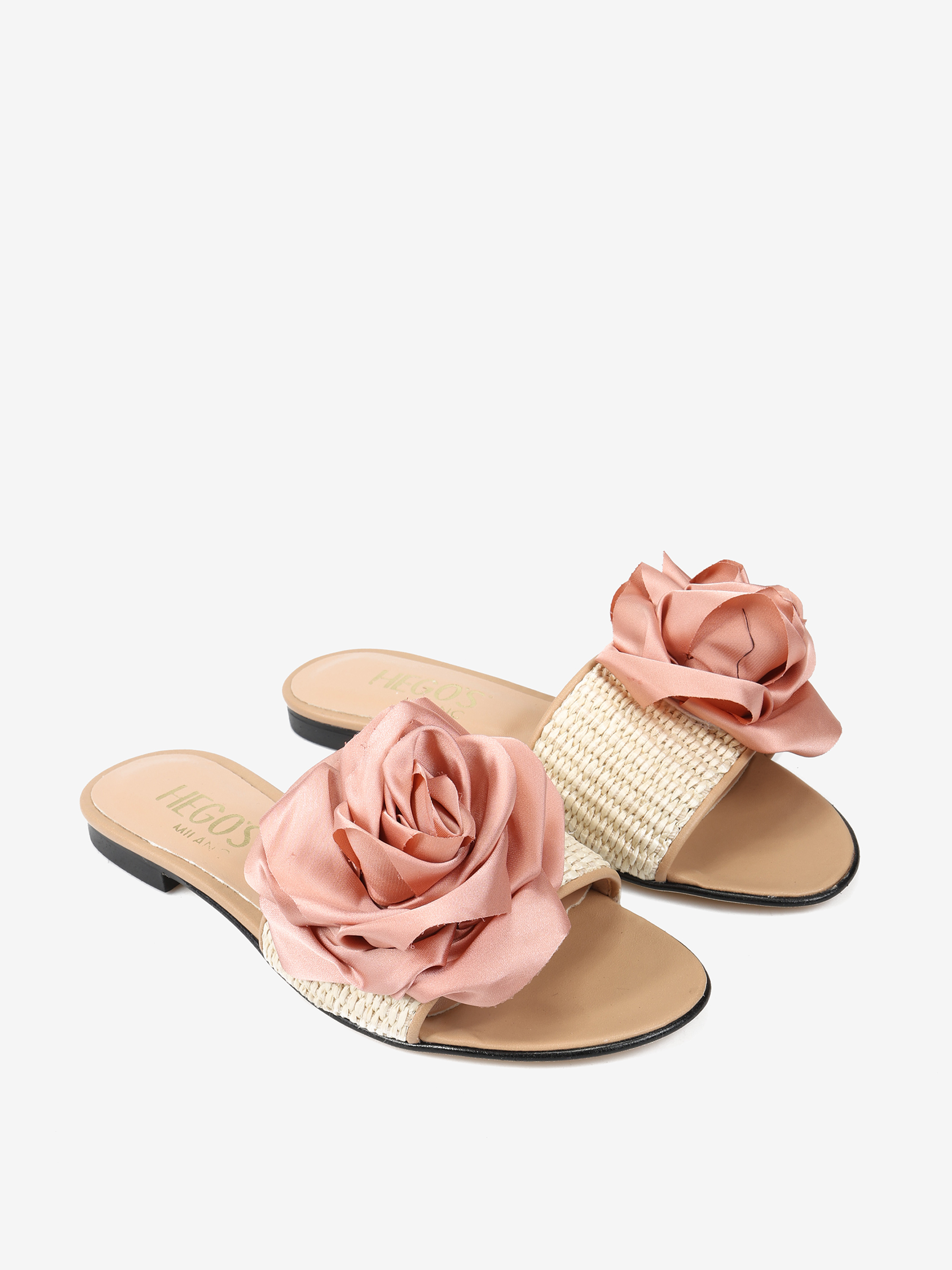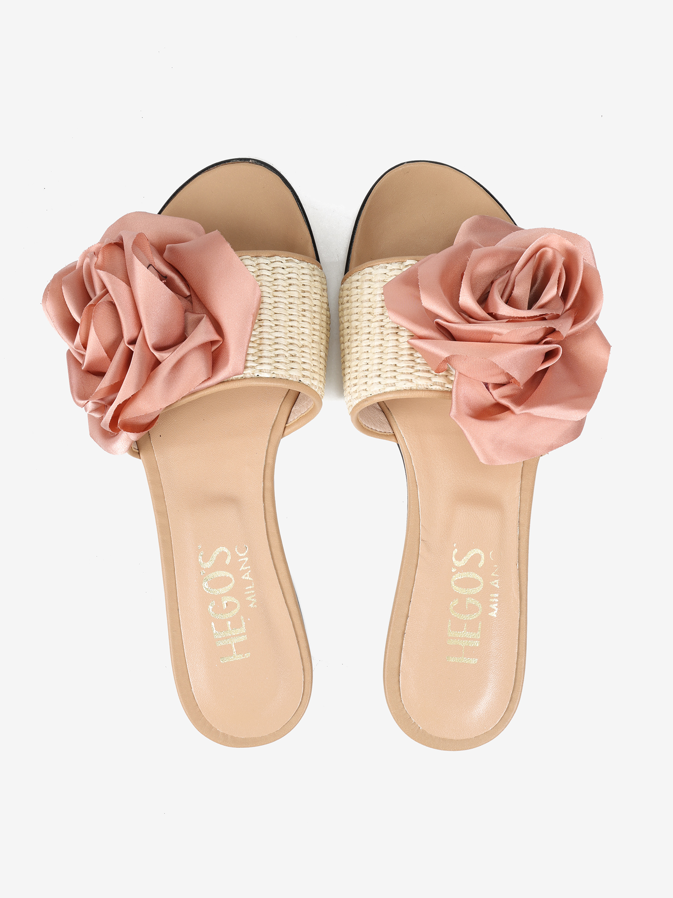 Klapki z rafii i skóry naturalnej z ozdobnym kwiatem.