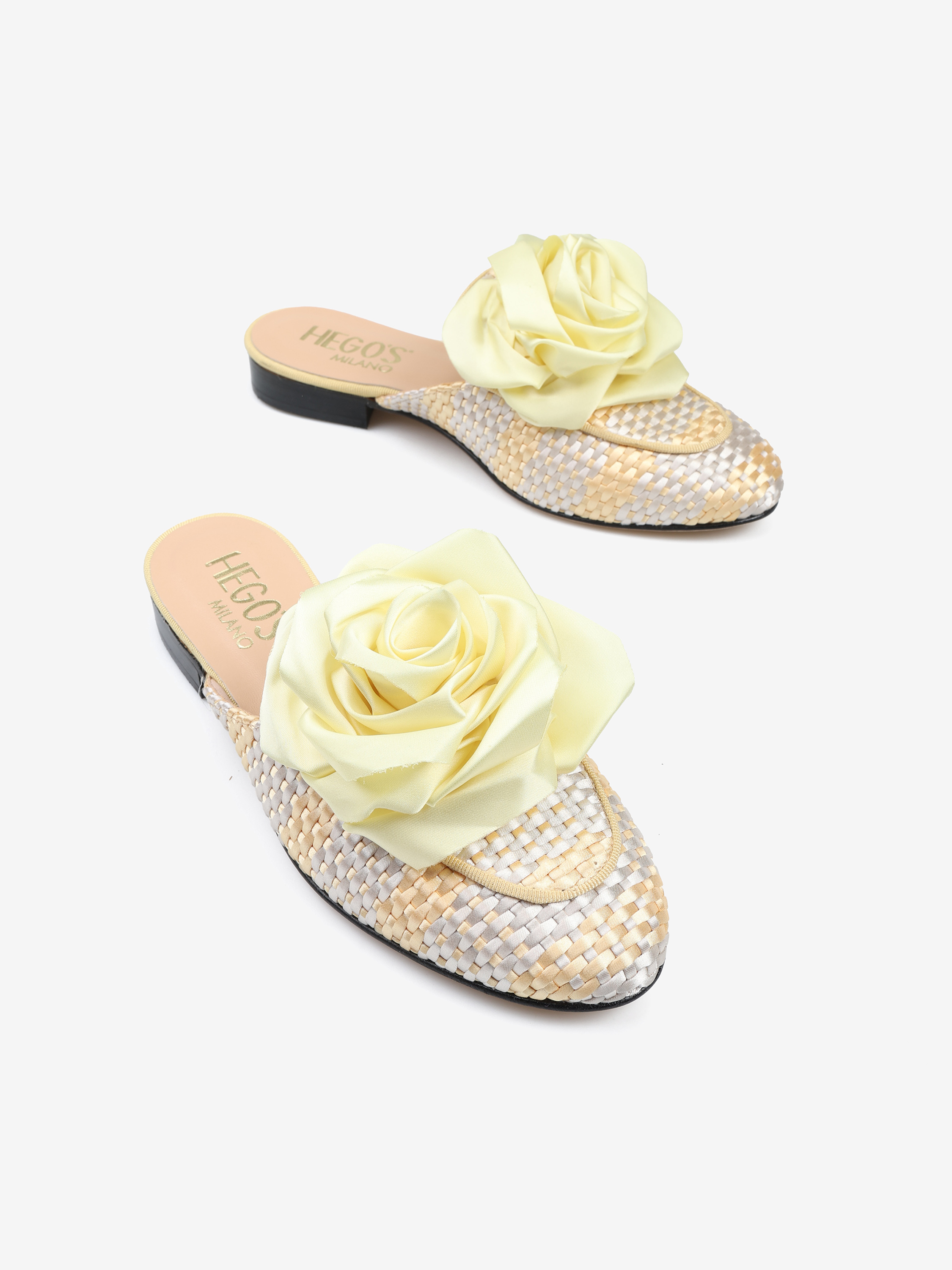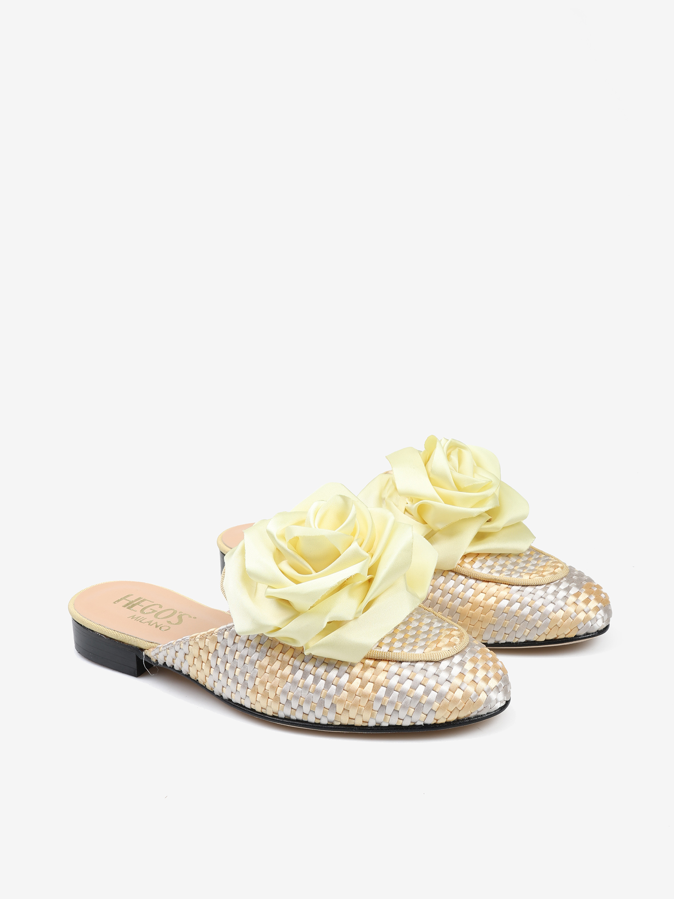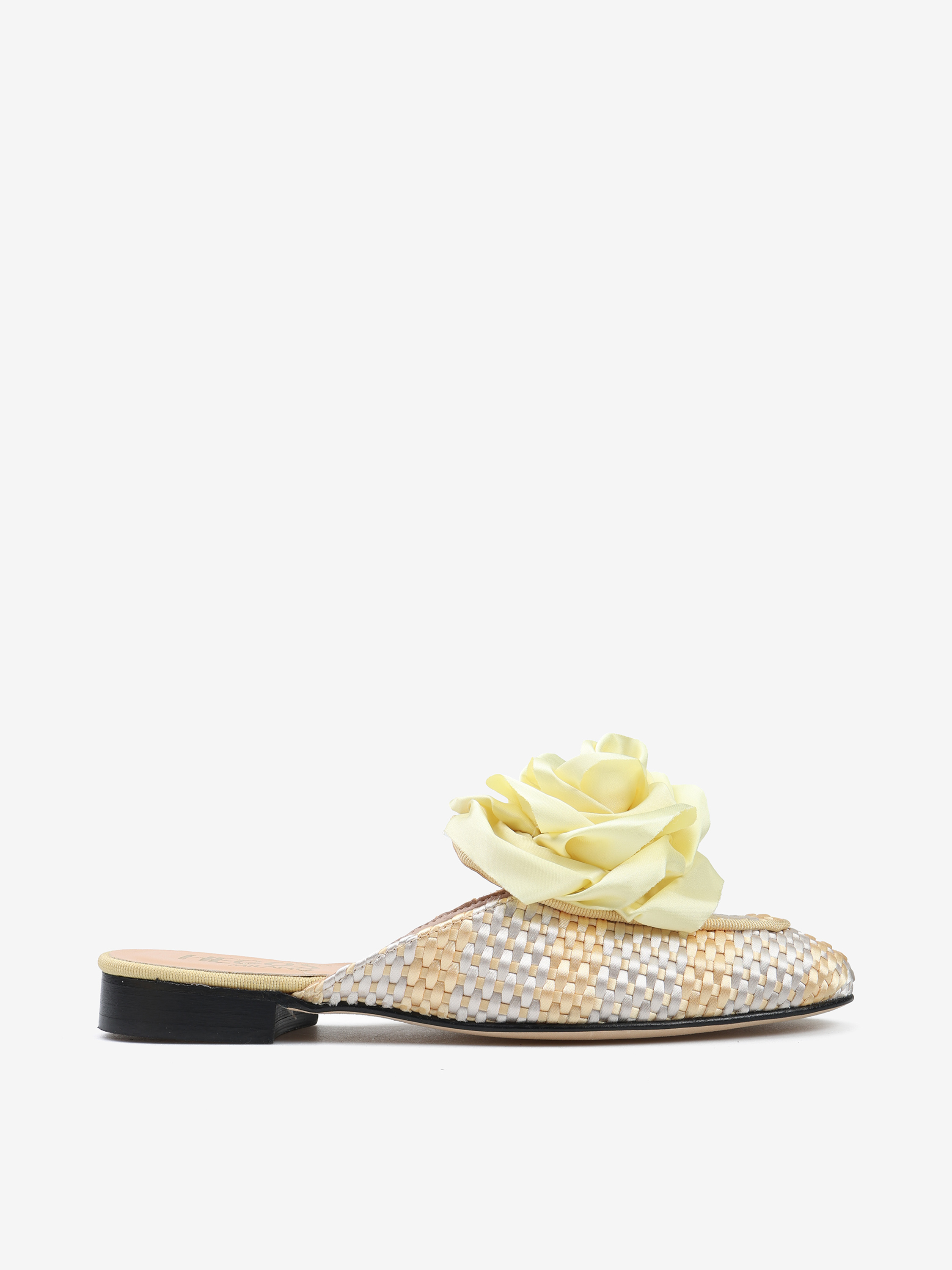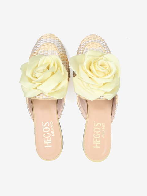 Mule z plecionego materiału z ozdobnym kwiatem.
