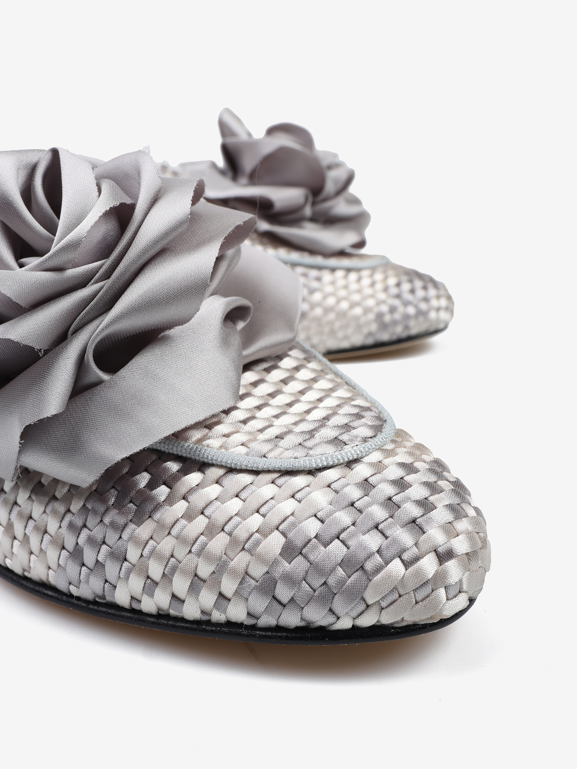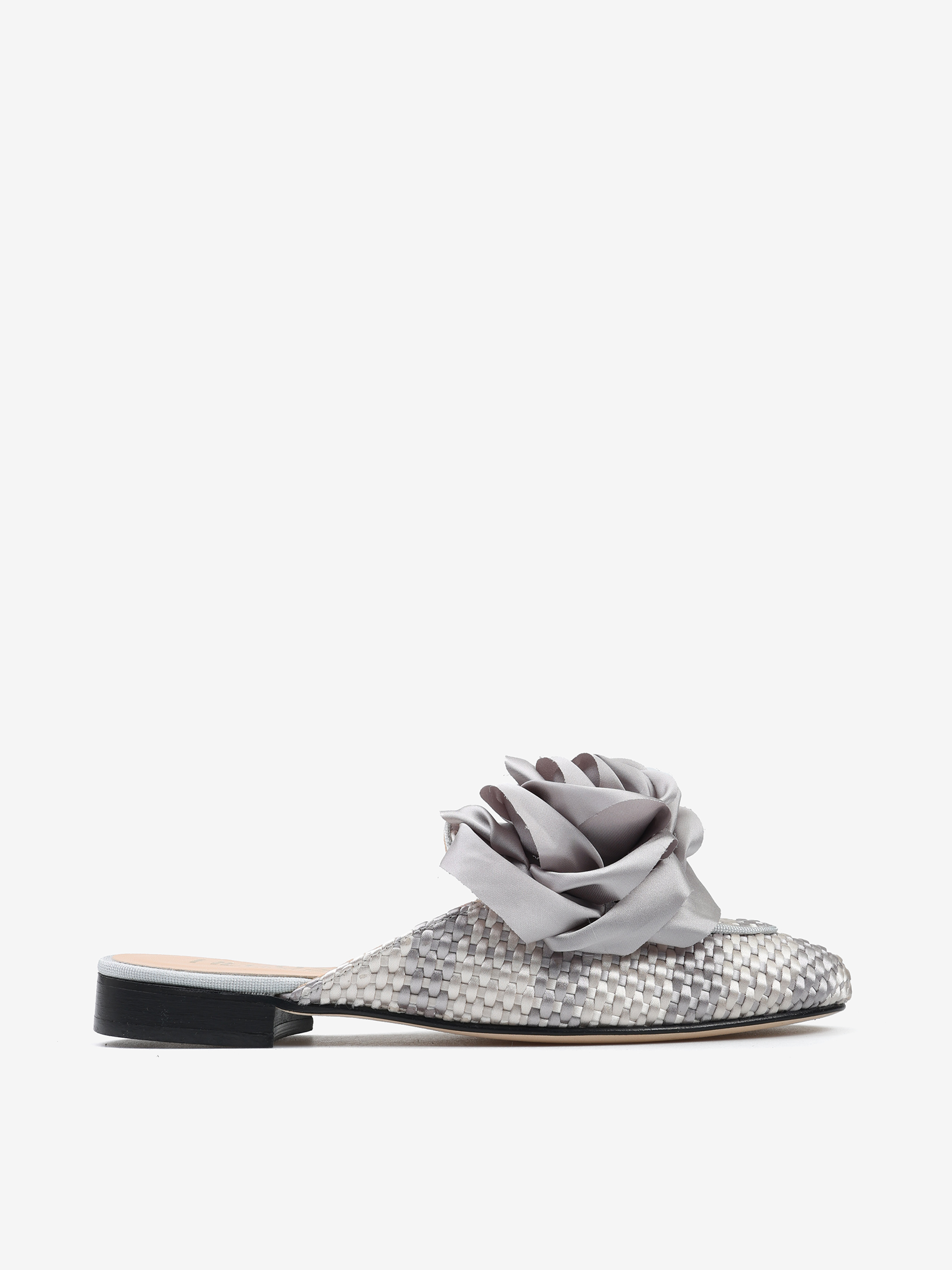 Mule z plecionego materiału z ozdobnym kwiatem.