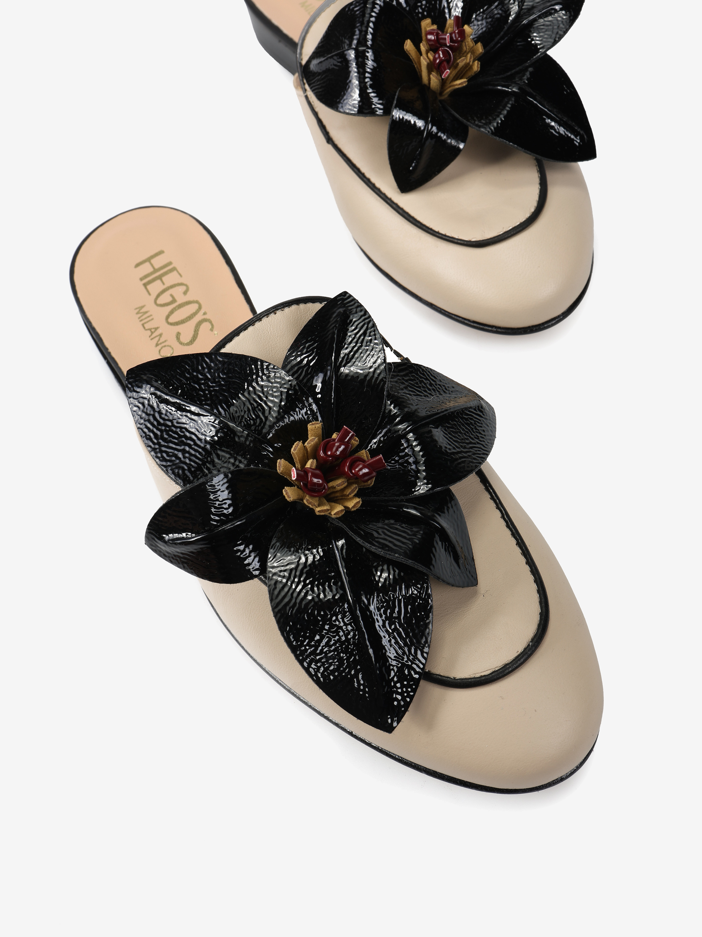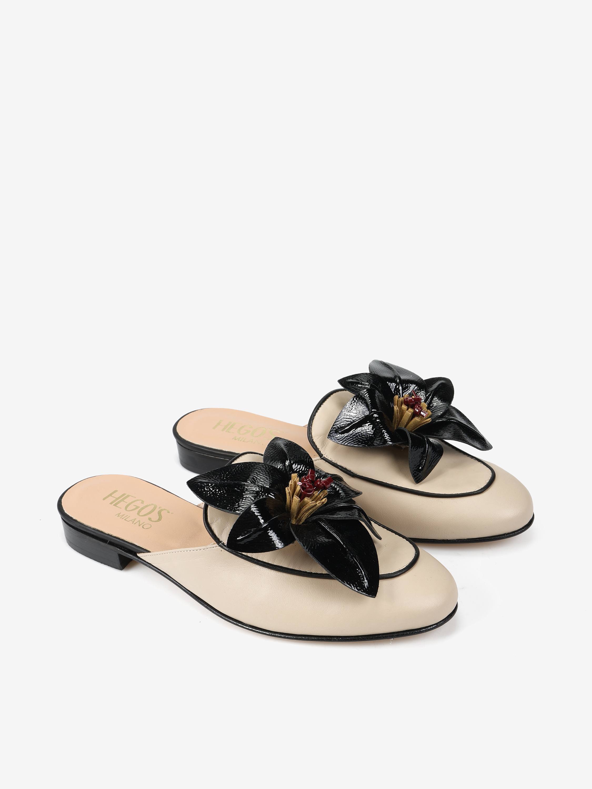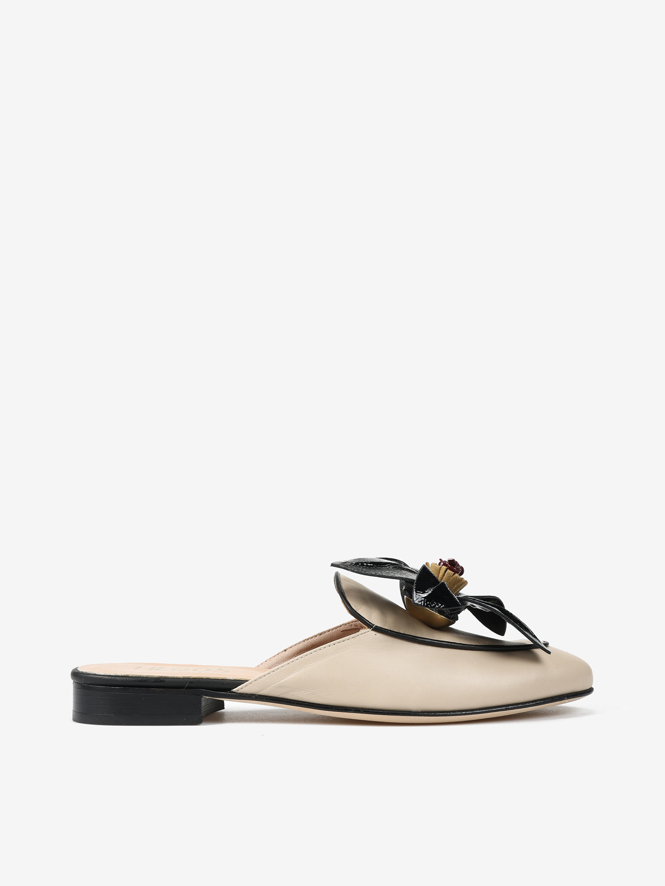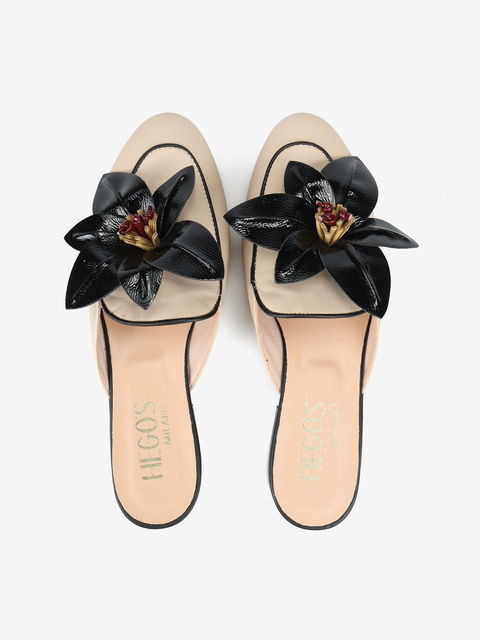 Miękkie mule ze skórzanymi przeszyciami i ozdobnym kwiatem.