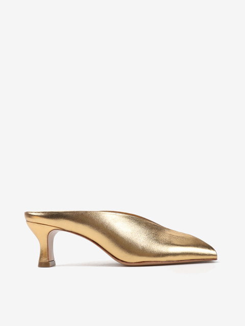 Metaliczne, skórzane klapki z kwadratowym noskiem i głębokim wycięciem w szpic.