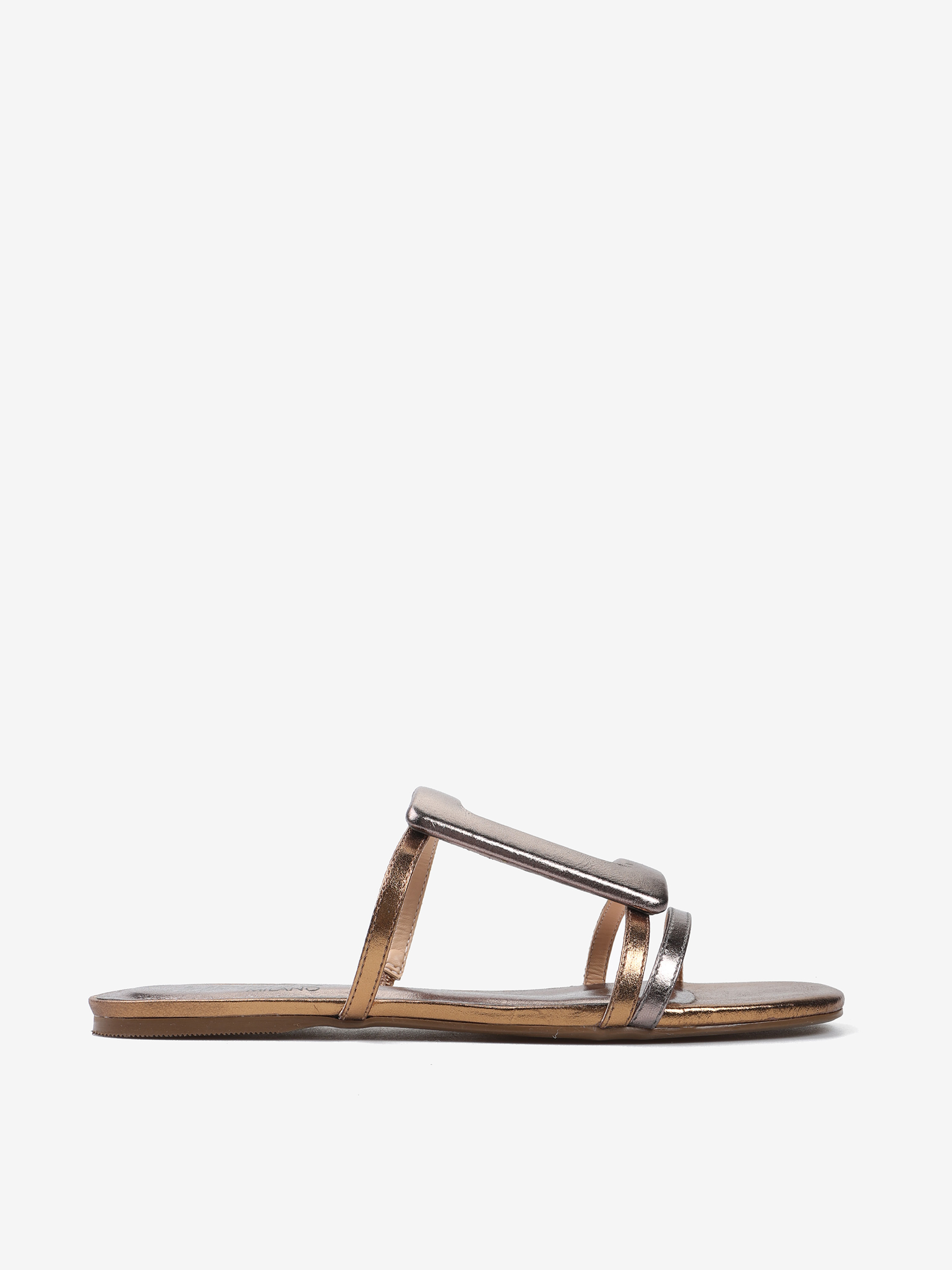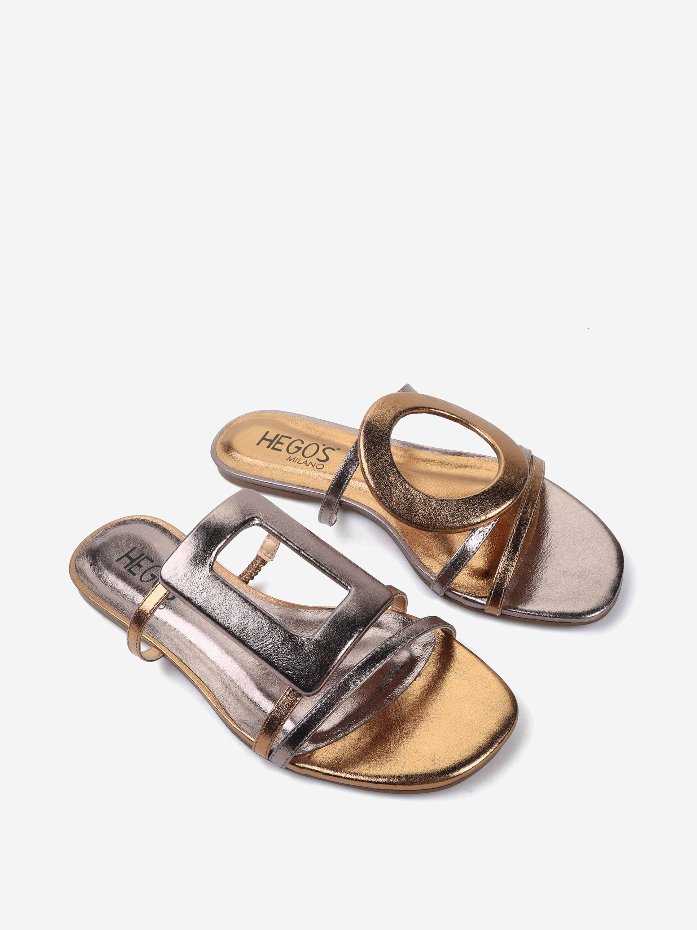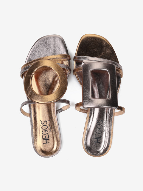 Metaliczne, skórzane klapki z geometrycznymi aplikacjami w kontrastujących kolorach.