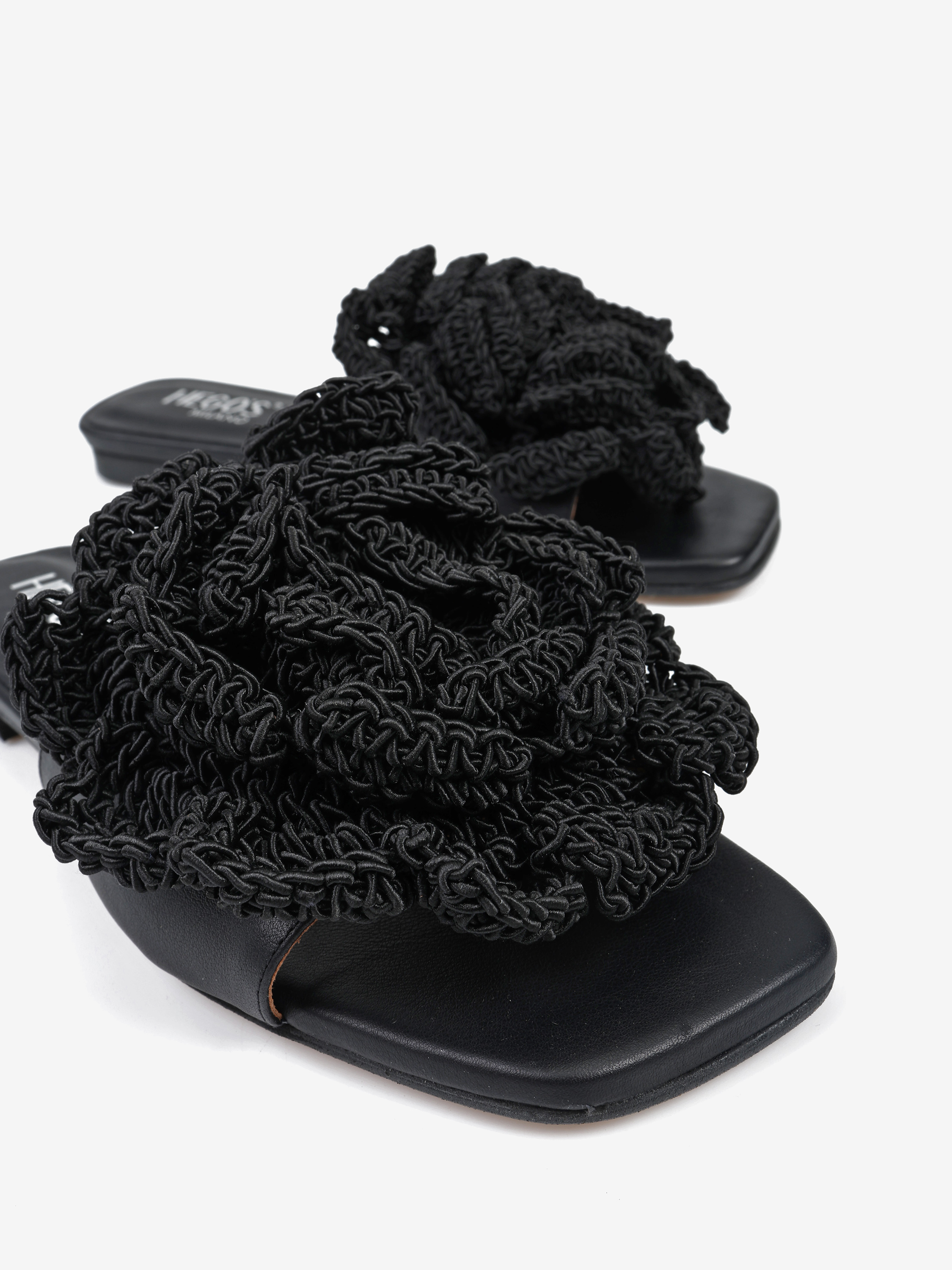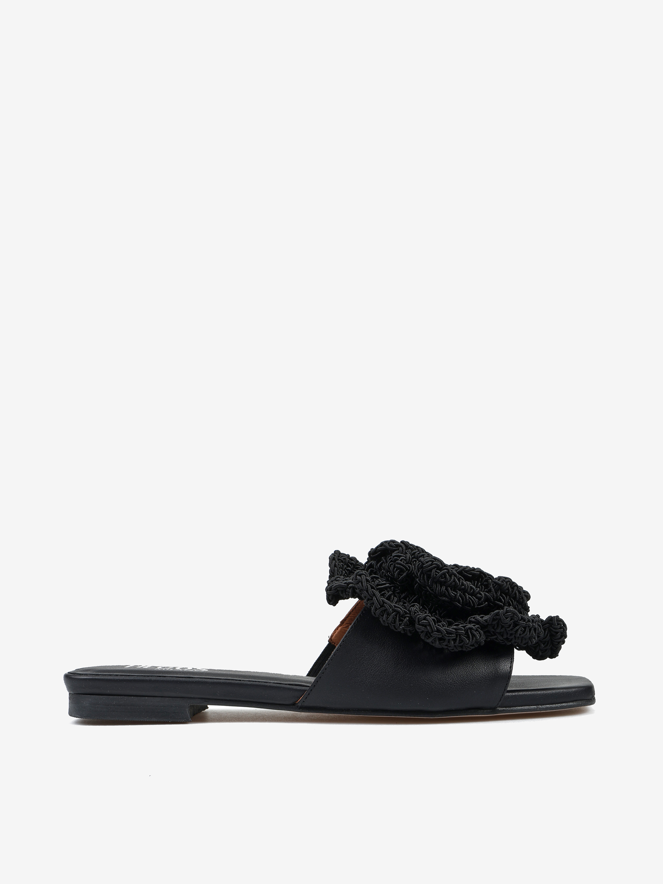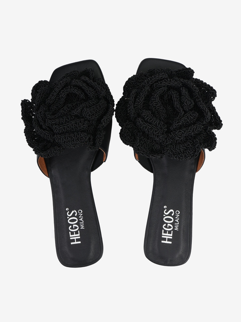 Skórzane klapki na płaskiej podeszwie z trójwymiarowym, szydełkowym kwiatem.