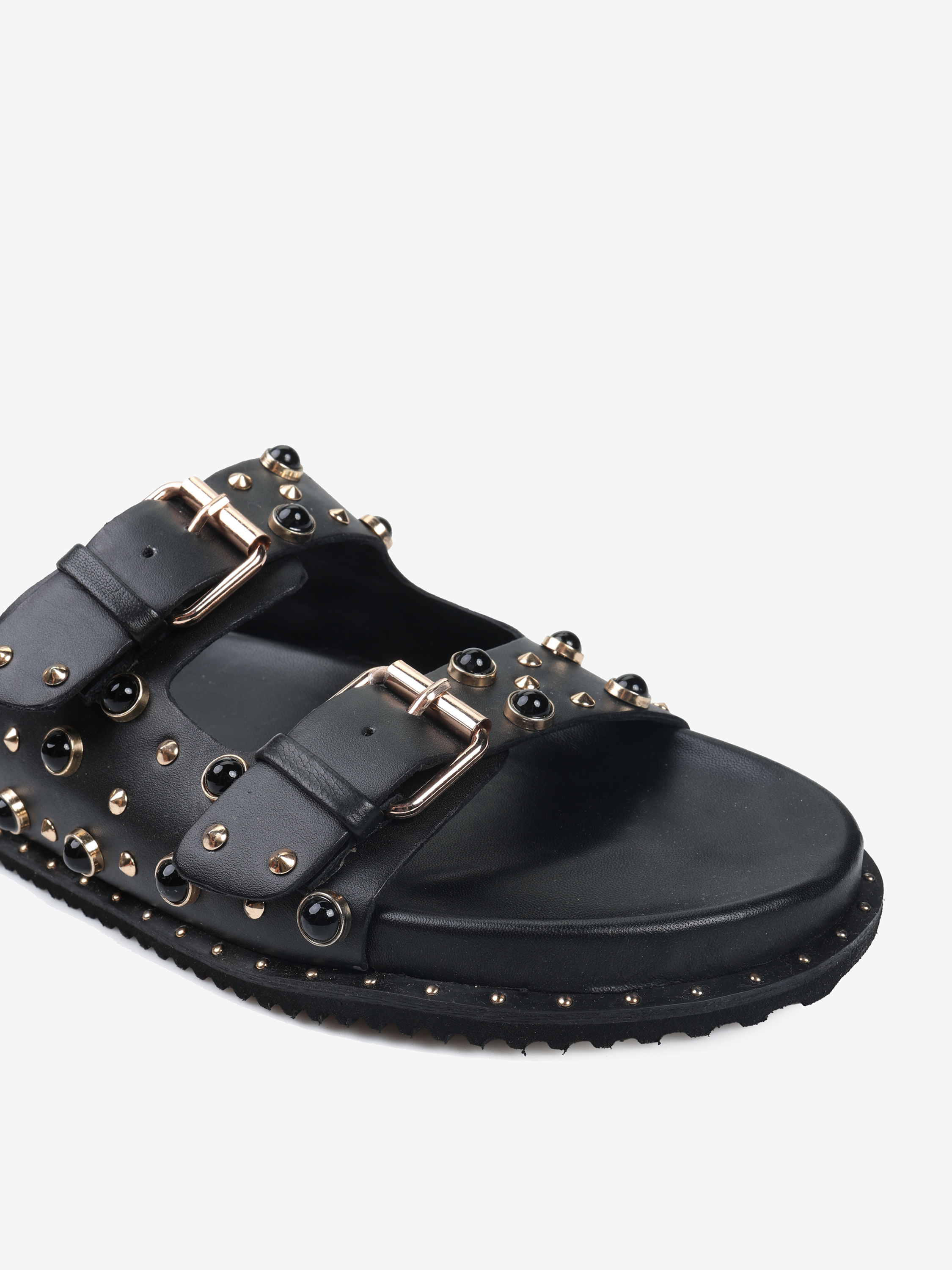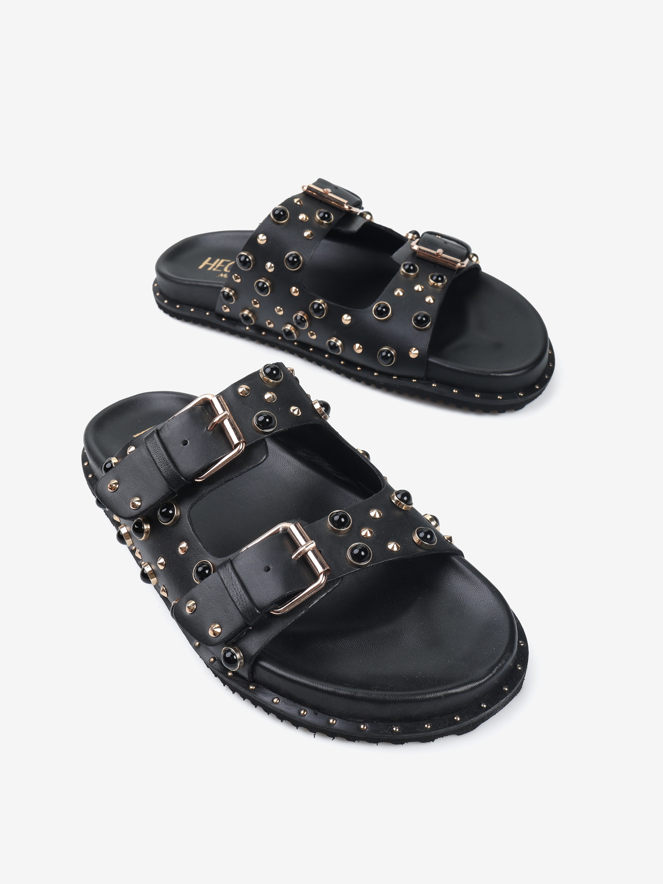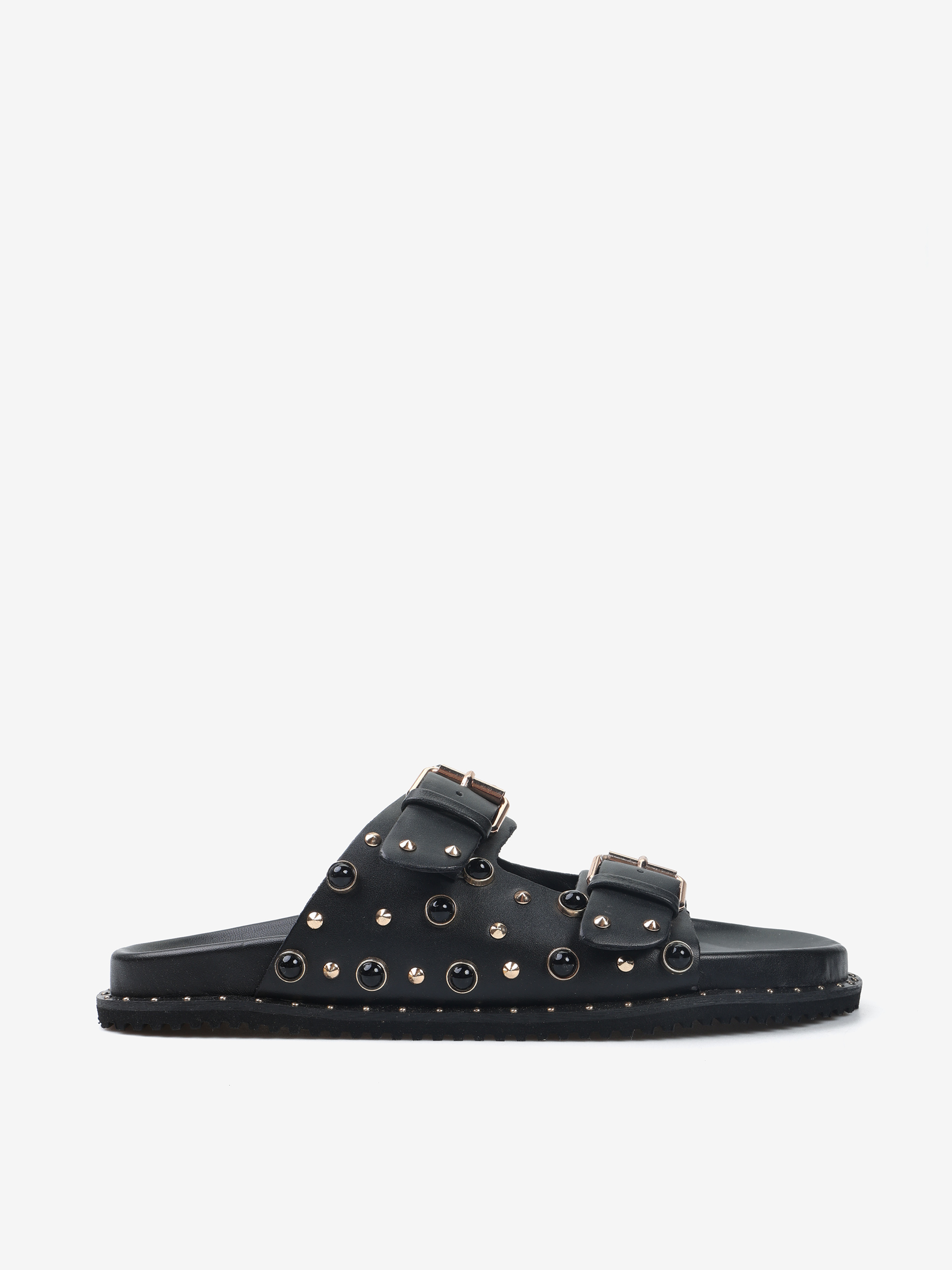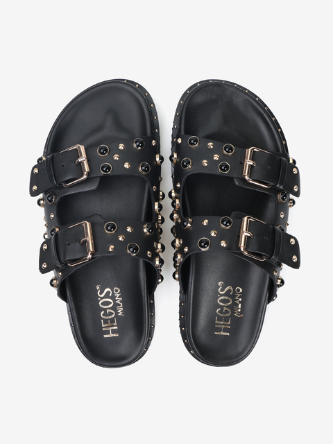 Klapki z ćwiekami wykonane z miękkiej, delikatnej skóry. Regulowane paski.