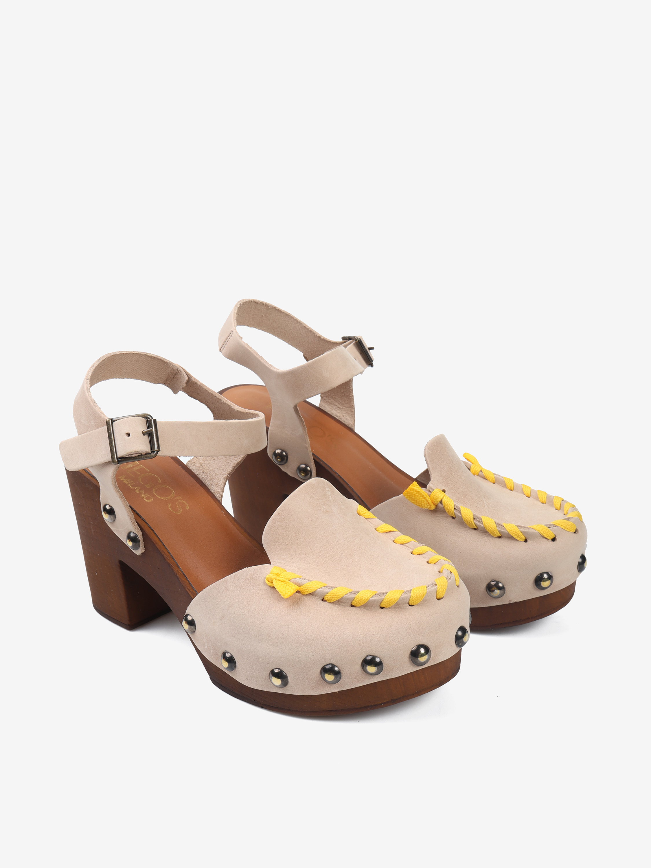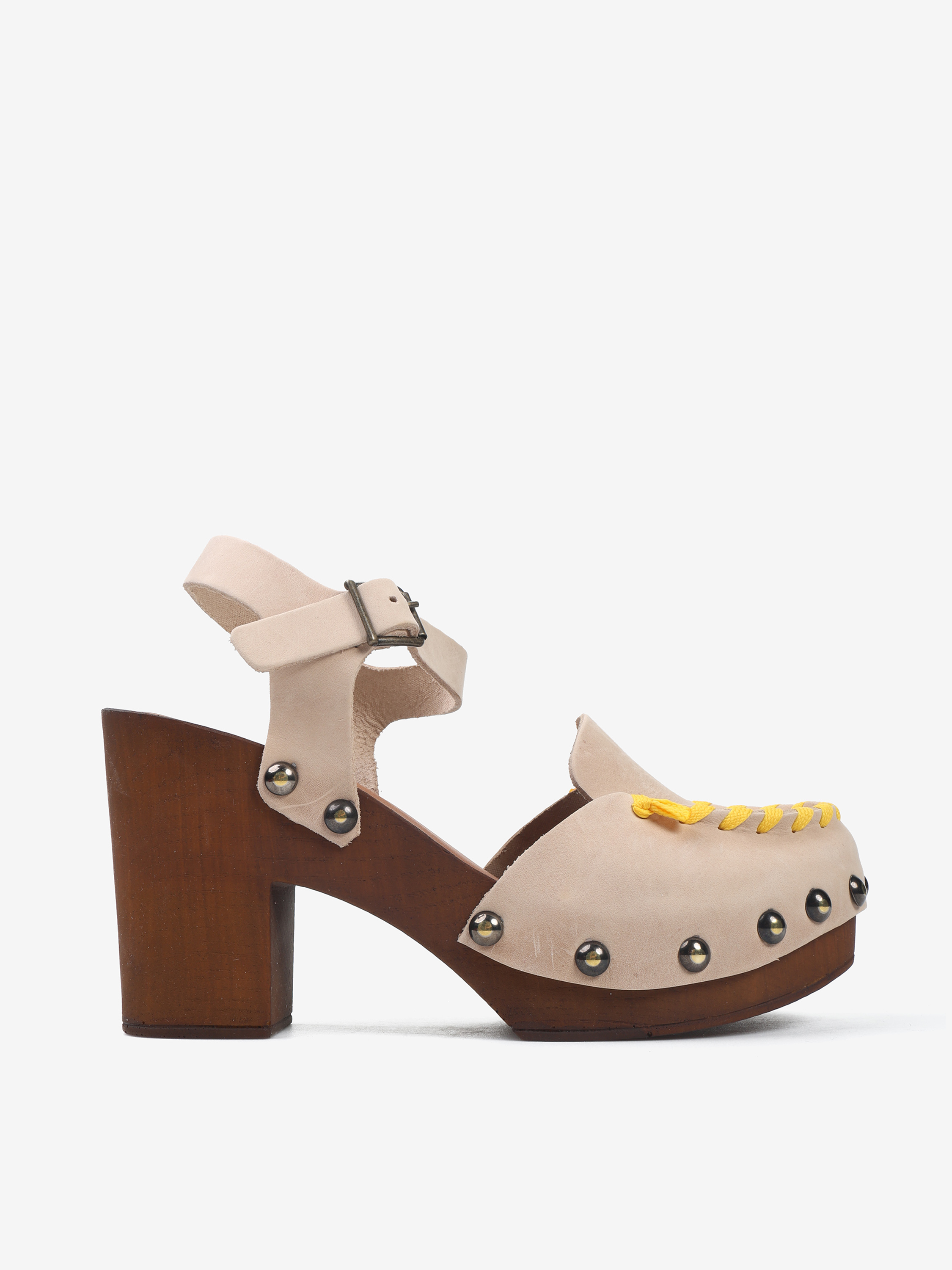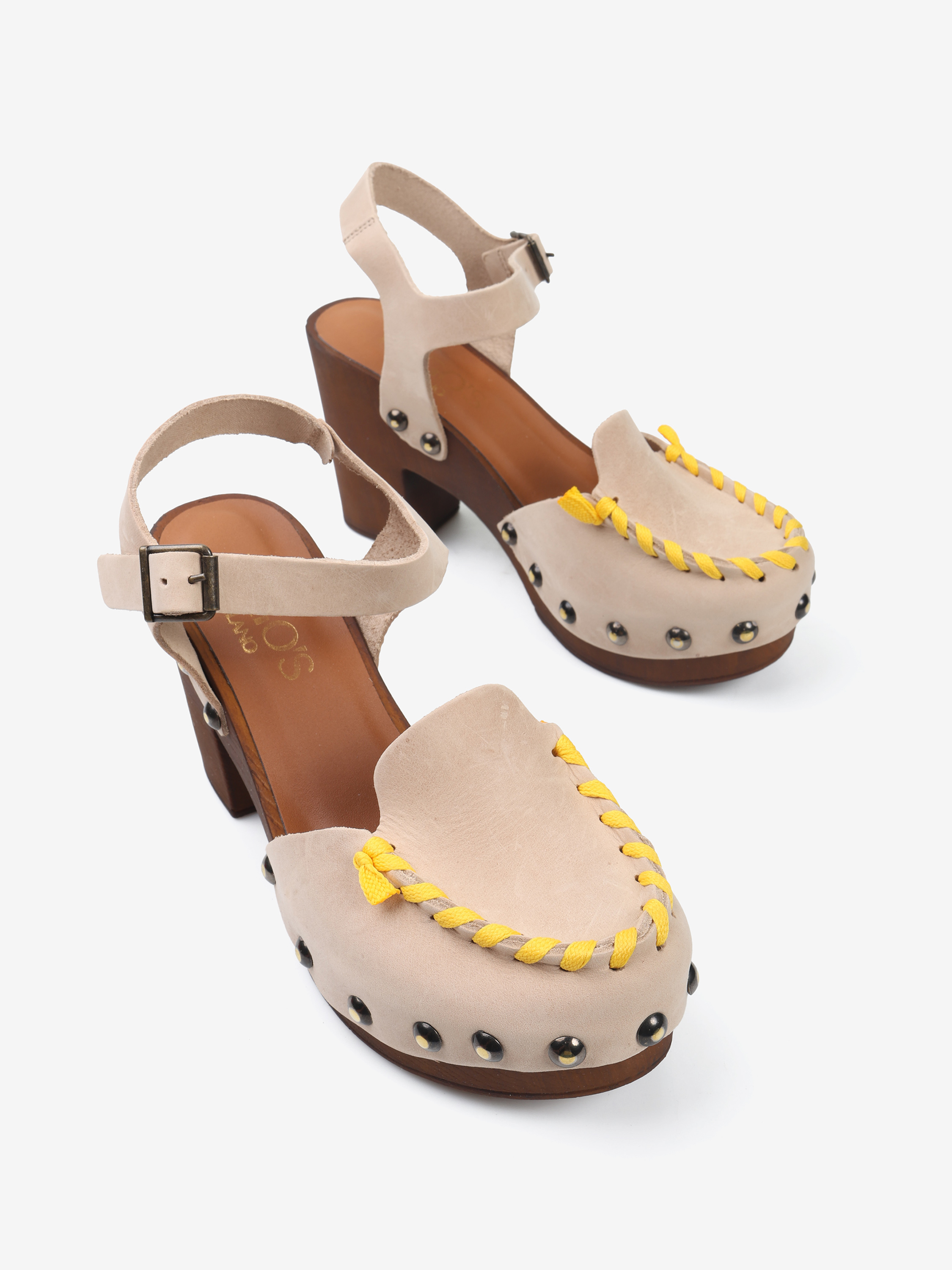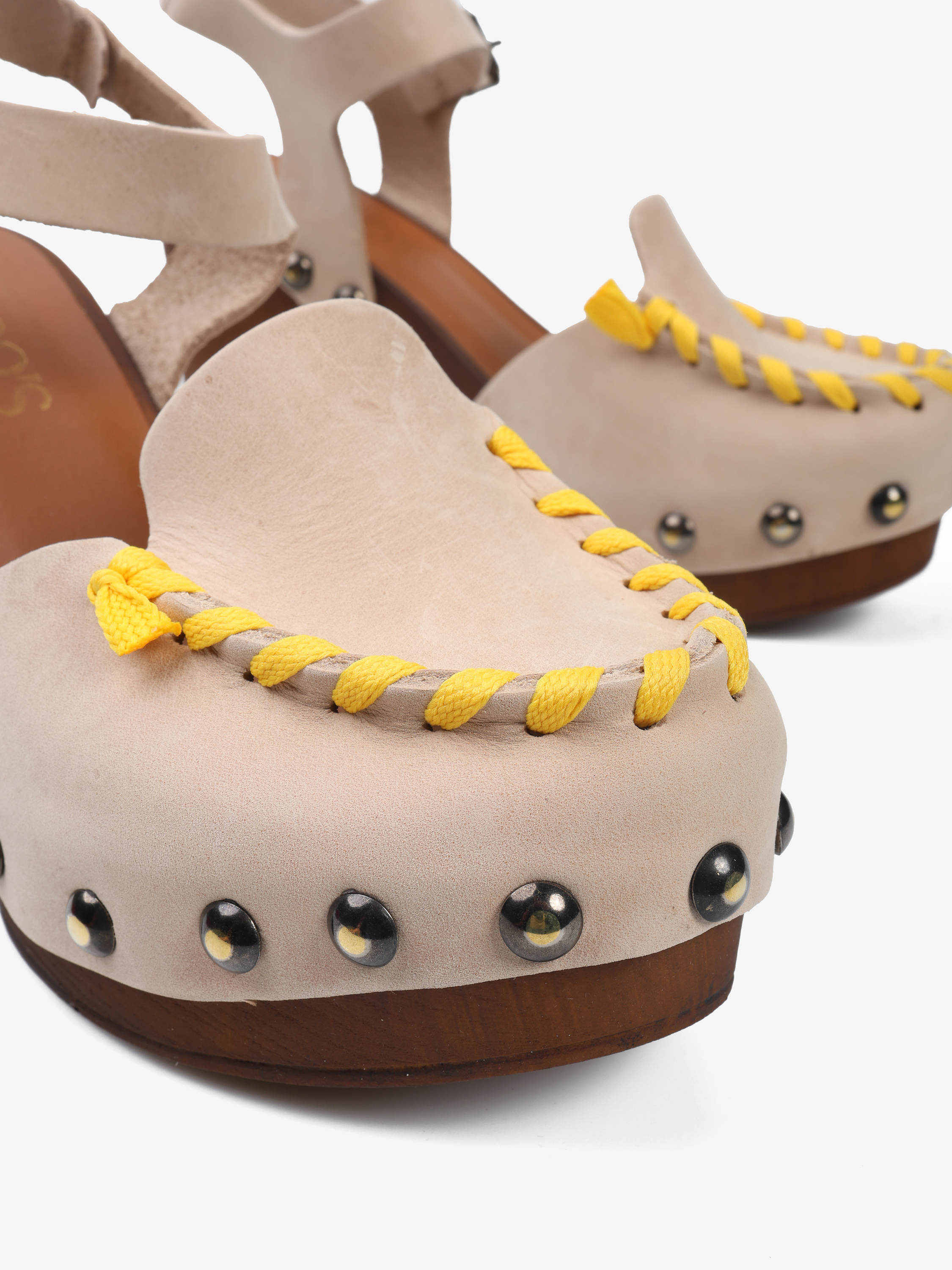 Zamszowe sandały w stylu chodaków. Ozdobne ćwieki i widoczny szew w kontrastującym kolorze.