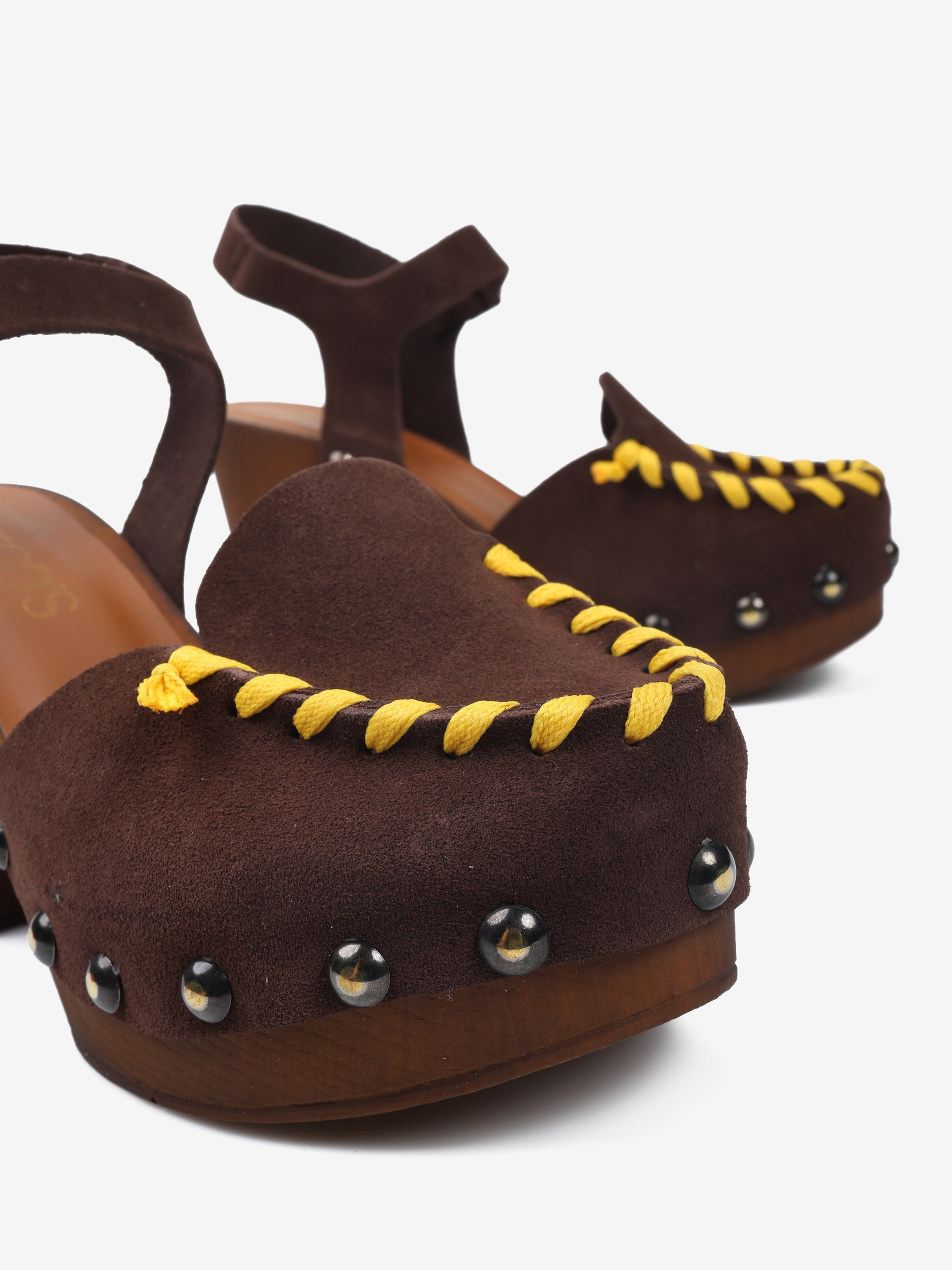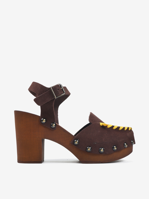 Zamszowe sandały w stylu chodaków. Ozdobne ćwieki i widoczny szew w kontrastującym kolorze.