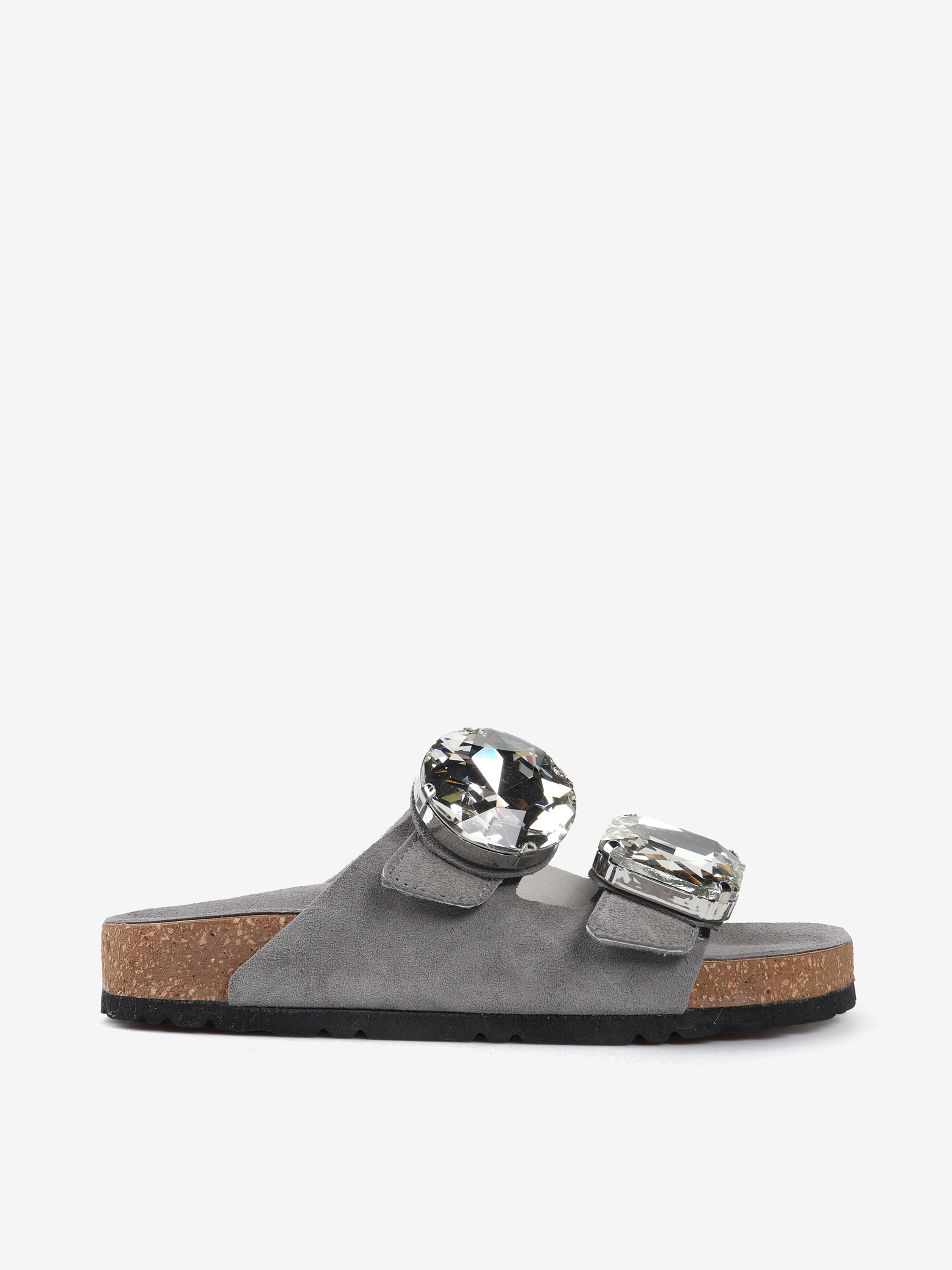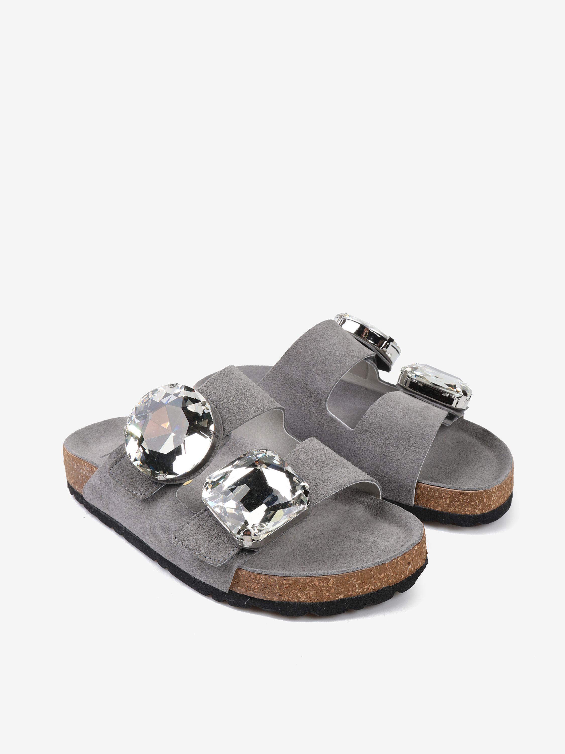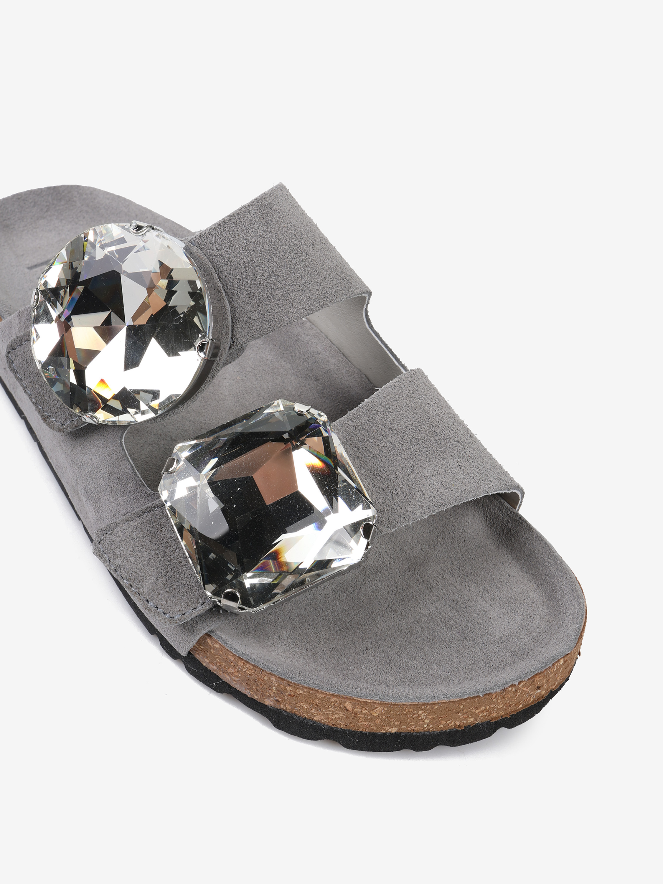 Zamszowe klapki z ozdobnymi kamieniami i paskami zapinanymi na rzep.
