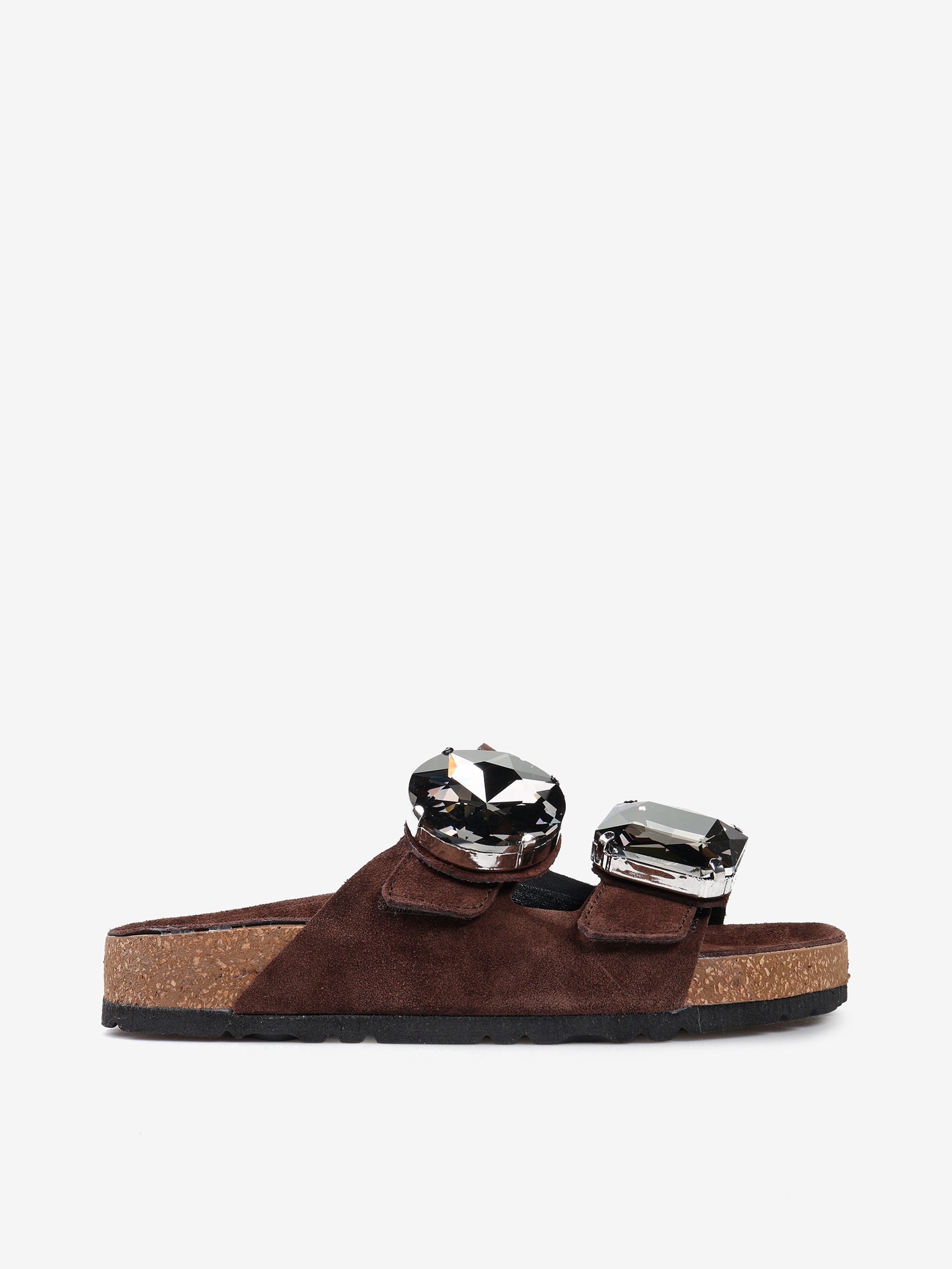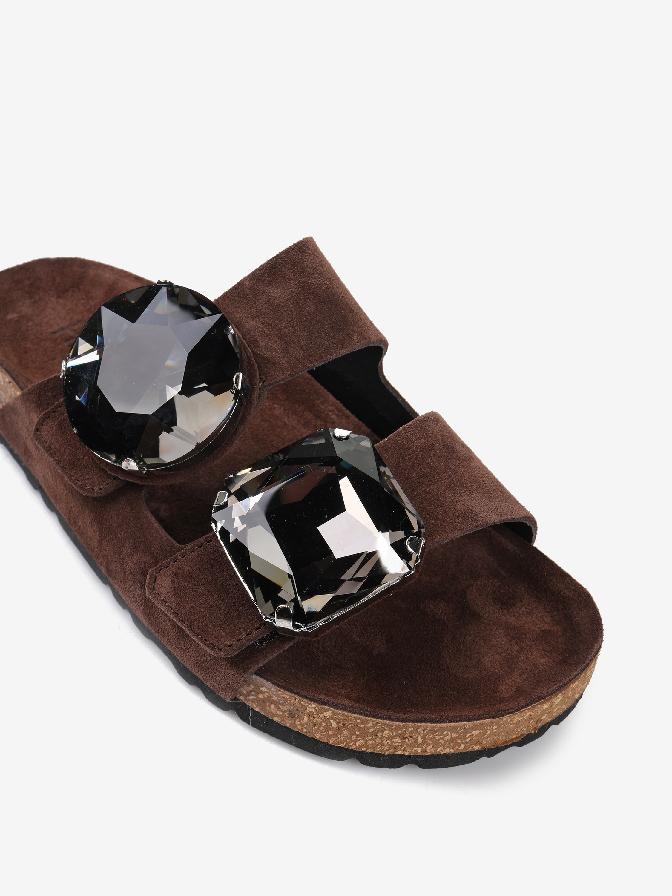 Zamszowe klapki z ozdobnymi kamieniami i paskami zapinanymi na rzep.