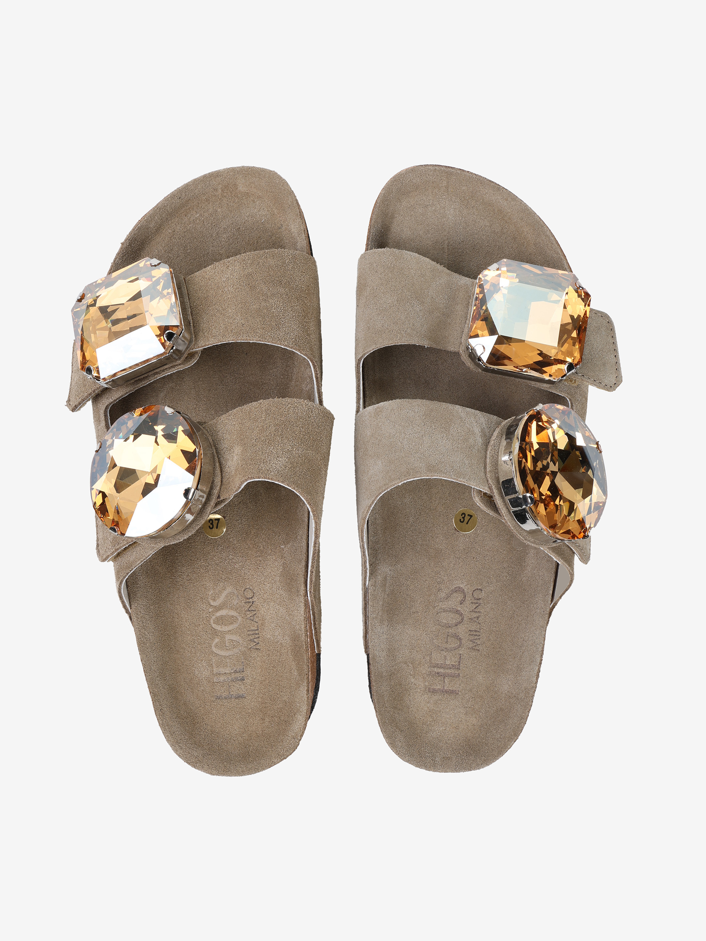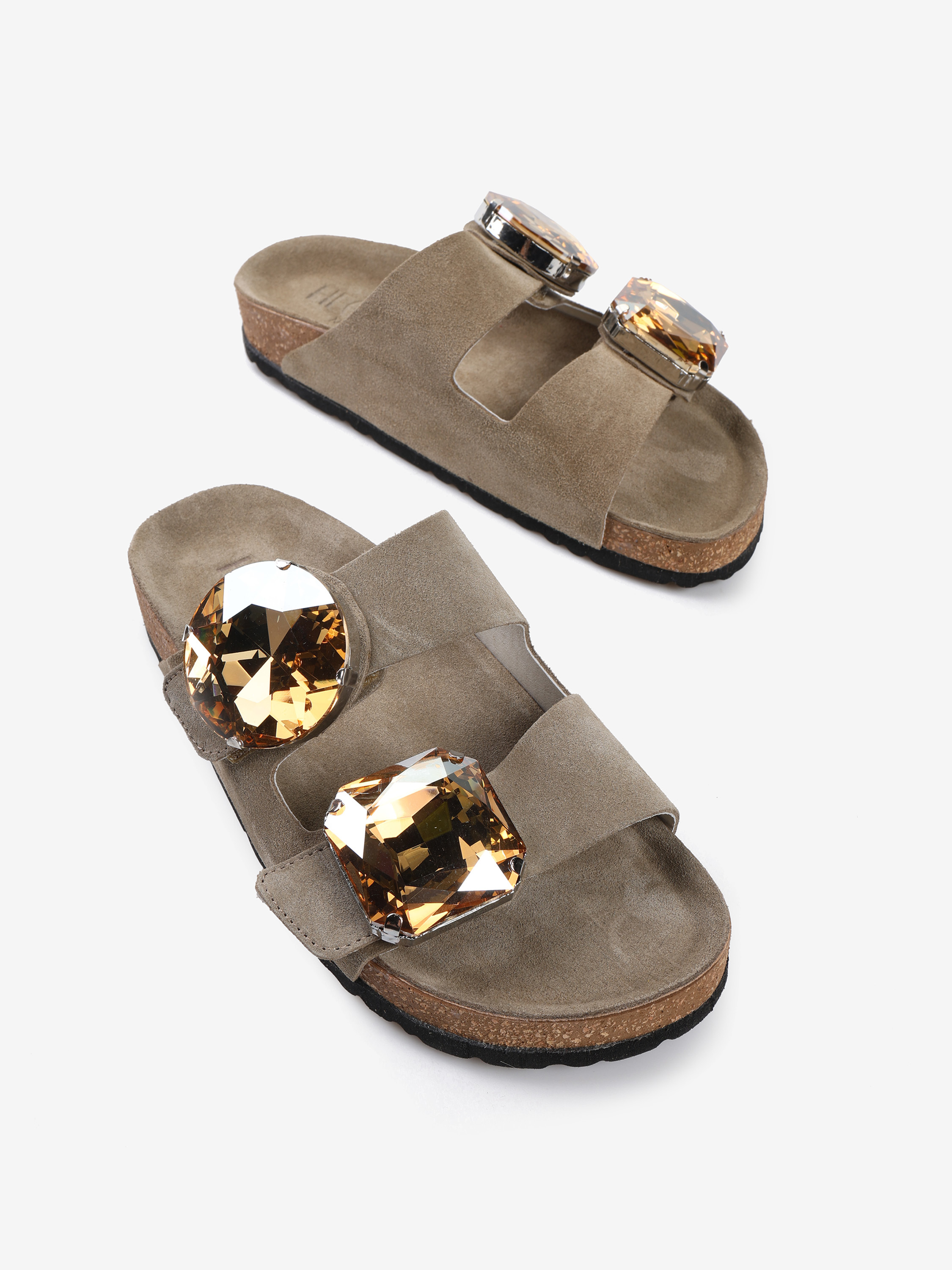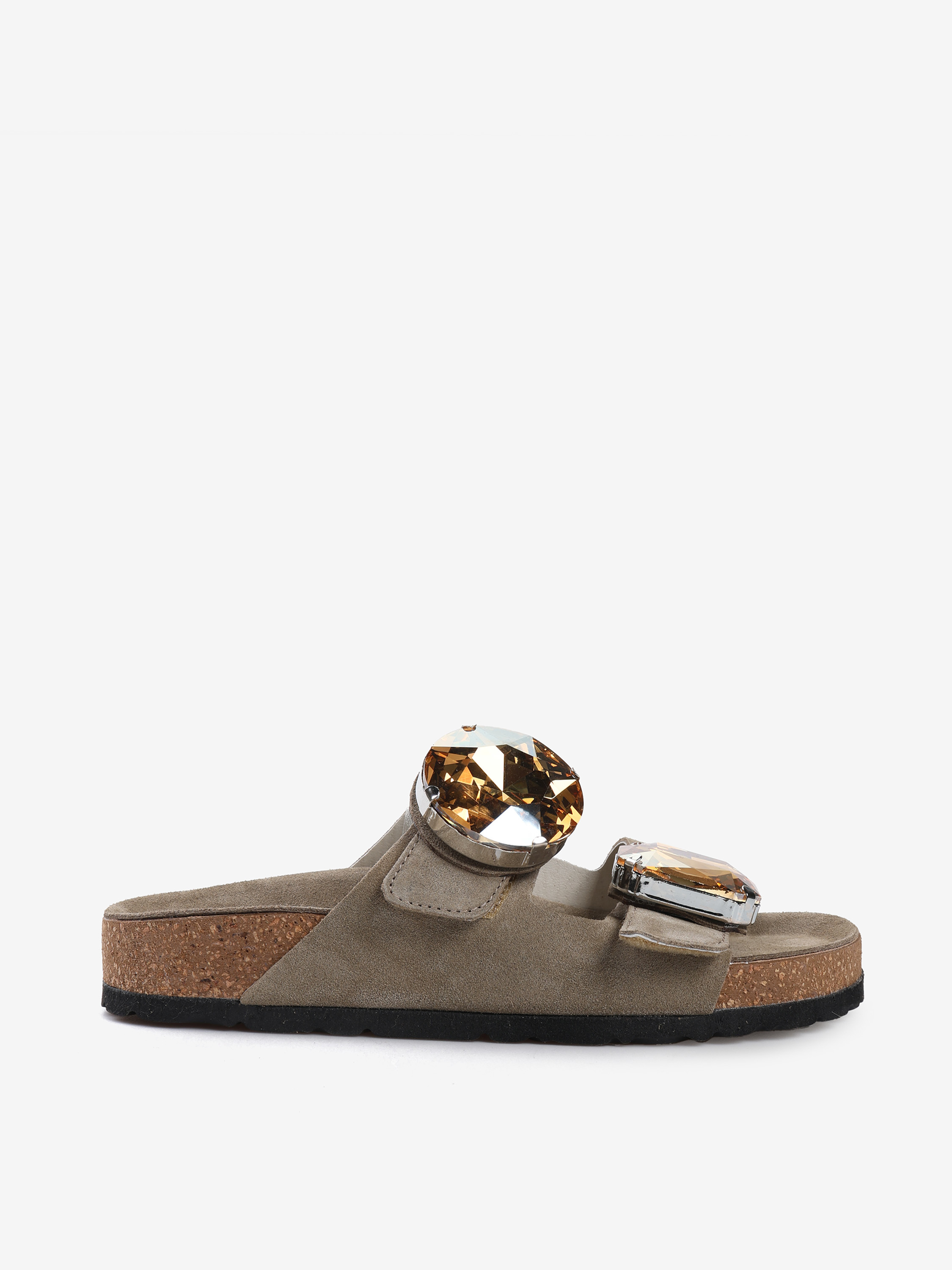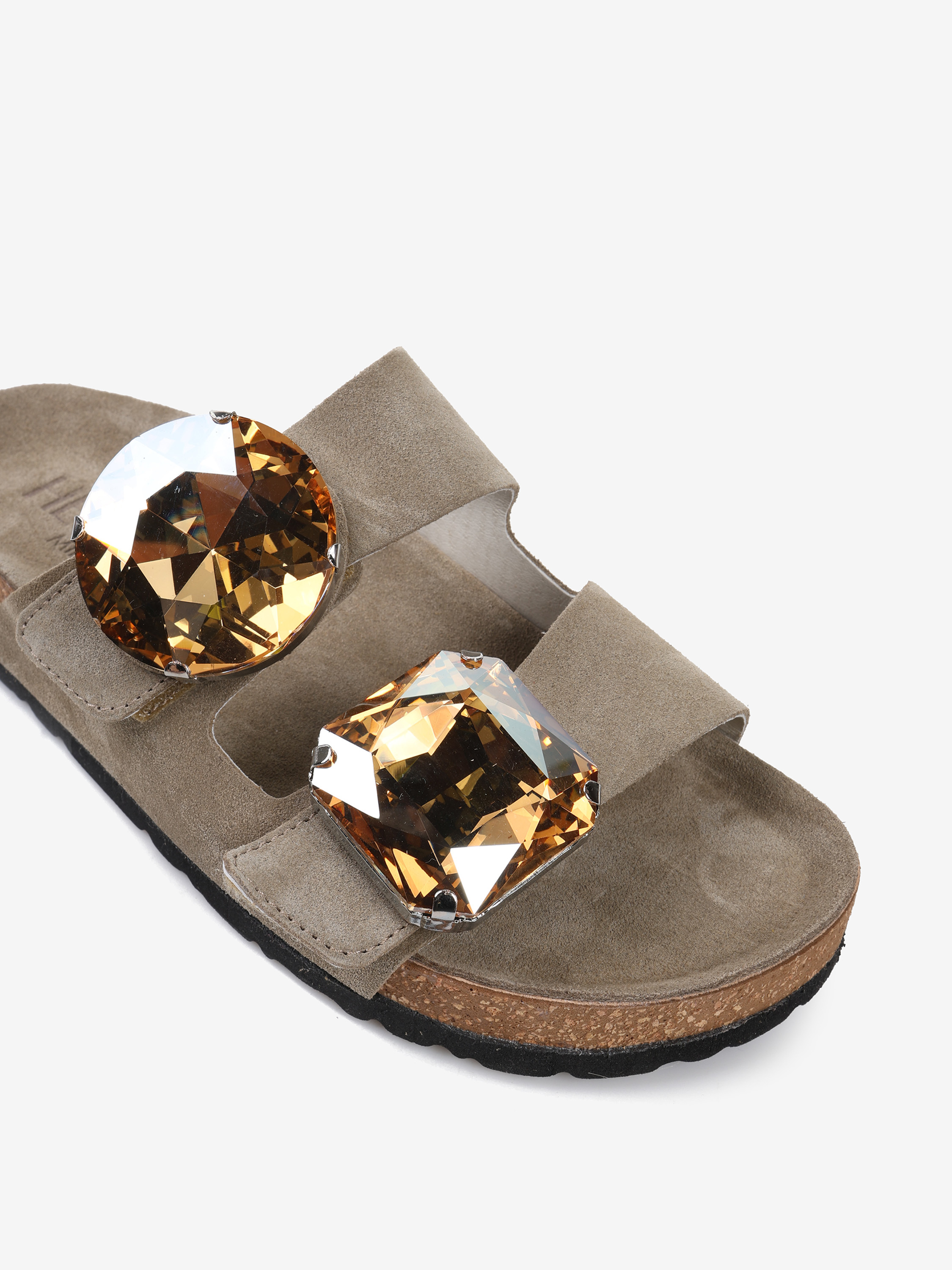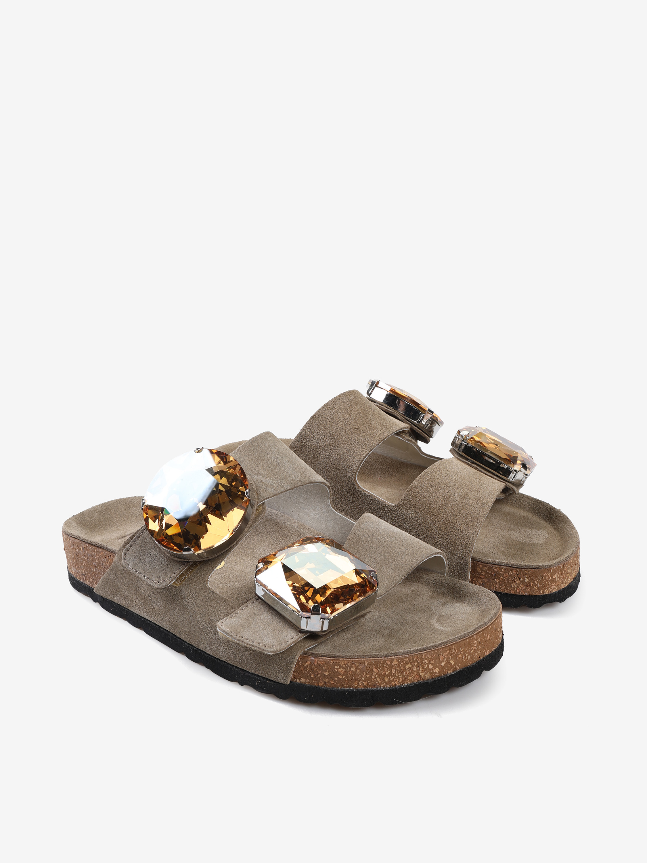 Zamszowe klapki z ozdobnymi kamieniami i paskami zapinanymi na rzep.
