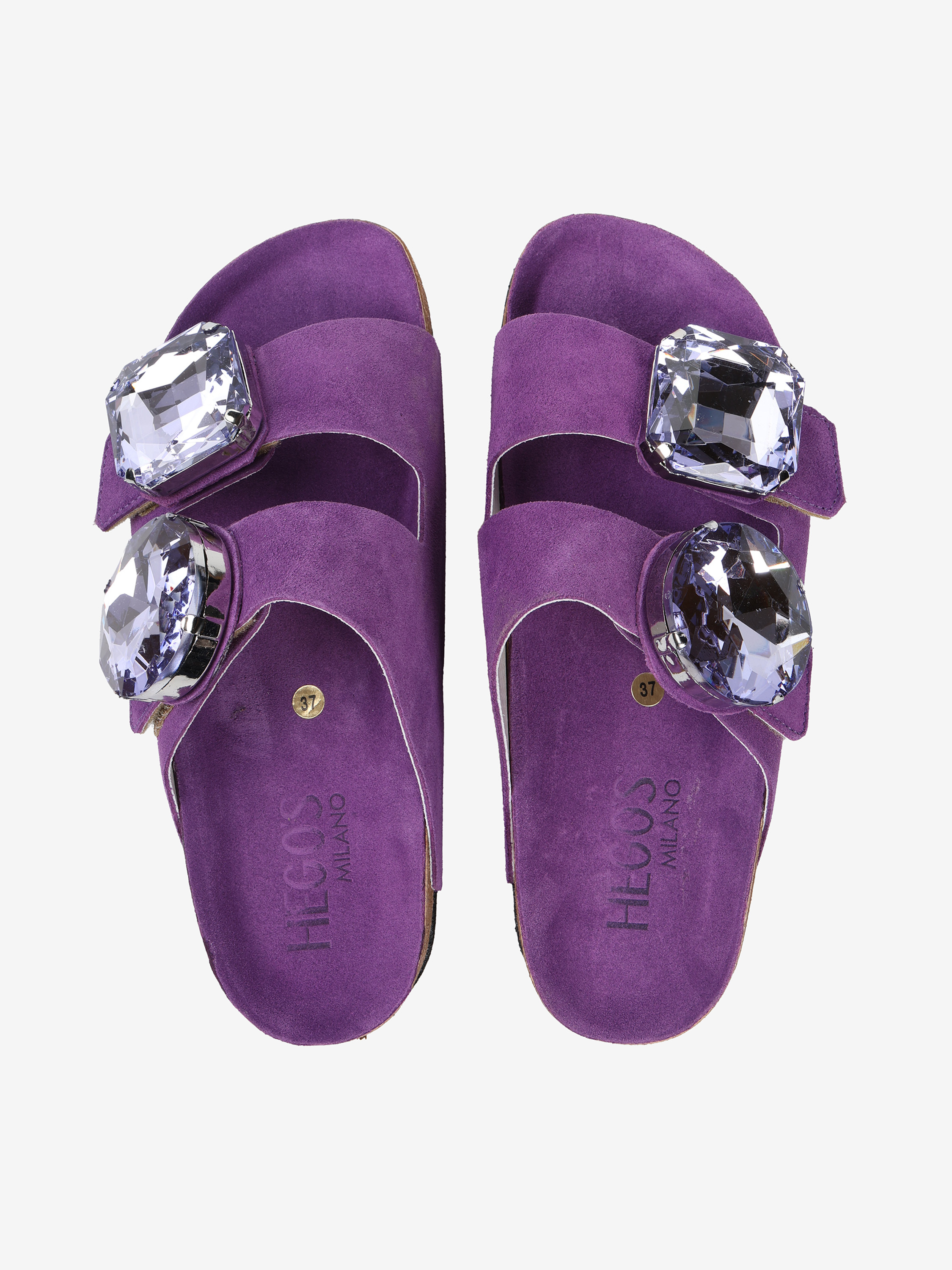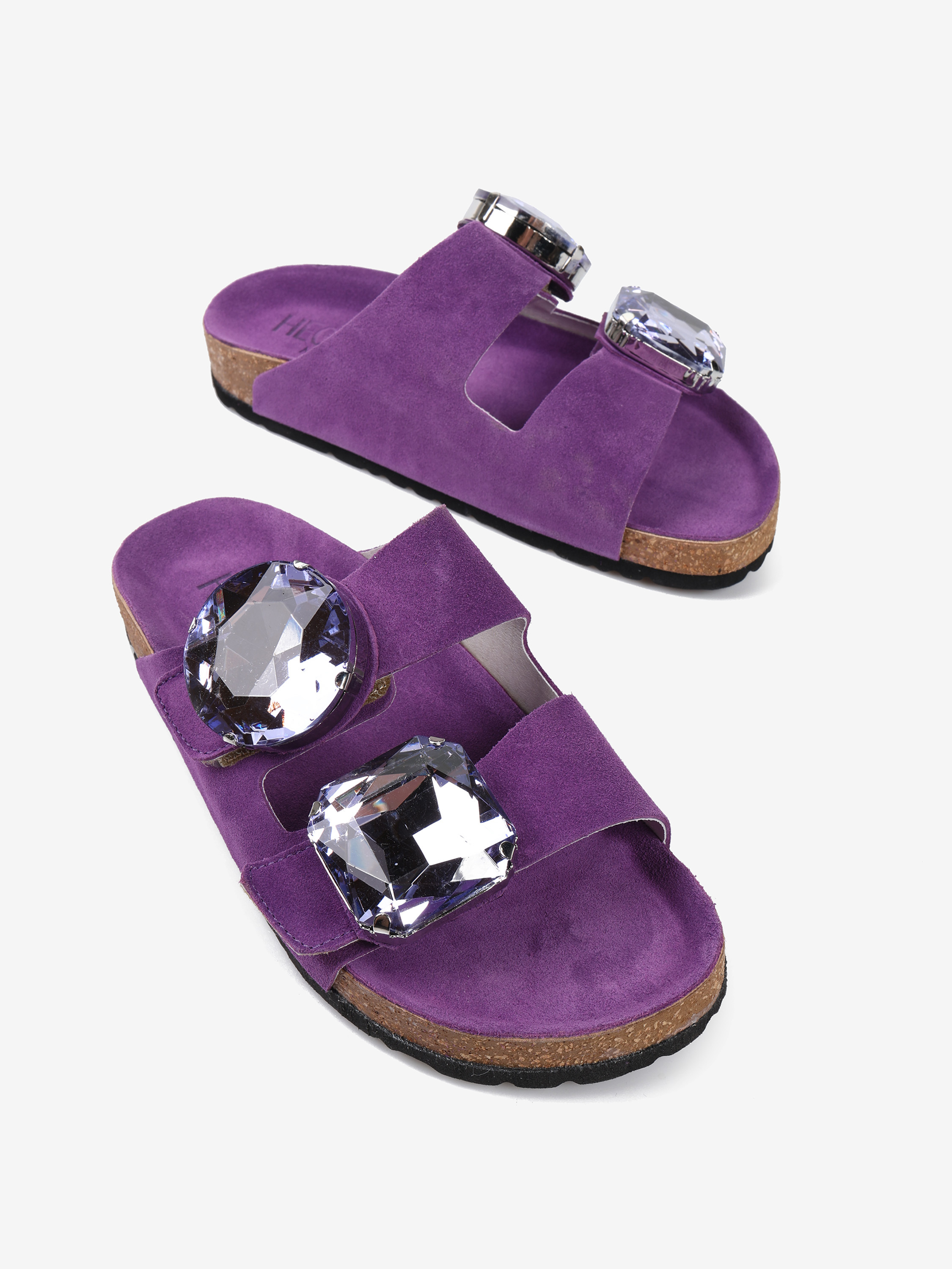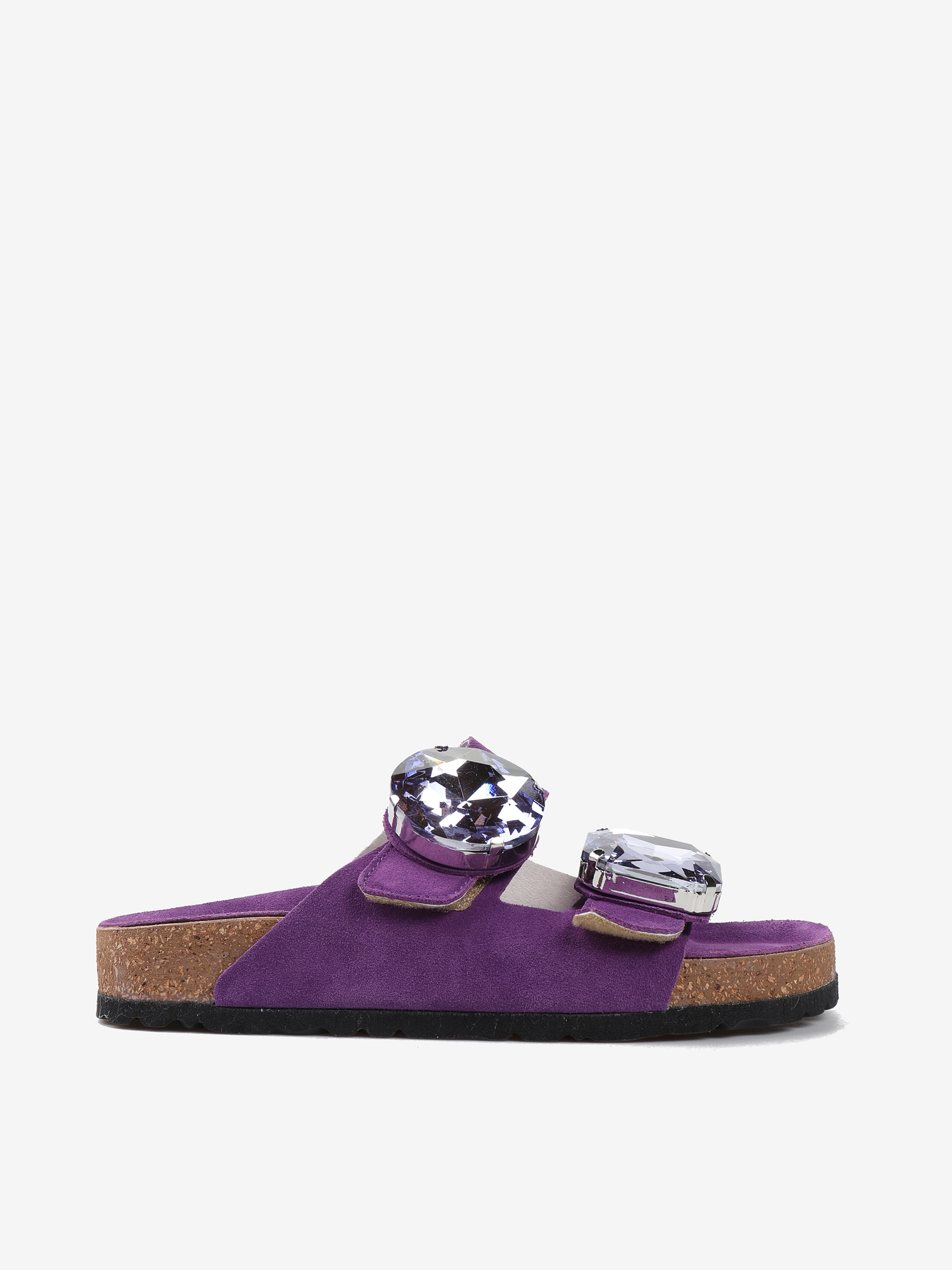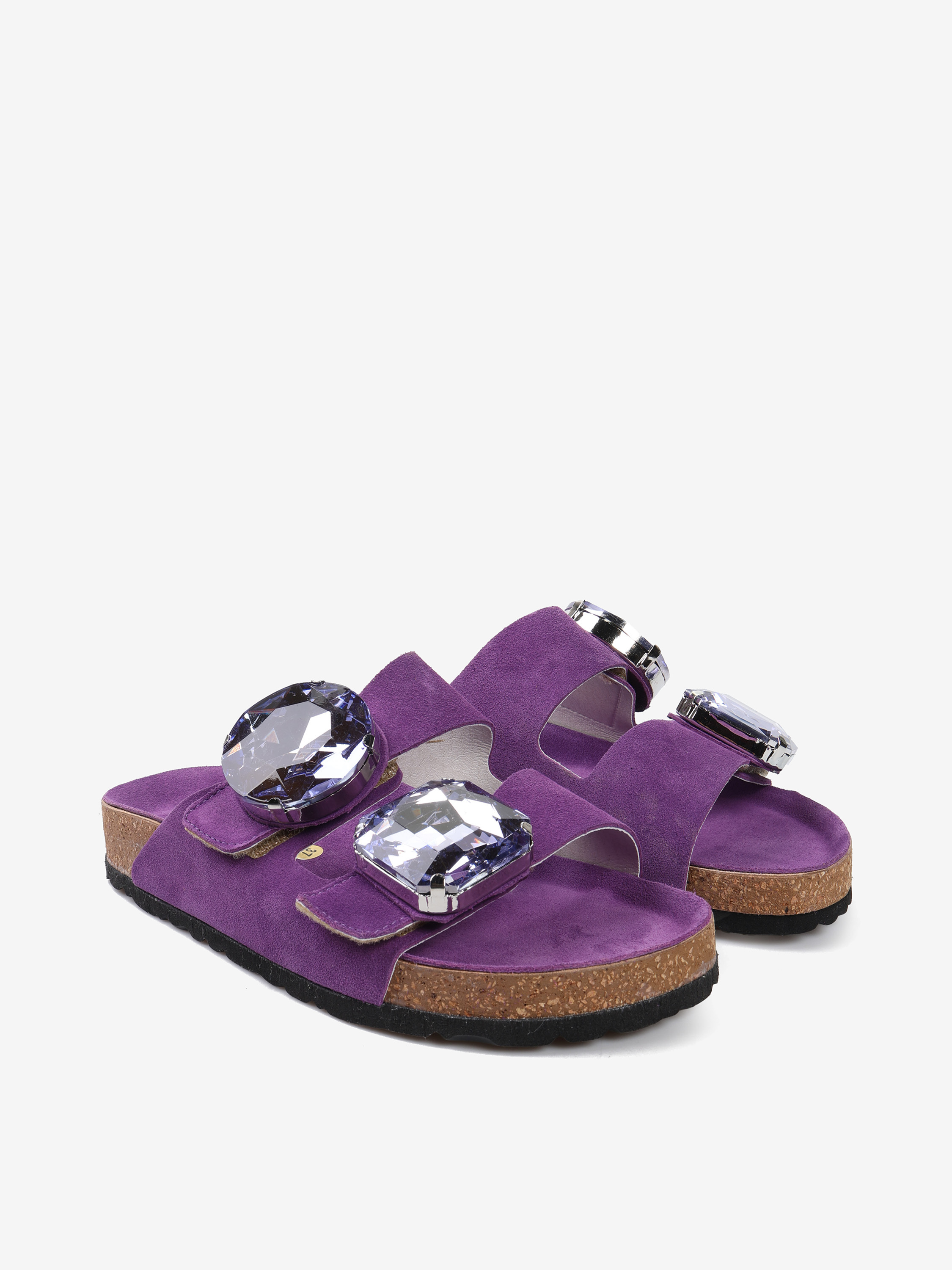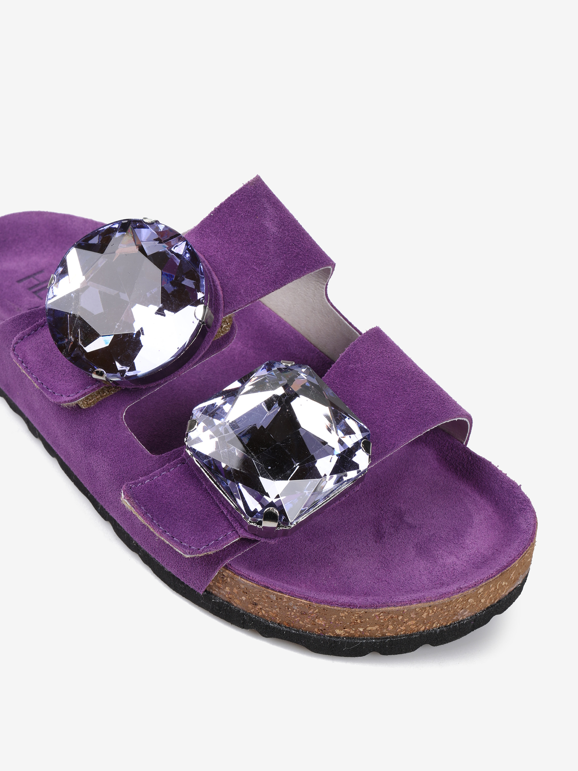 Zamszowe klapki z ozdobnymi kamieniami i paskami zapinanymi na rzep.