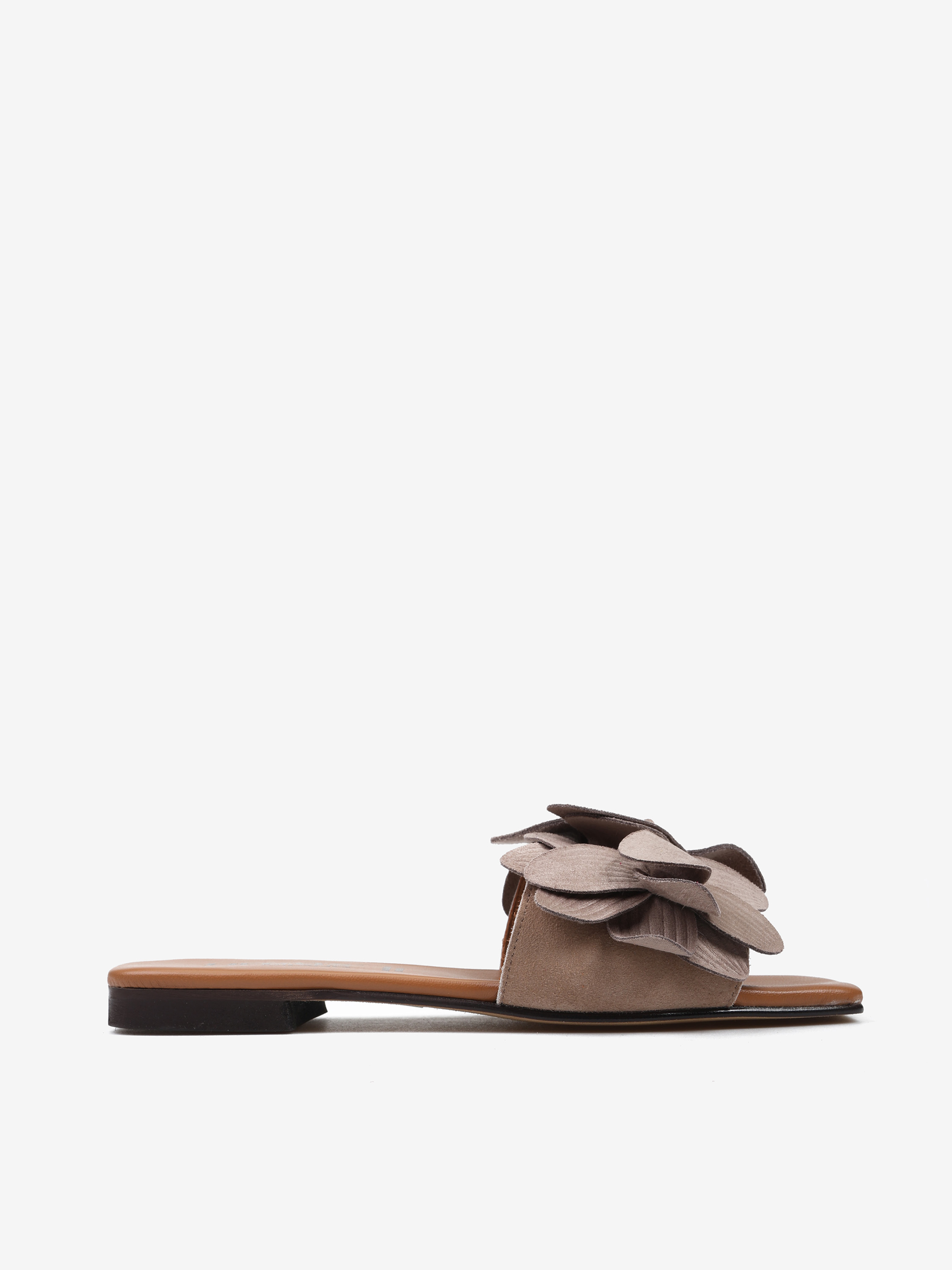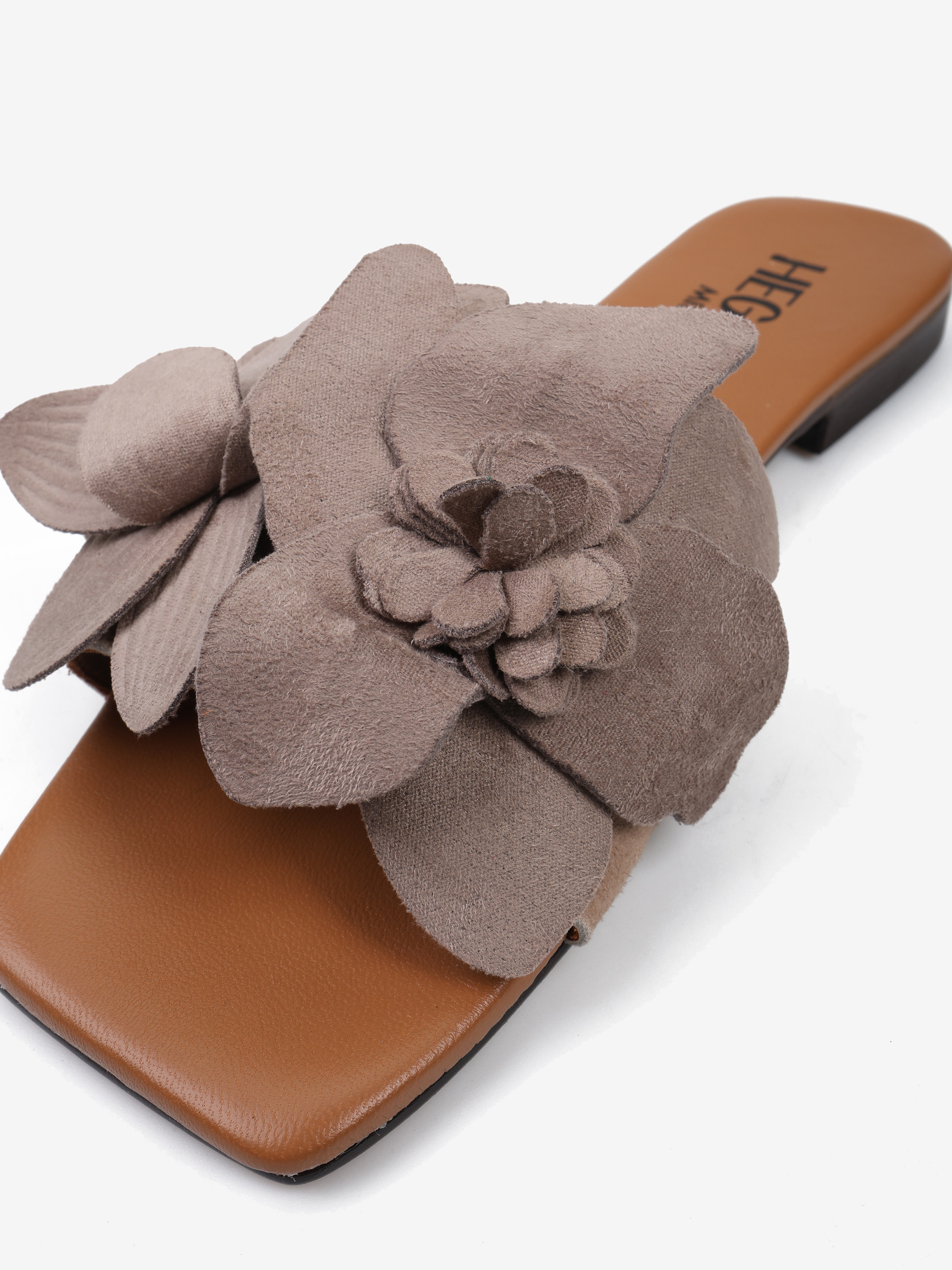 Klapki na płaskiej podeszwie. Szeroki, zamszowy pasek z ozdobnymi kwiatami.