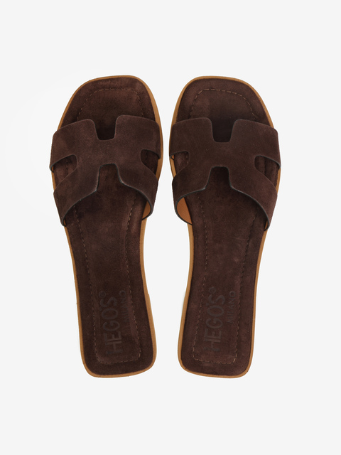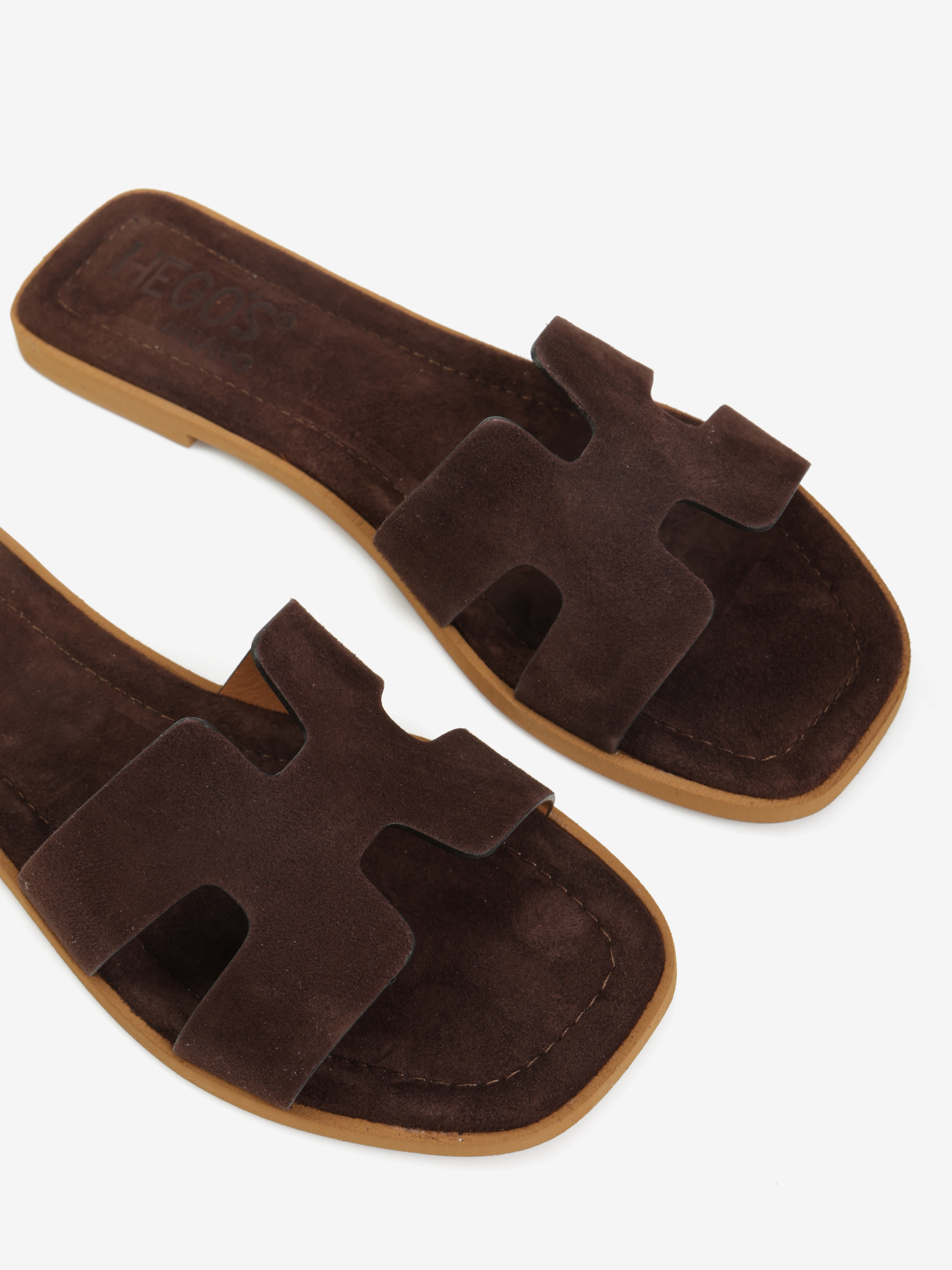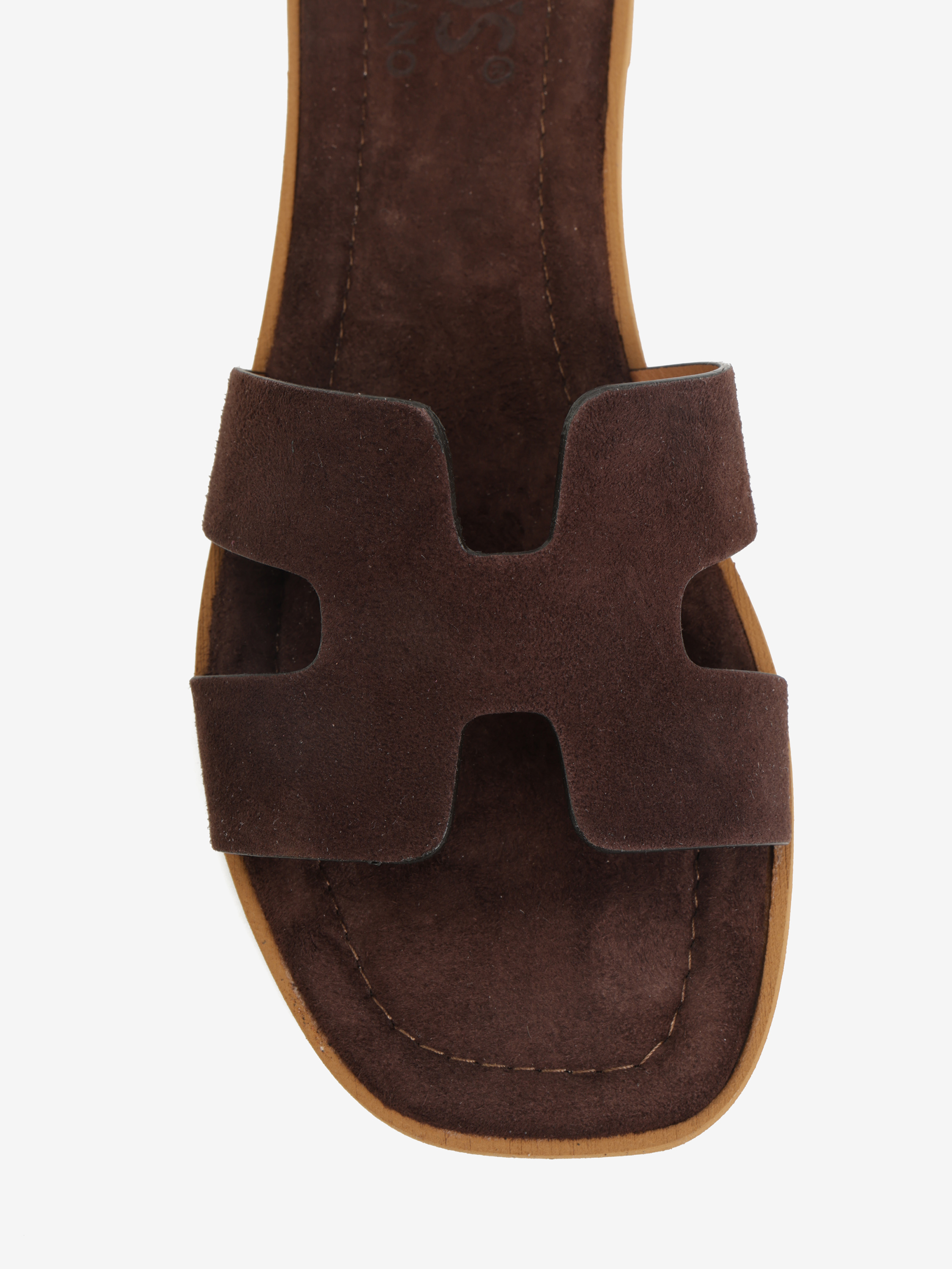 Modne, czekoladowobrązowe klapki wykonane z zamszu.