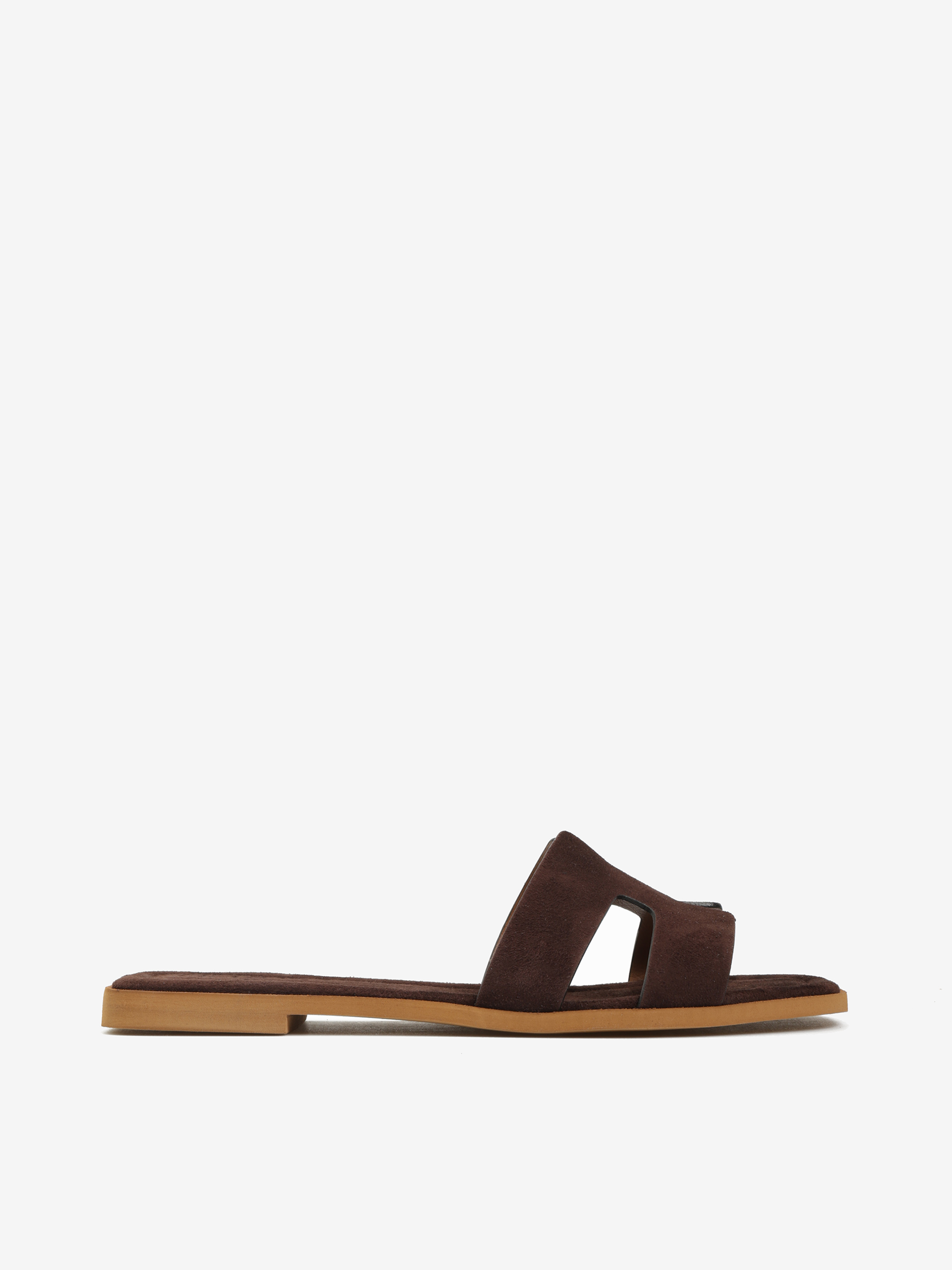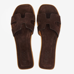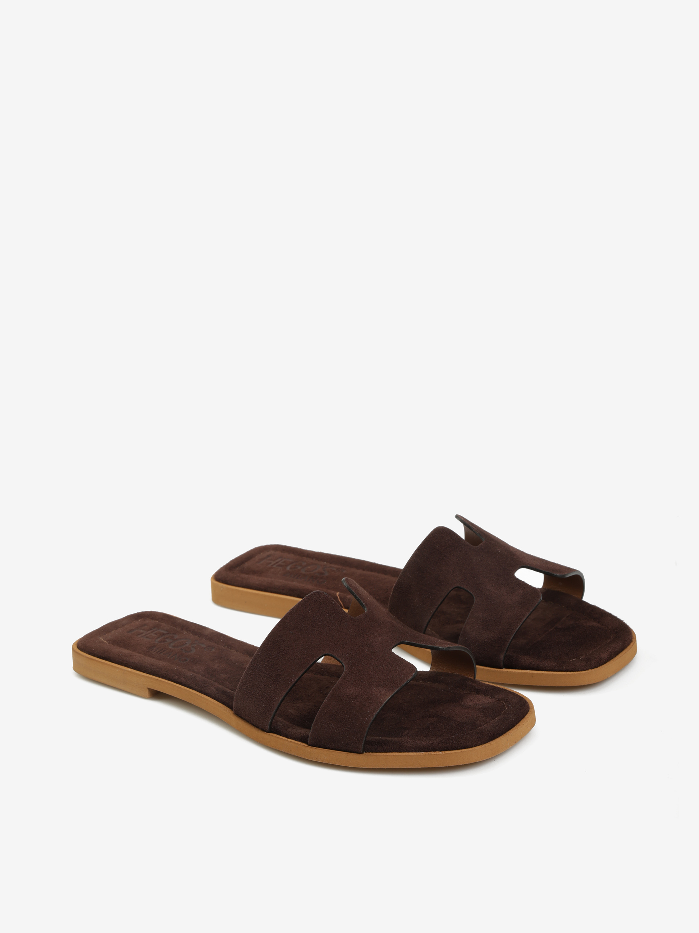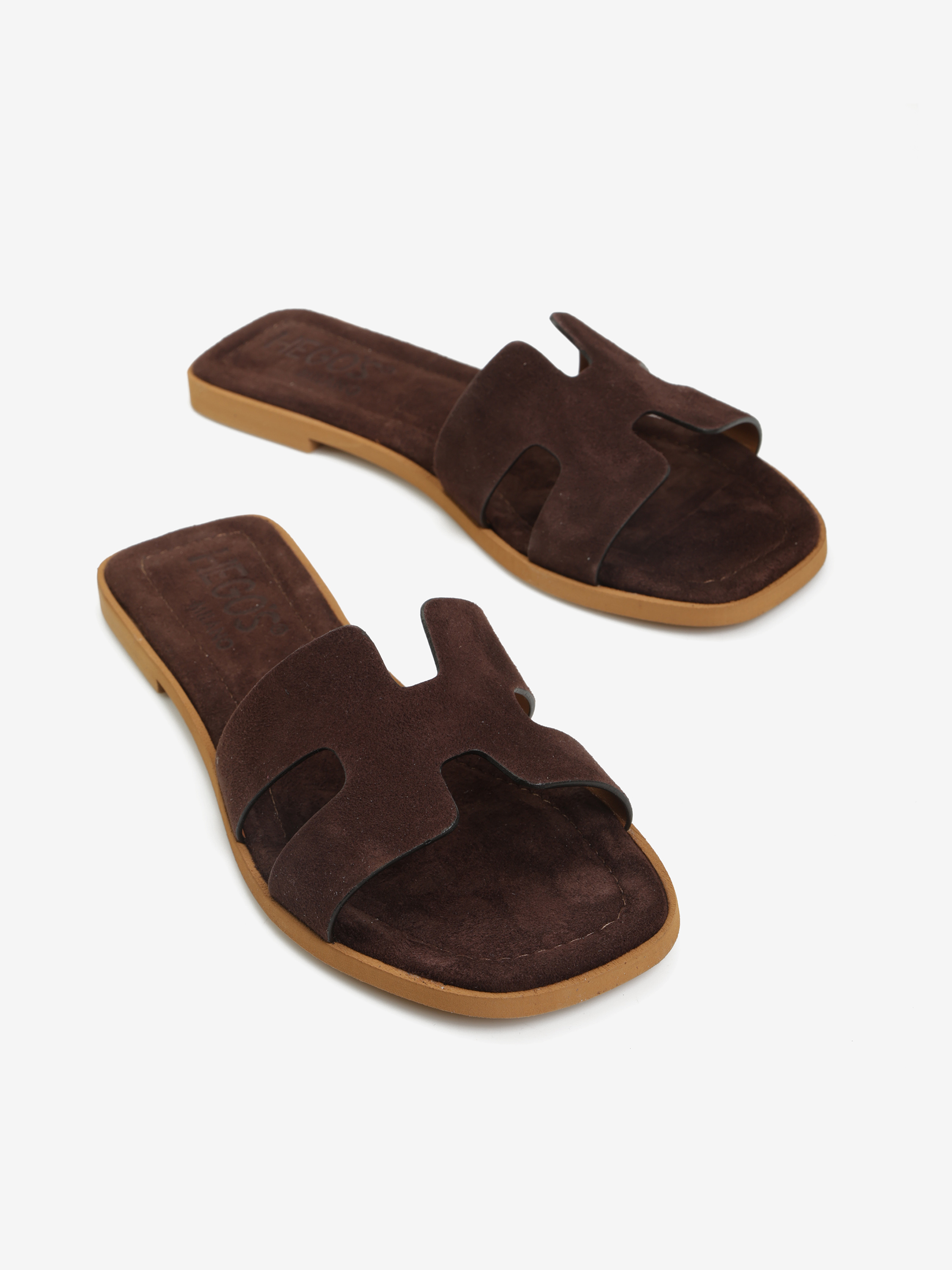 Modne, czekoladowobrązowe klapki wykonane z zamszu.