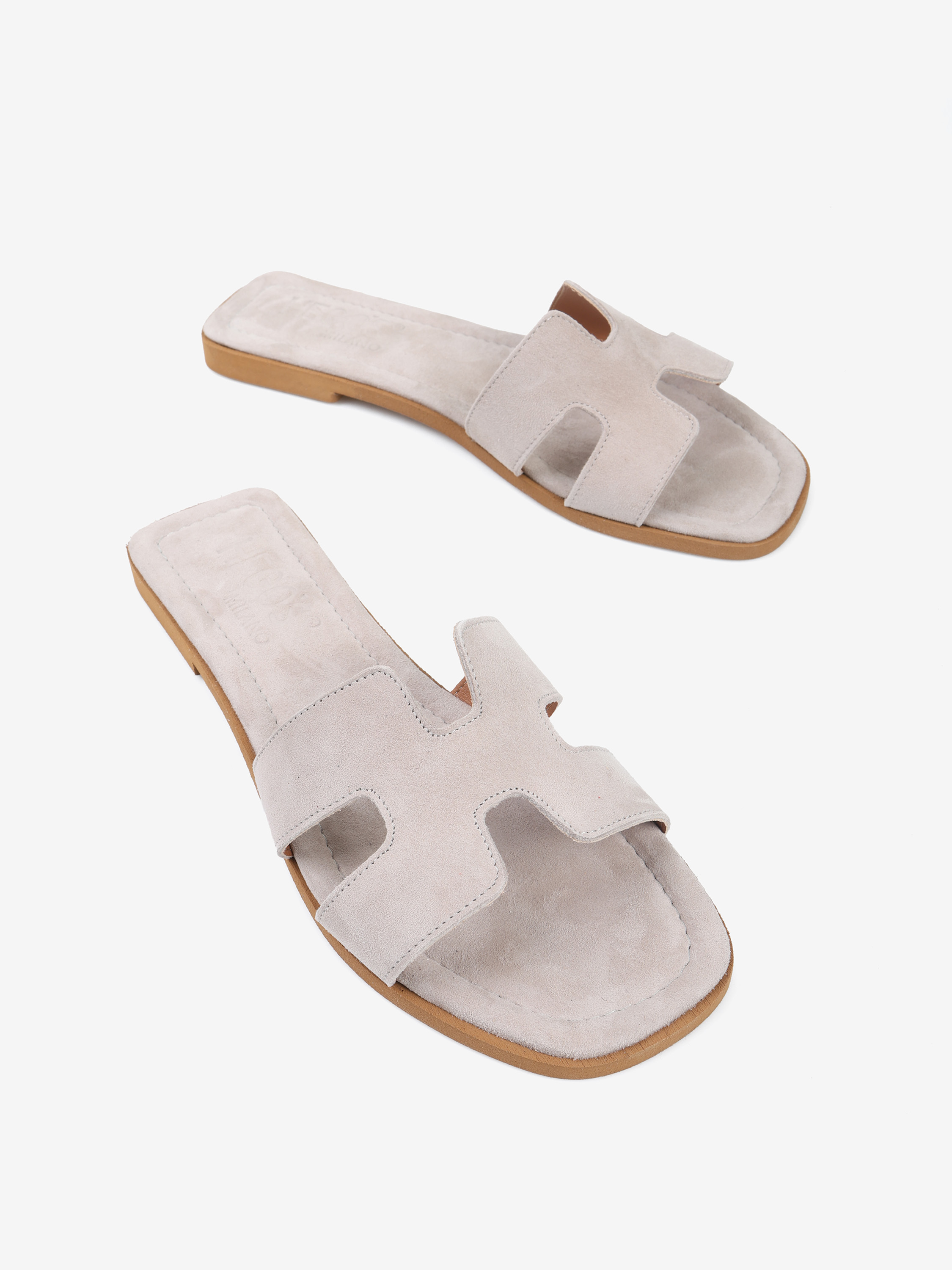 Modne, szare klapki wykonane z zamszu.