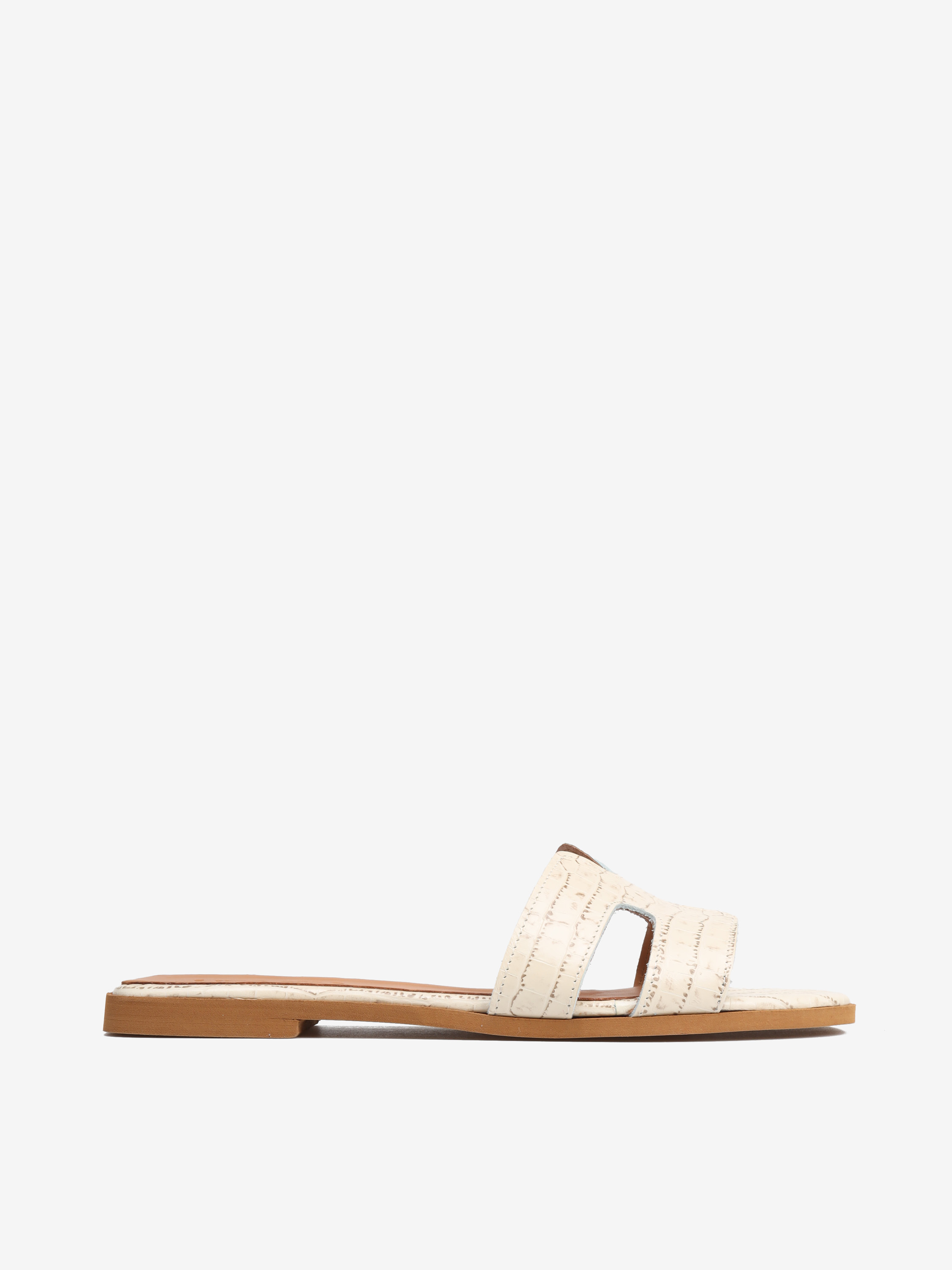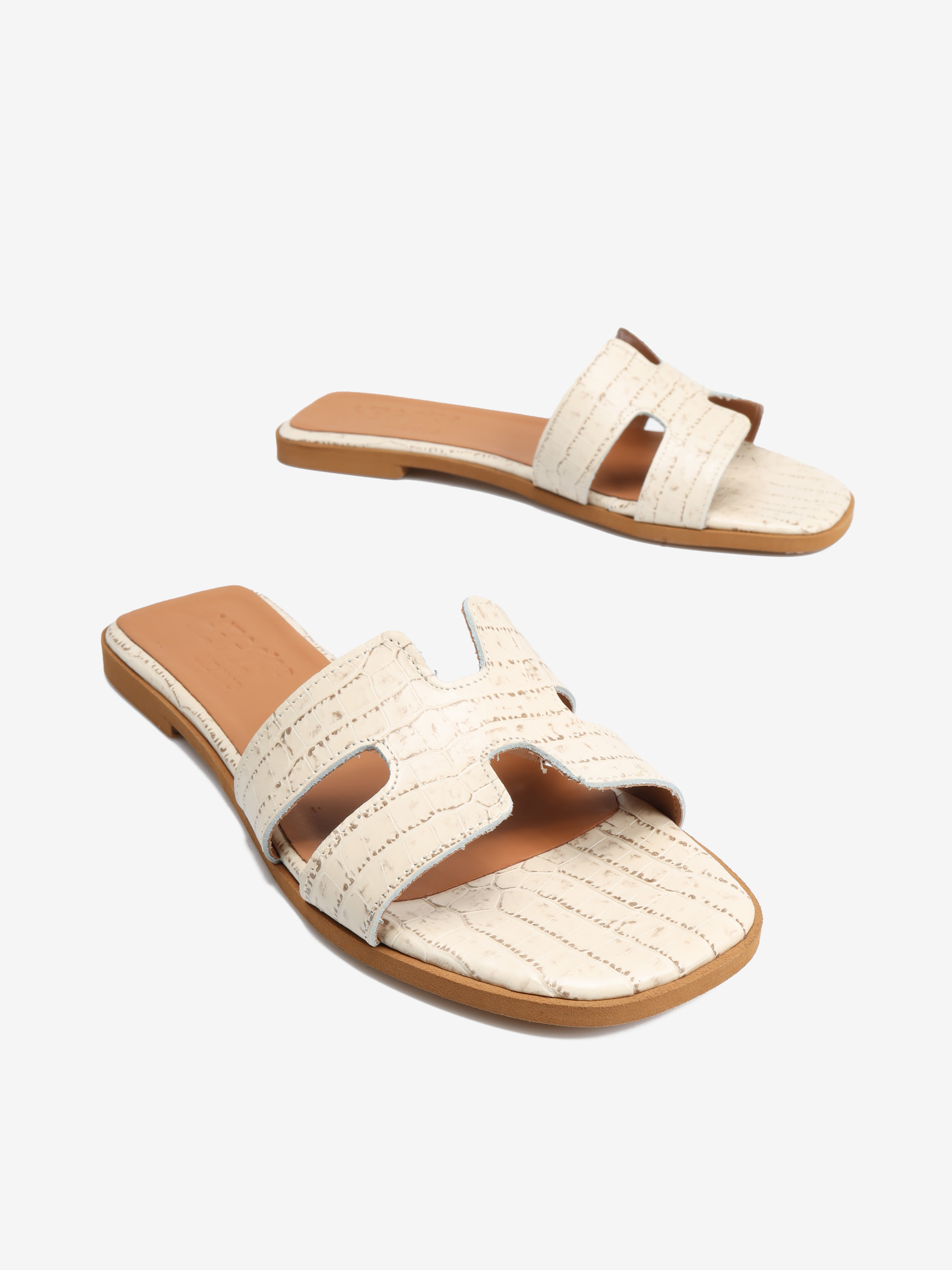 Modne, kremowe klapki wykonane ze skóry w krokodyli wzór.
