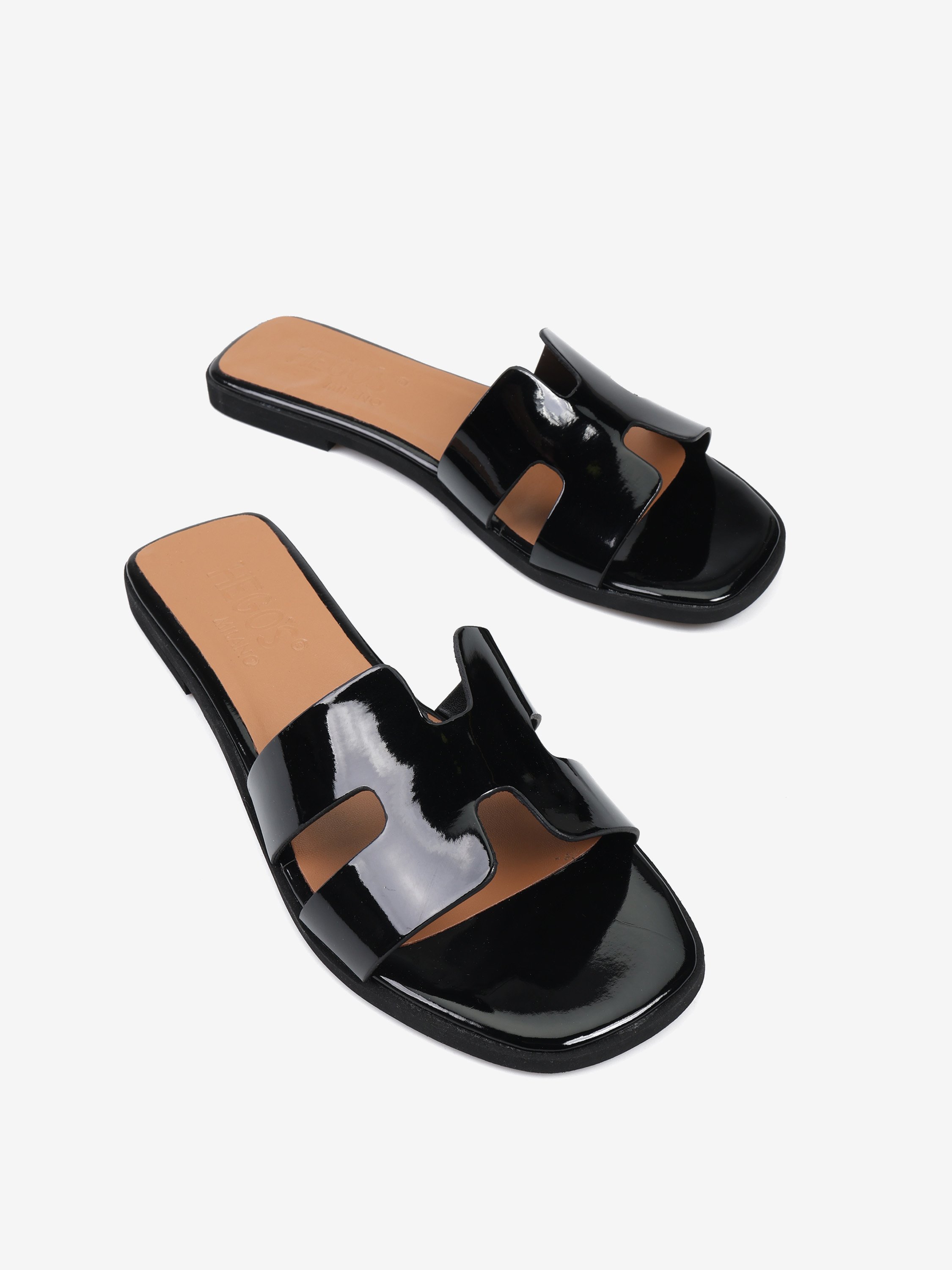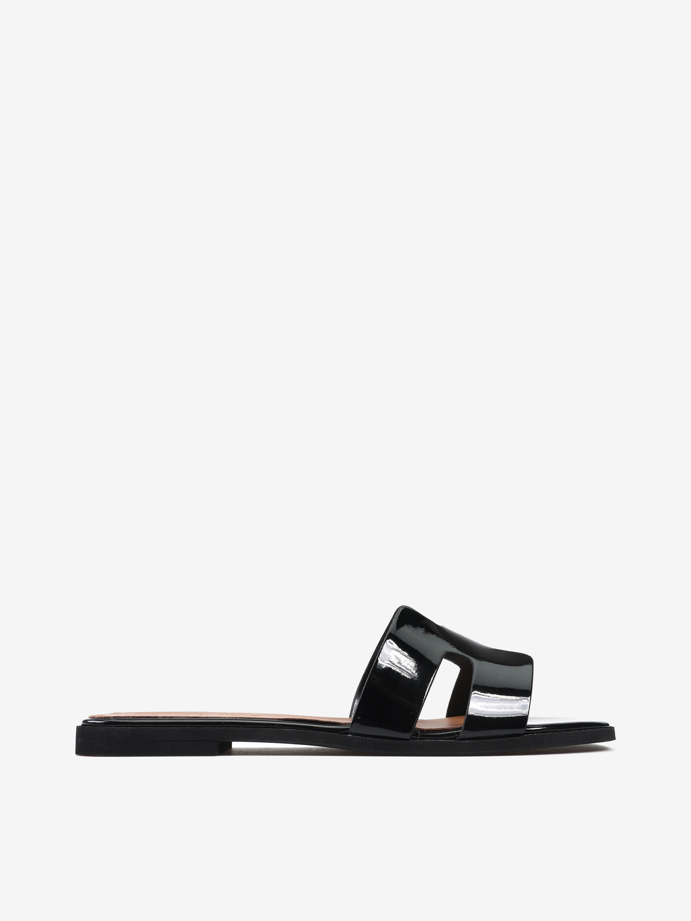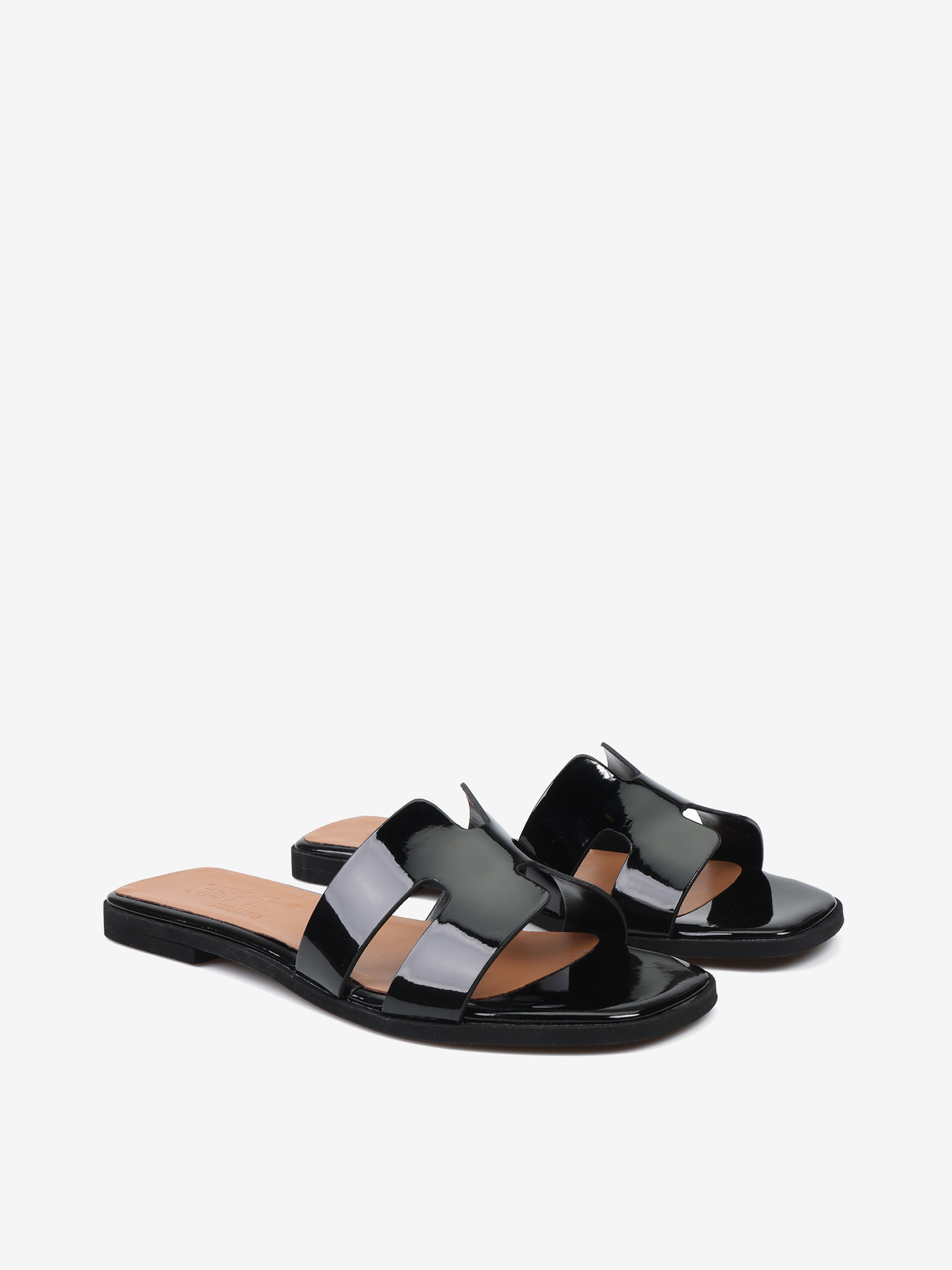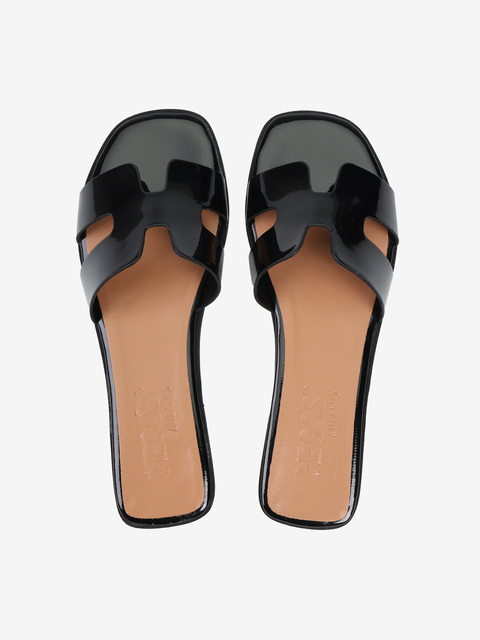 Modne, czarne klapki wykonane z lakierowanej skóry.
