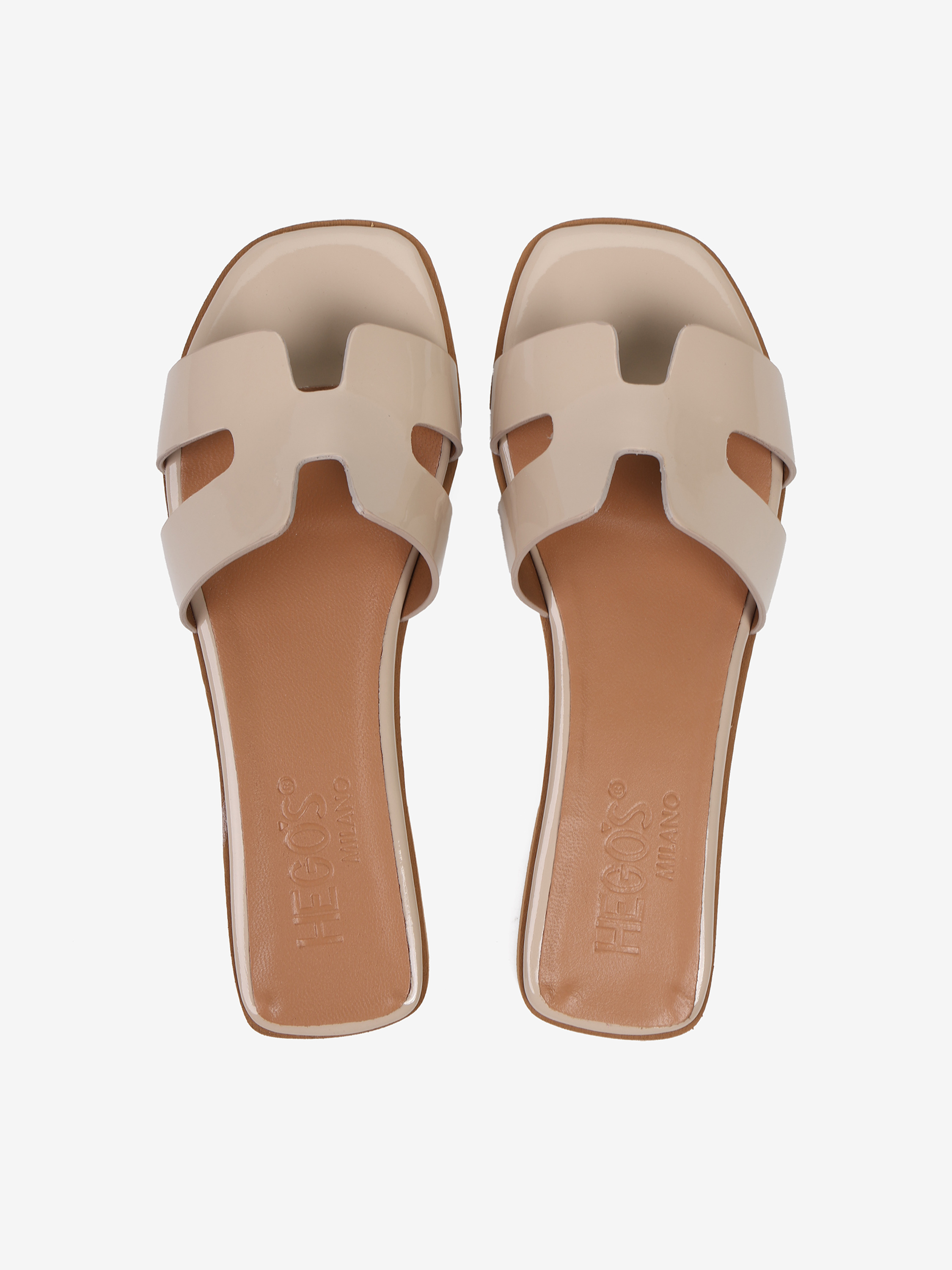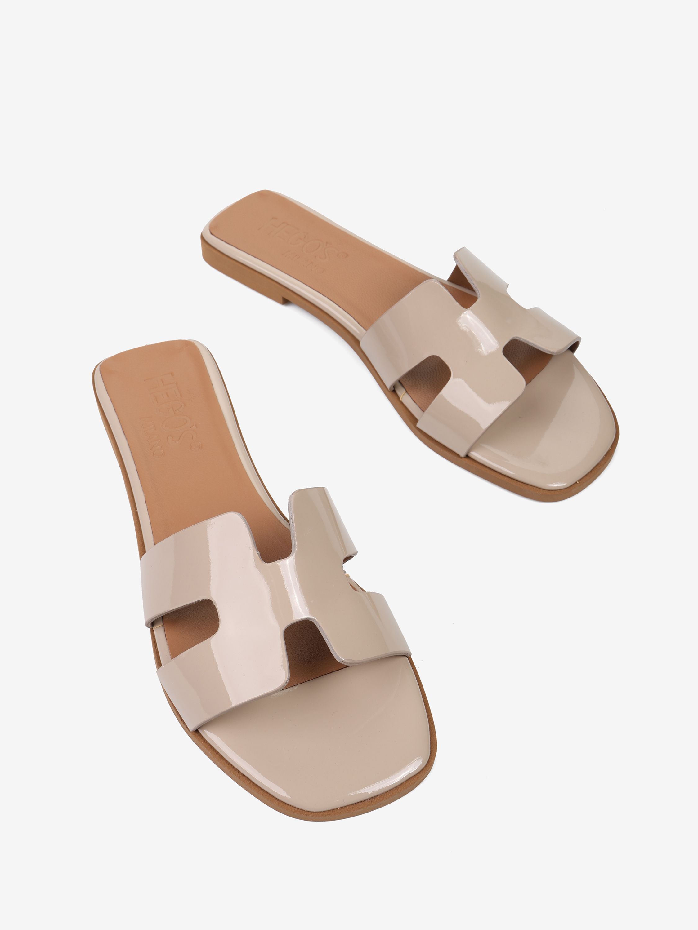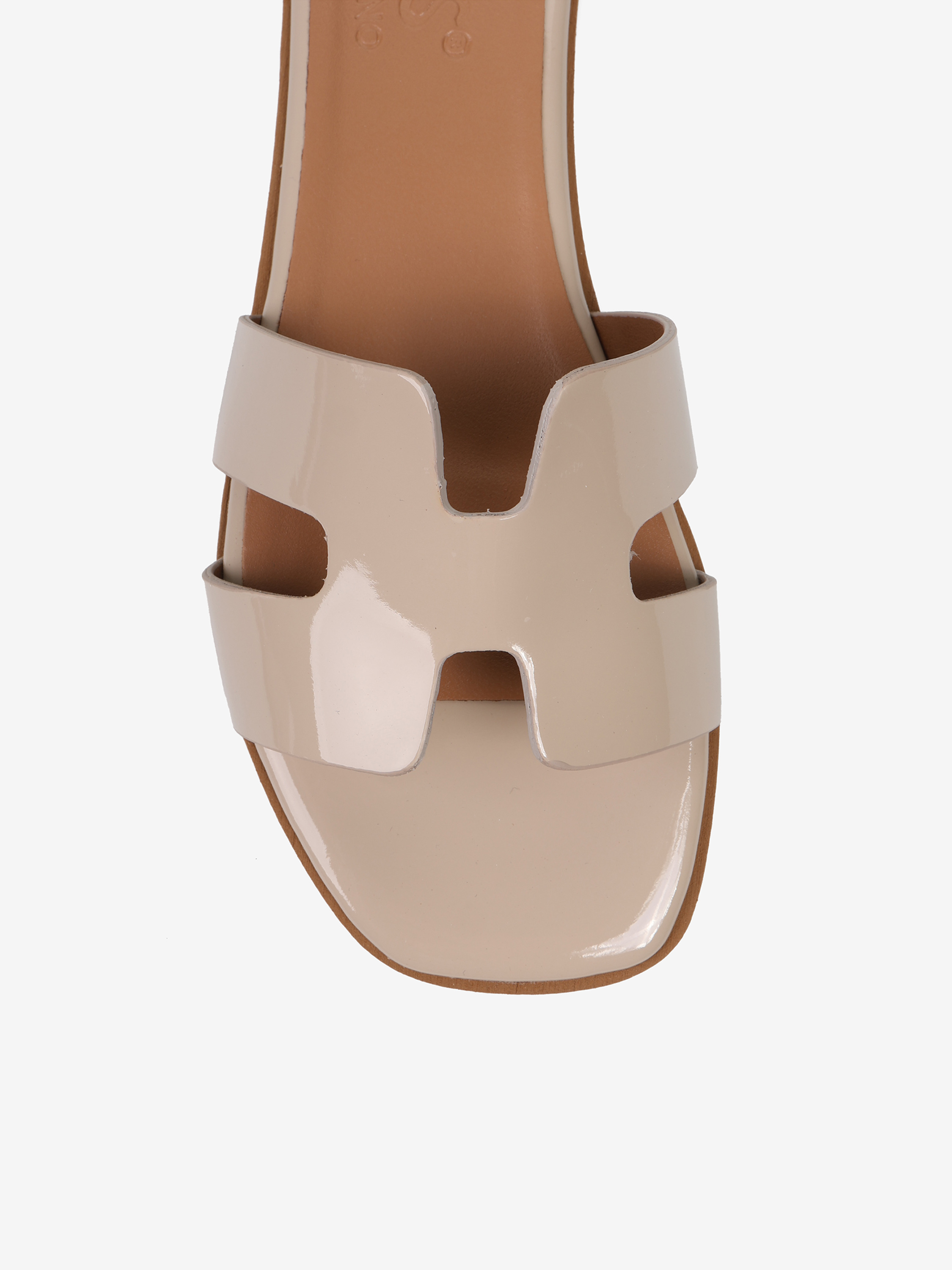 Modne, kremowe klapki wykonane z lakierowanej skóry.