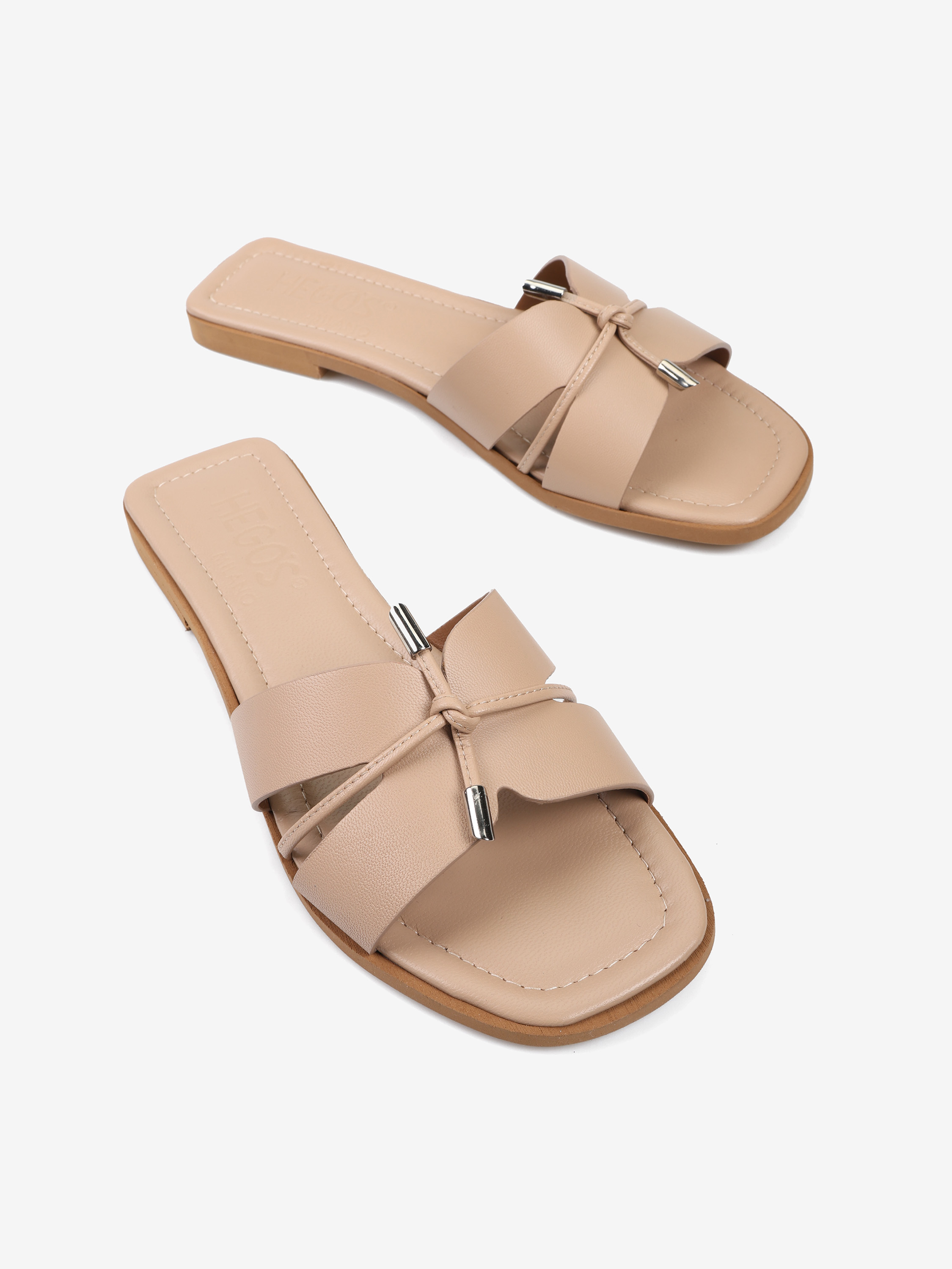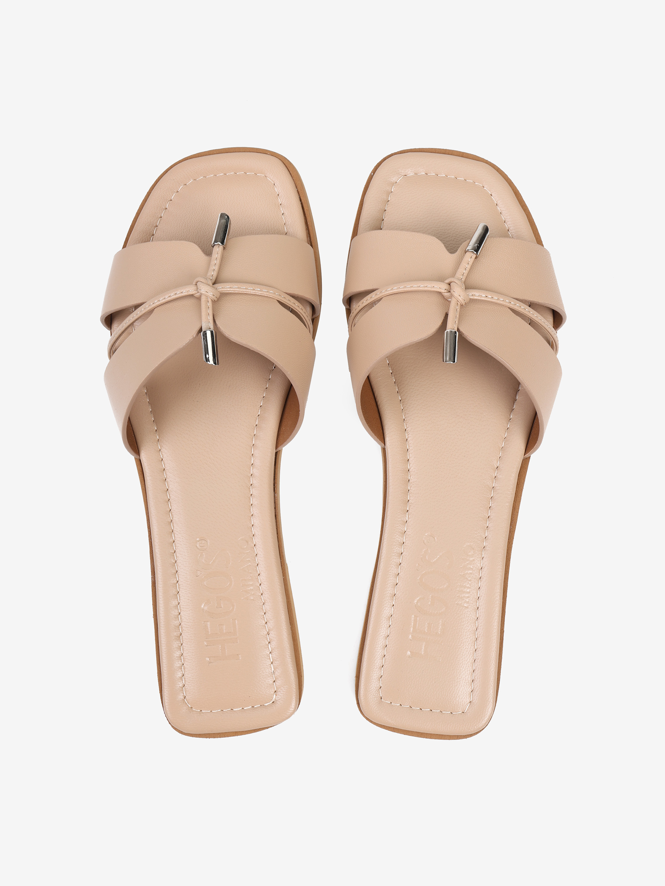 Modne klapki wykonane z miękkiej, delikatnej skóry. Ozdobne wiązanie ze skórzanego sznurka wykończonego metalowymi skuwkami.