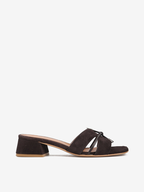 Modne, zamszowe klapki na niskim obcasie. Ozdobne wiązanie ze skórzanego sznurka wykończonego metalowymi skuwkami.