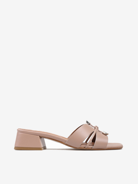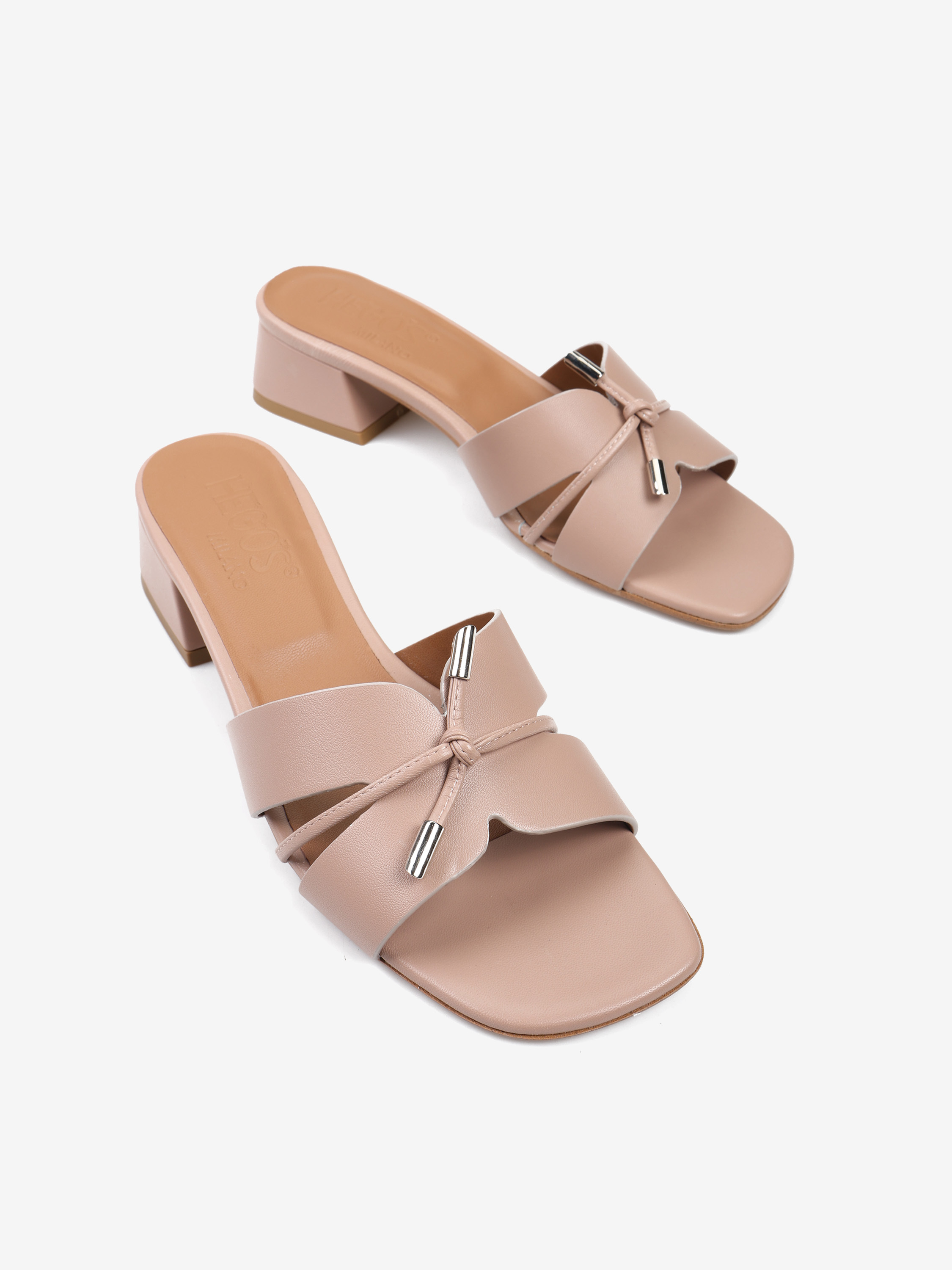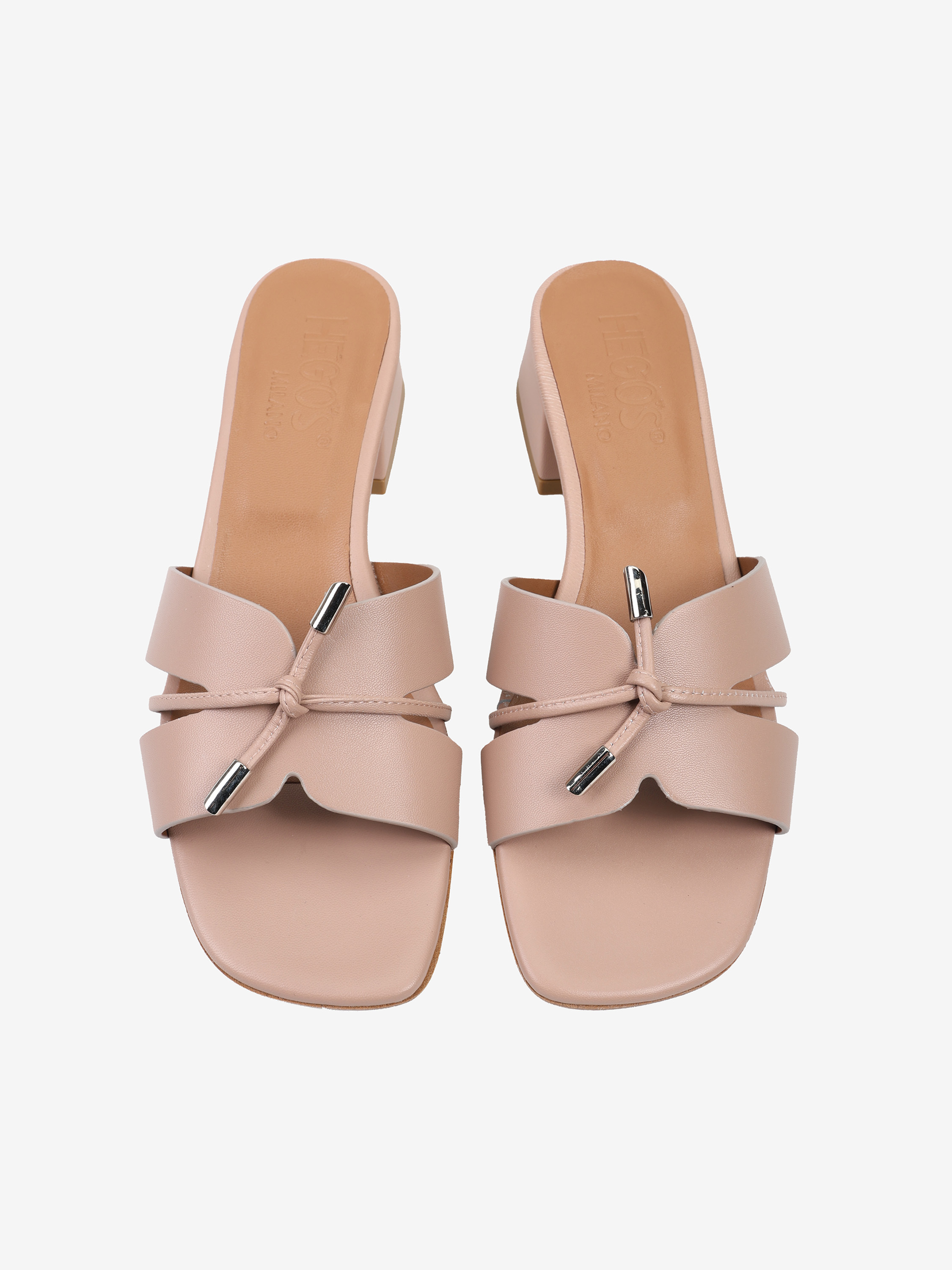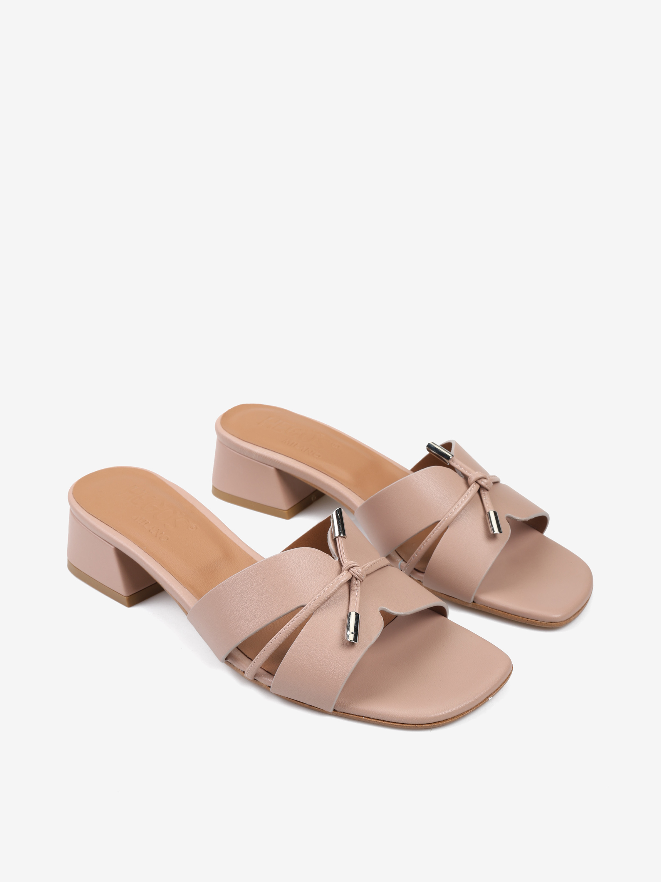 Modne klapki na niskim obcasie. Ozdobne wiązanie ze skórzanego sznurka wykończonego metalowymi skuwkami. Wykonane z miękkiej, delikatnej skóry.
