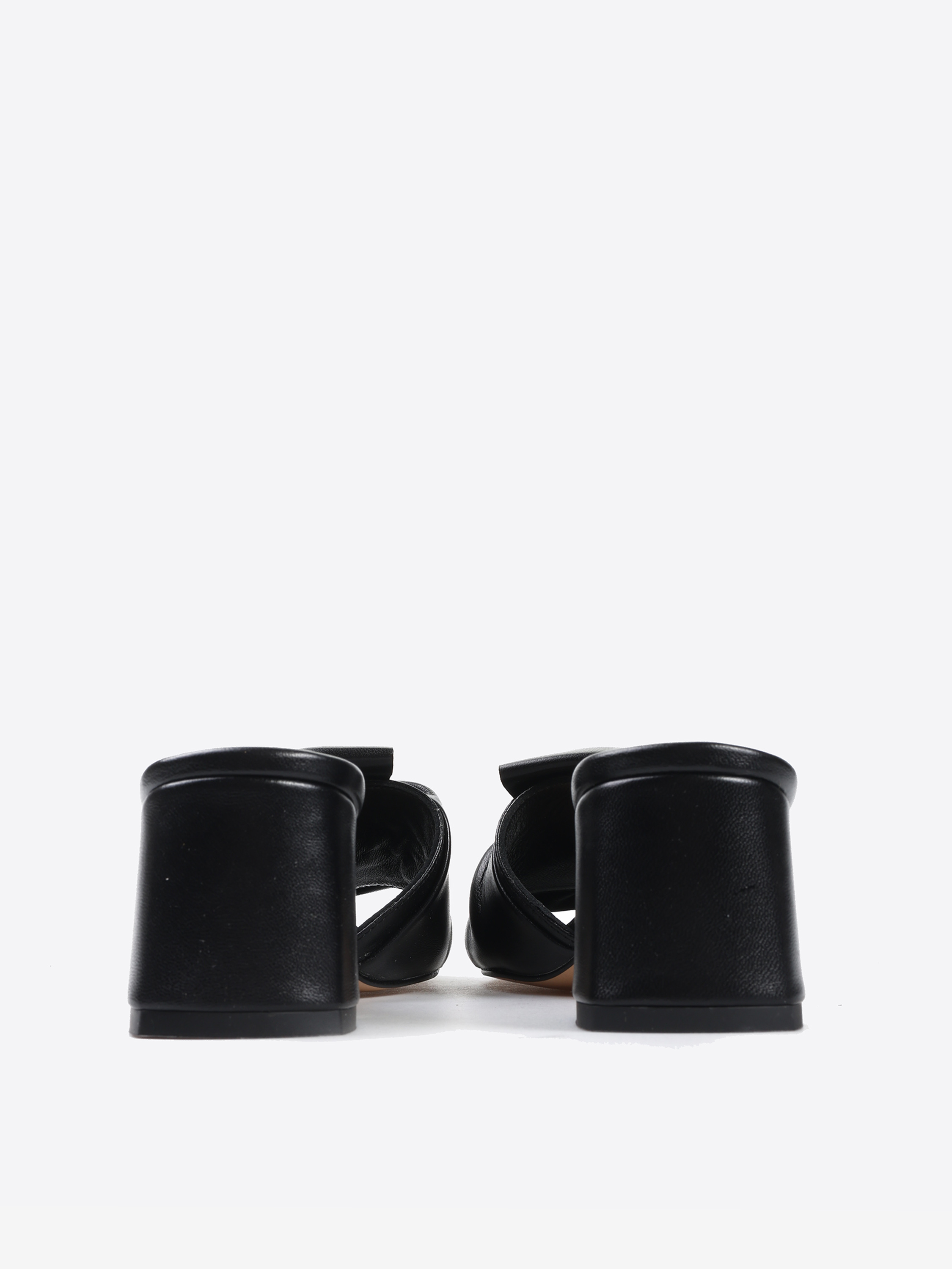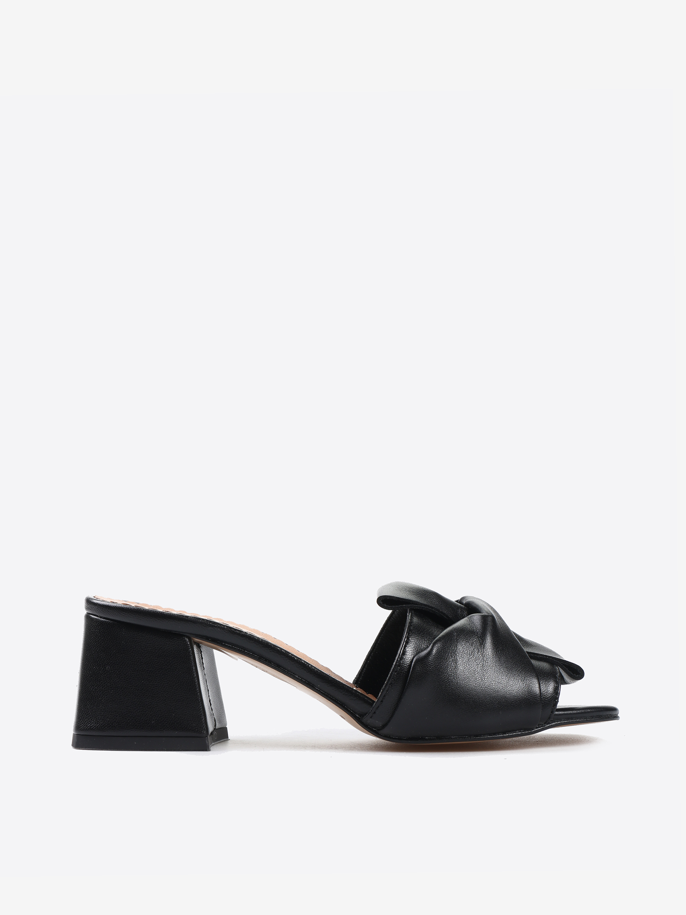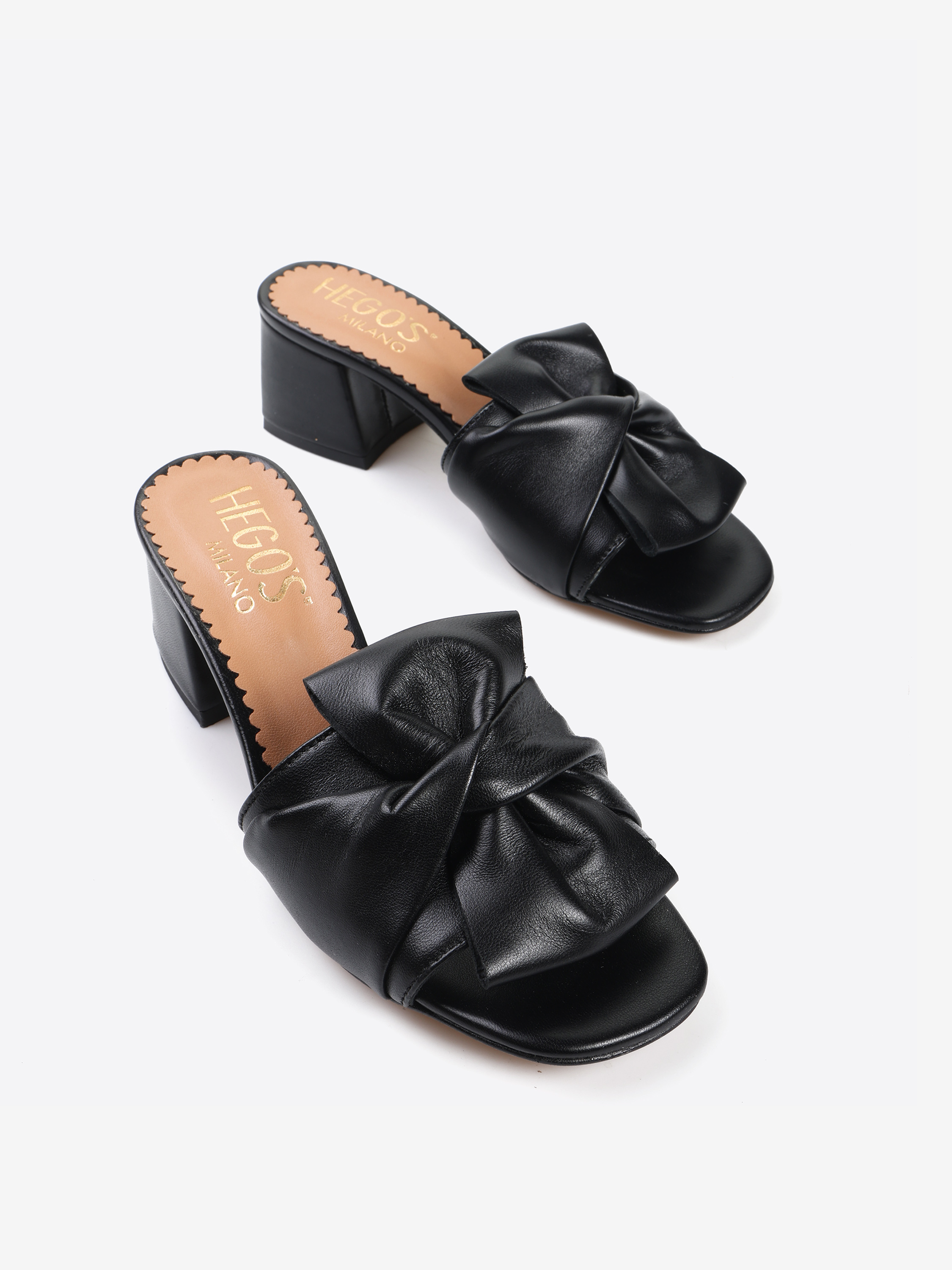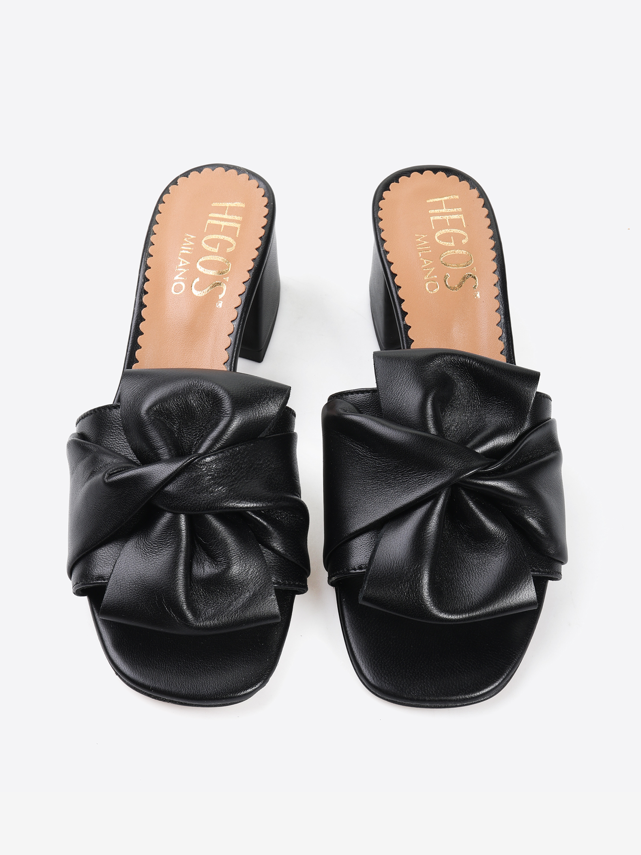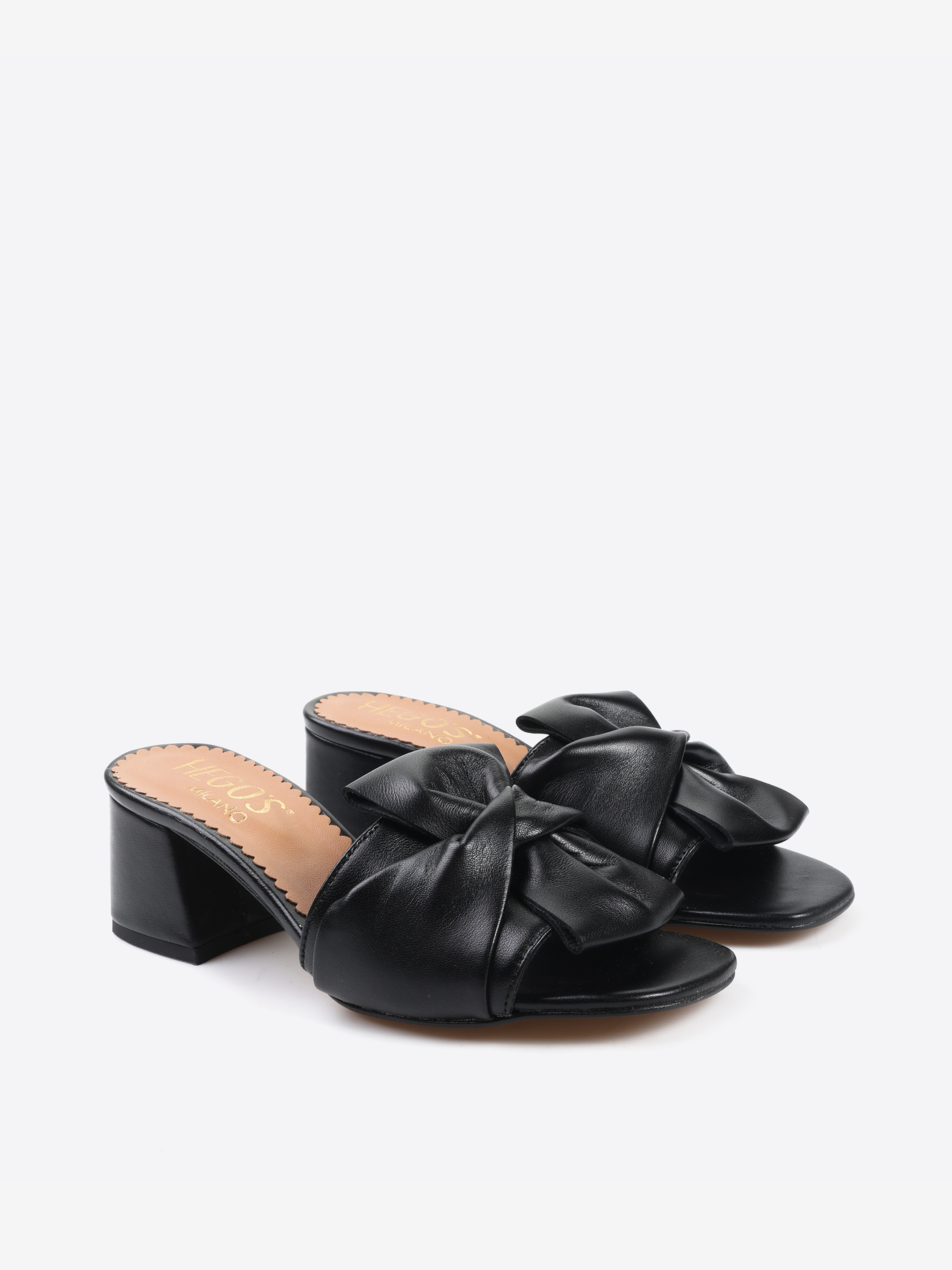 Klapki na obcasie wykonane z miękkiej, delikatnej skóry. Pasek z ozdobnym wiązaniem.