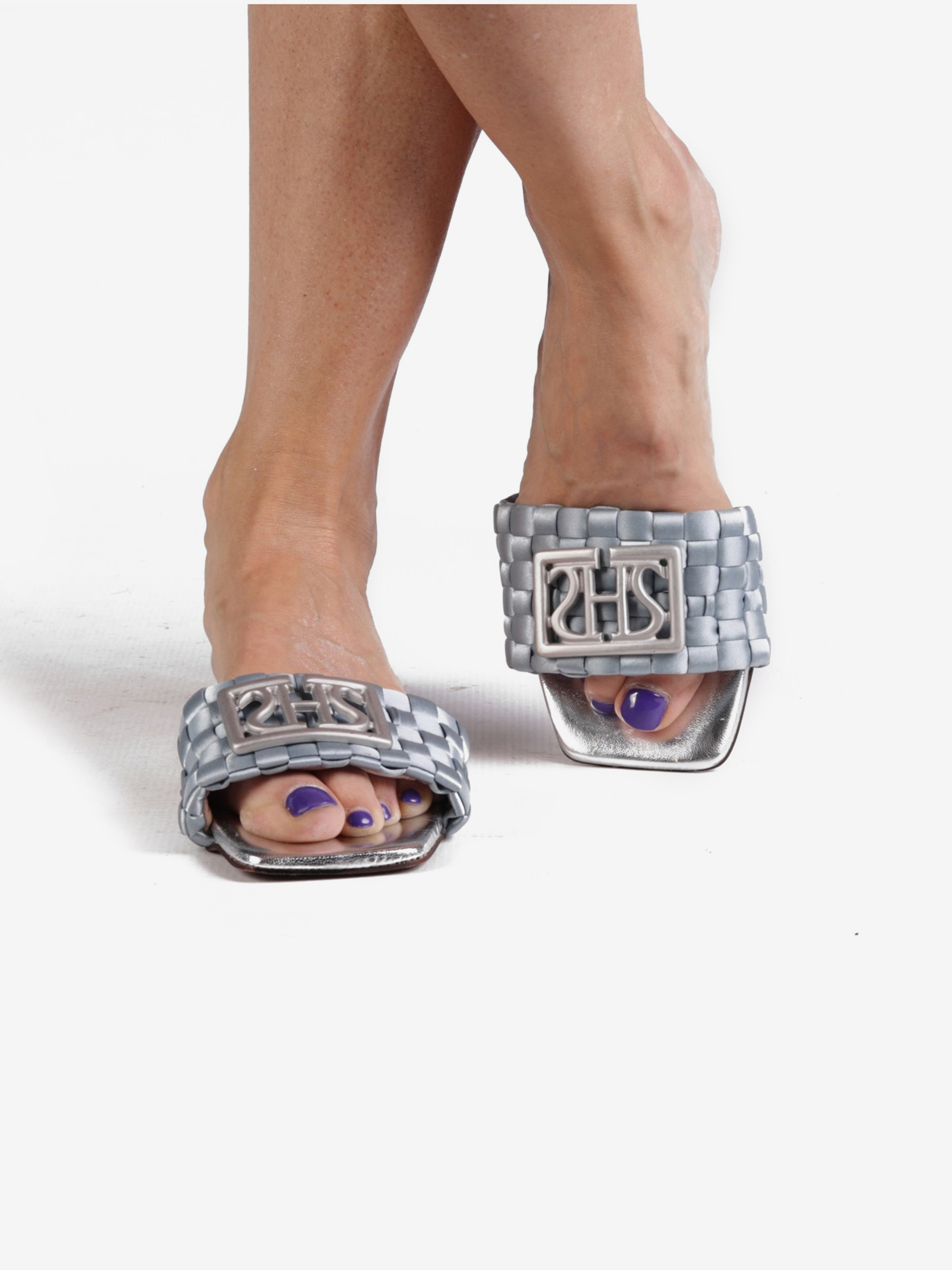 Wsuwane klapki na płaskim obcasie to model idealny na lato.  Szeroki, pleciony pasek trzyma stopę. Cholewka ozdobiona została srebrną, metalową klamrą.