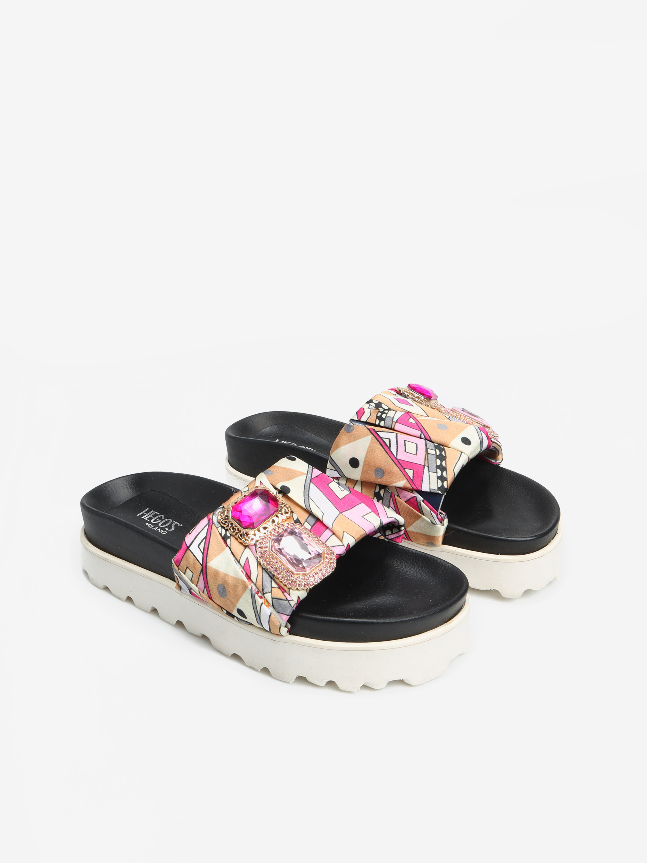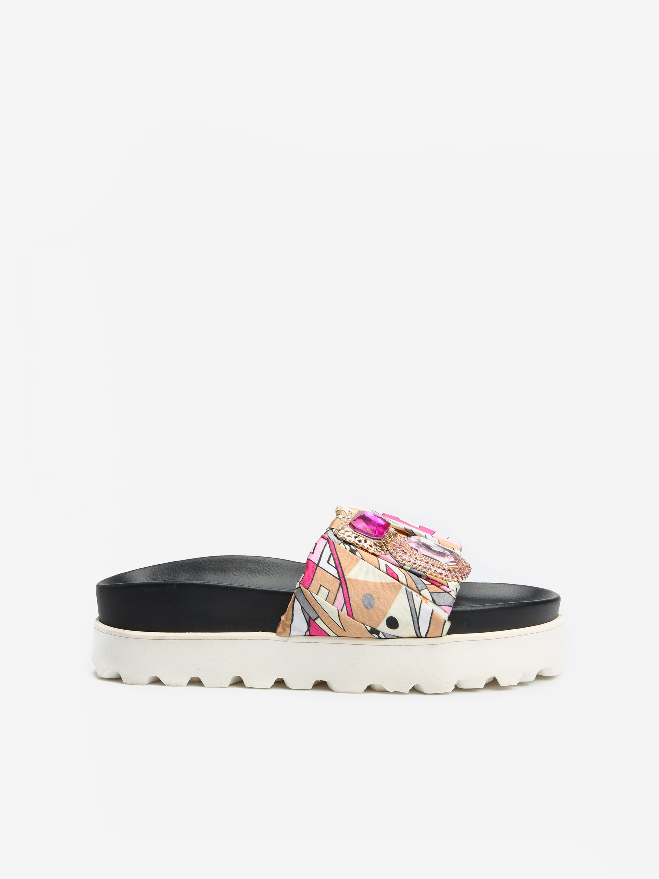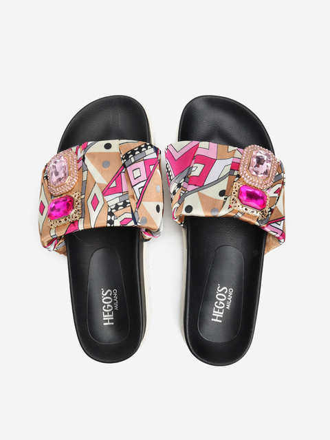 Wsuwane klapki na platformie to model idealny na lato. Lekkie i wygodne. Posiadają jeden, szeroki pasek z przodu, który trzyma stopę. Ozdobiony został materiałem z kolorowym printem oraz stylową broszką z kamien