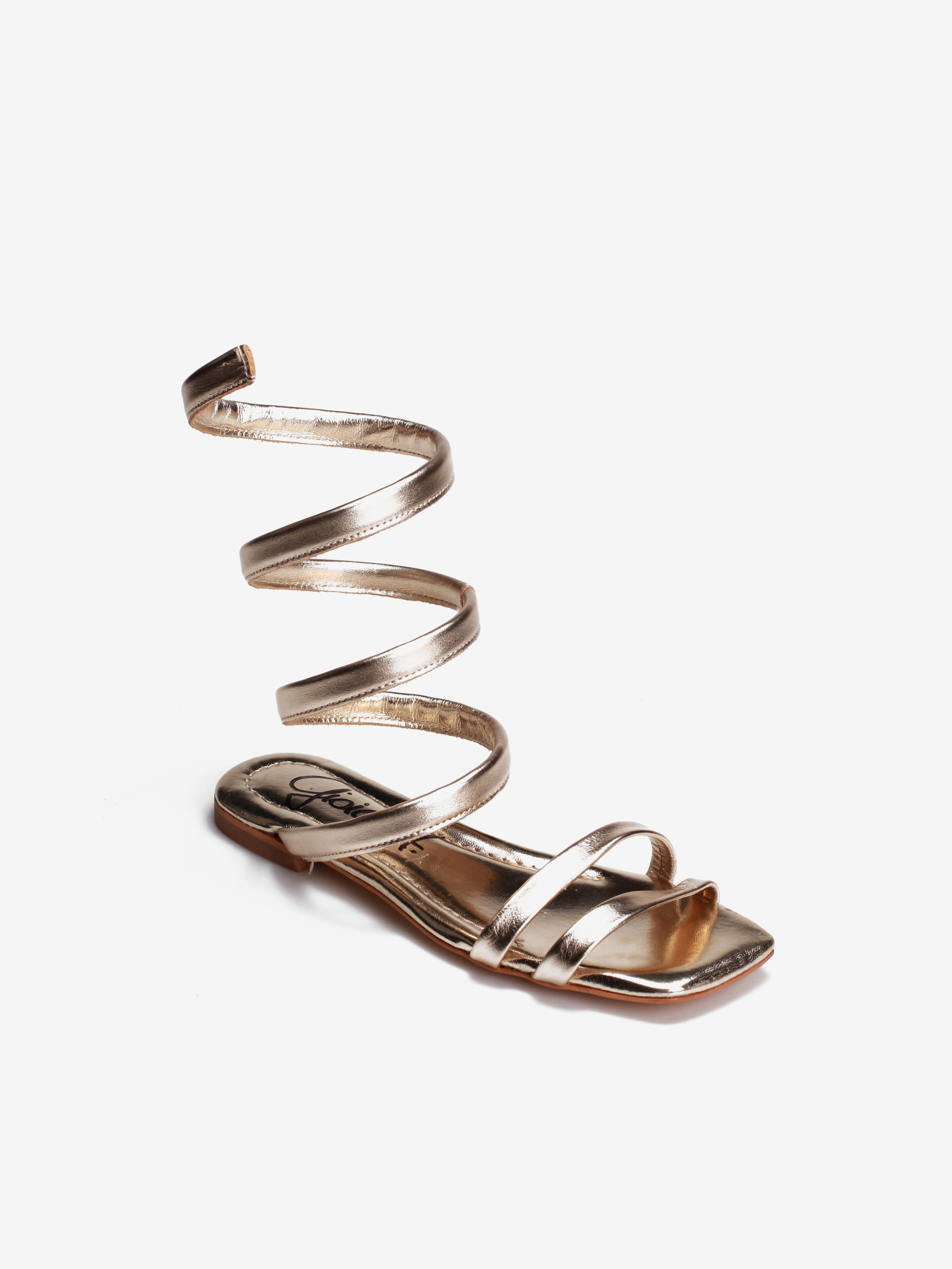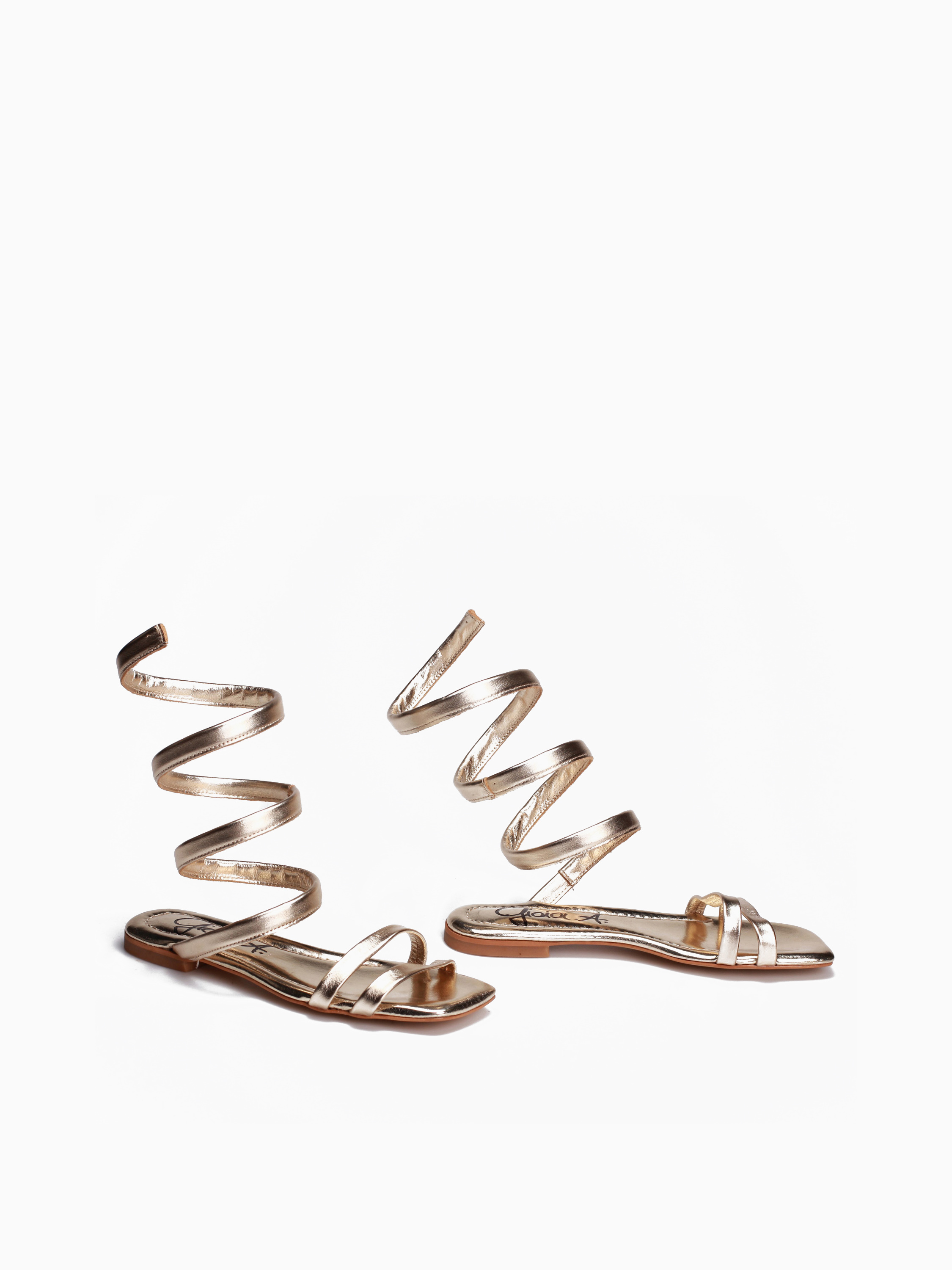 Wsuwane sandały na płaskim obcasie wykonane są z naturalnej skóry. Metaliczna cholewka w złotym kolorze posiada sztywny pasek zawijany wokół nogi. Oryginalny model będzie uzupełnieniem modnej garderoby kobiety.