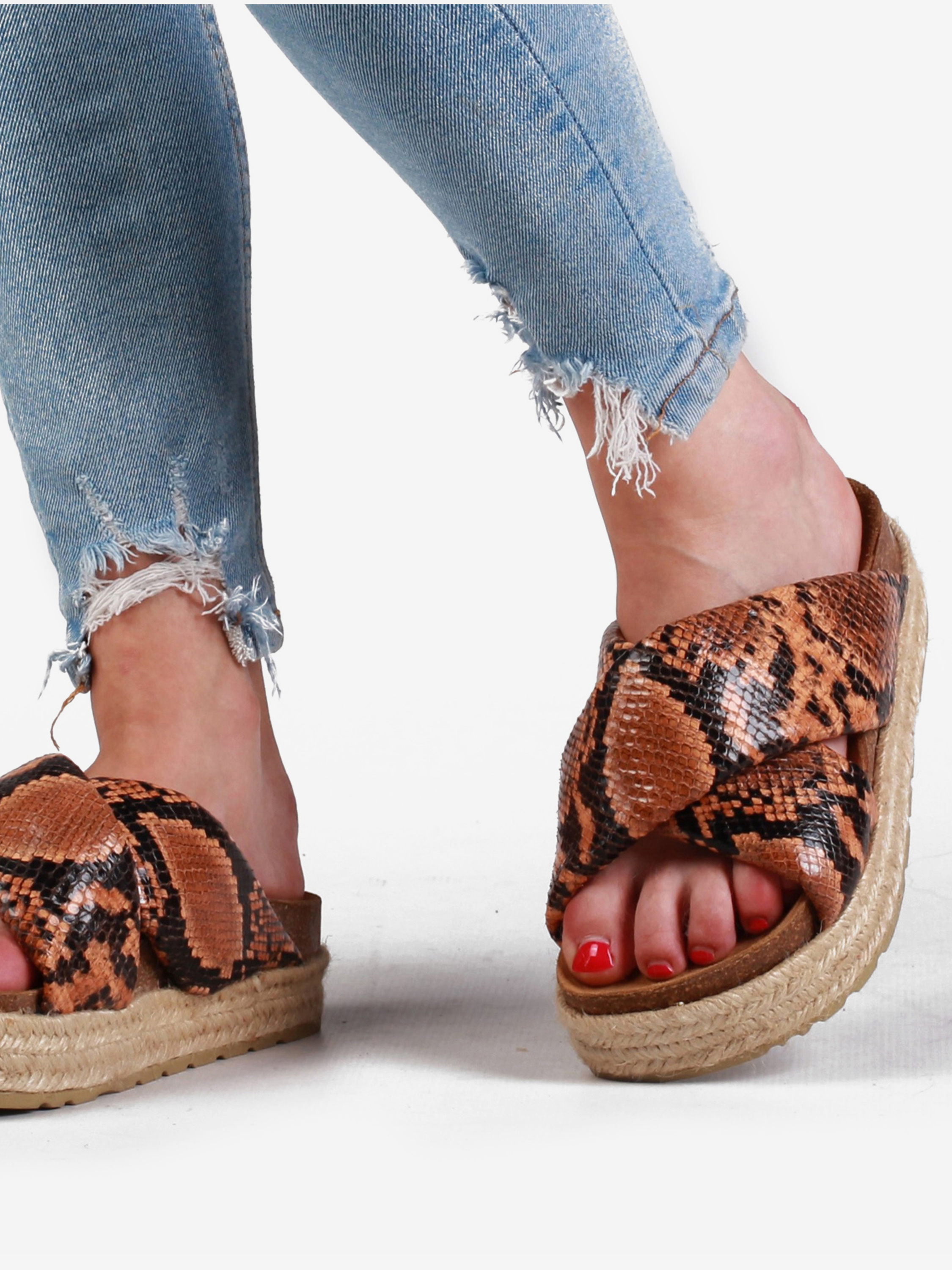 Wsuwane klapki wykonane są z naturalnej skóry. Model z dwoma szerokimi paskami idealnie trzyma stopę. Cholewka z modnym zwierzęcym printem. Podeszwa na delikatnej platformie ozdobiona została sznurkiem z juty.