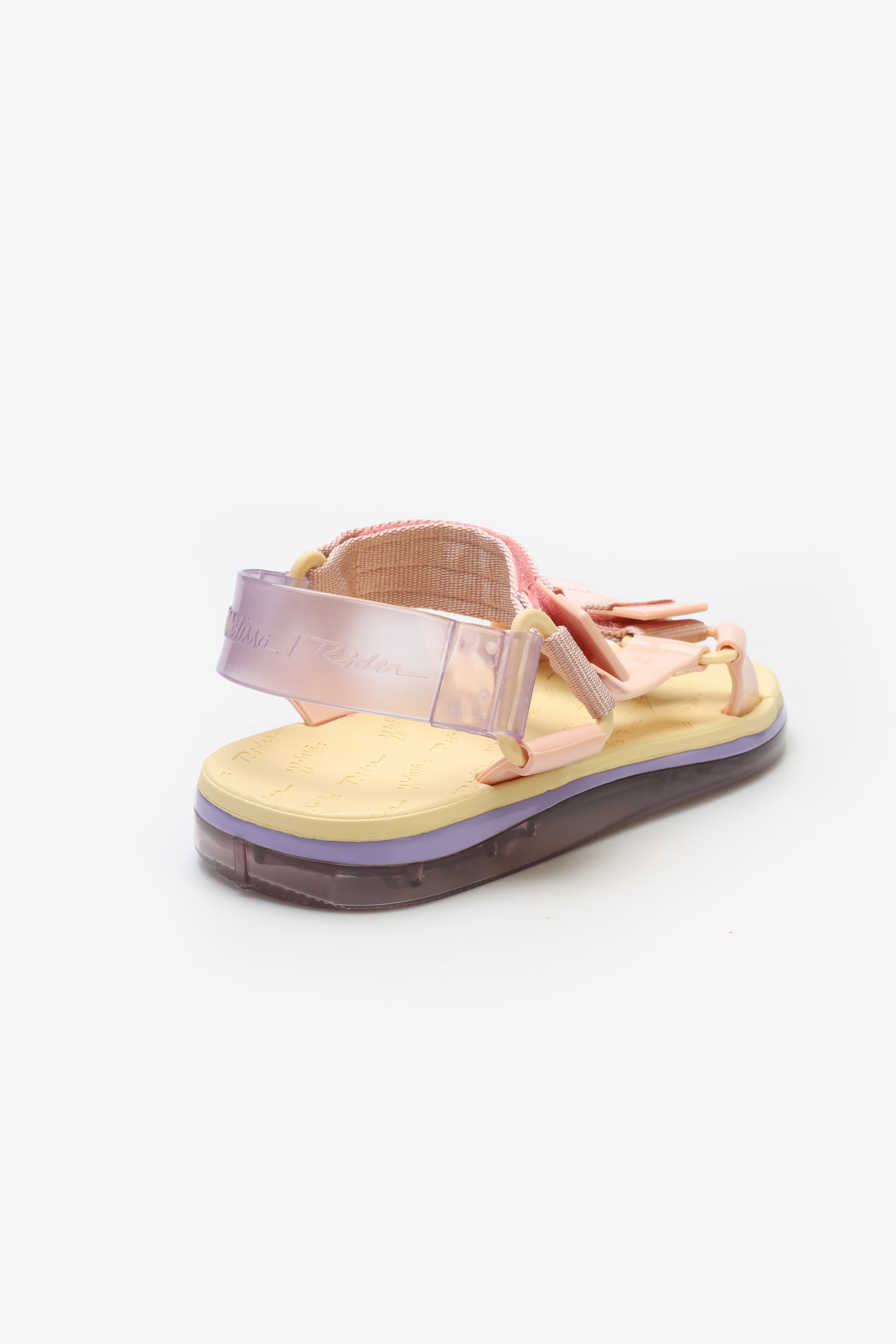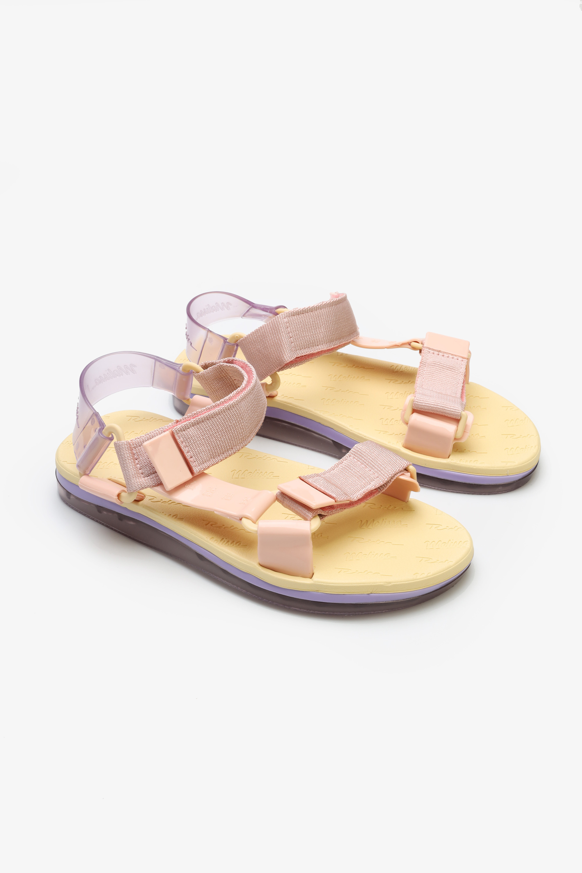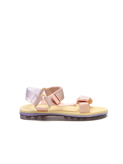 Sandały Melissa wykonane z miękkiego, elastycznego i bardzo wygodnego tworzywa Mel-Flex, które pachnie gumą balonową. Materiał ten to mieszanka przetworzonego plastiku i kauczuku. Mają minimalistyczną podeszwę o eleganckim, opływowym kształcie. Jej wysokość sprawia, że zapewniona jest doskonała amortyzacja. Sandały łatwo dopasować do szerokości stopy i wysokości podbicia za sprawą pasków na rzepy. One także są z wodoodpornego materiału Mel-Flex. Są nieco grubsze i wyglądają jak miękkie poduszeczki.