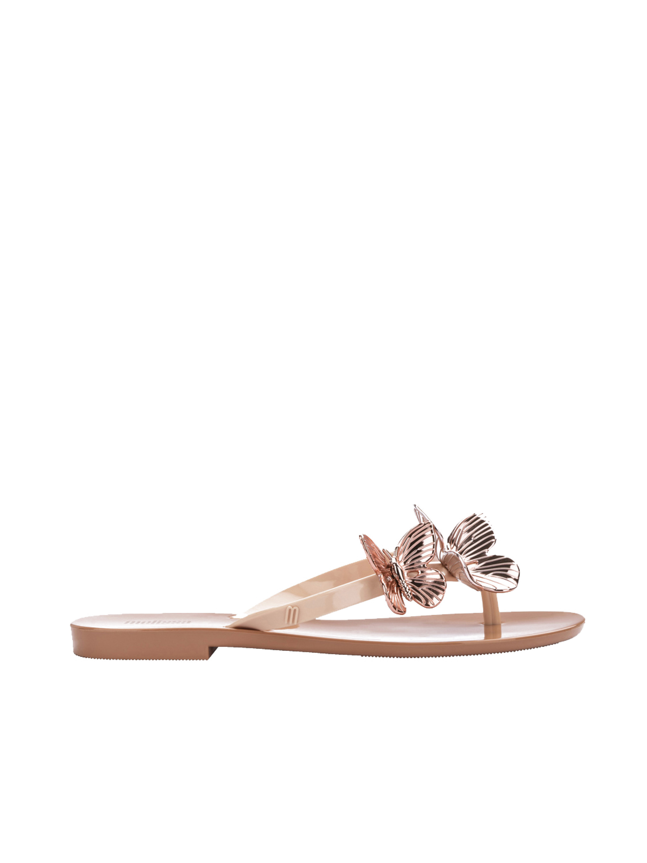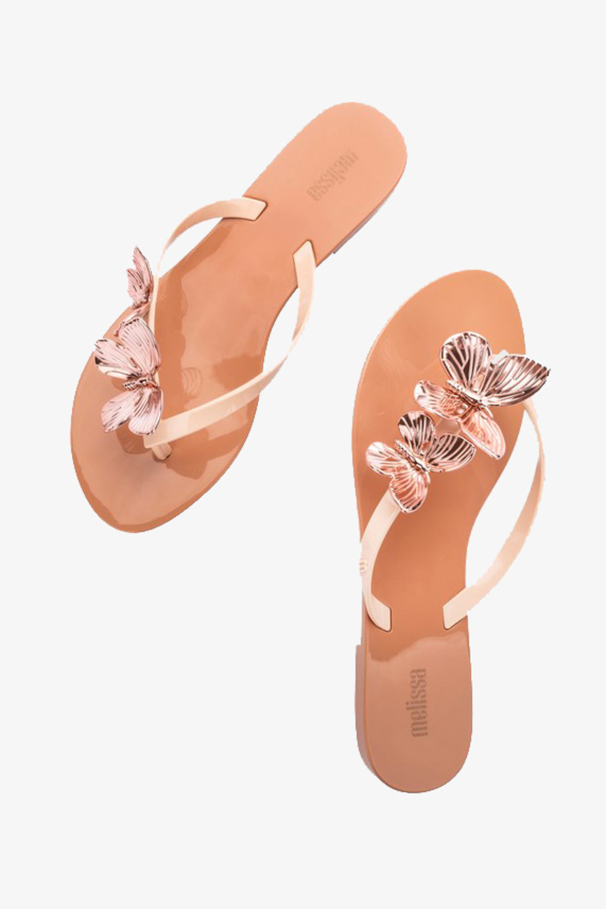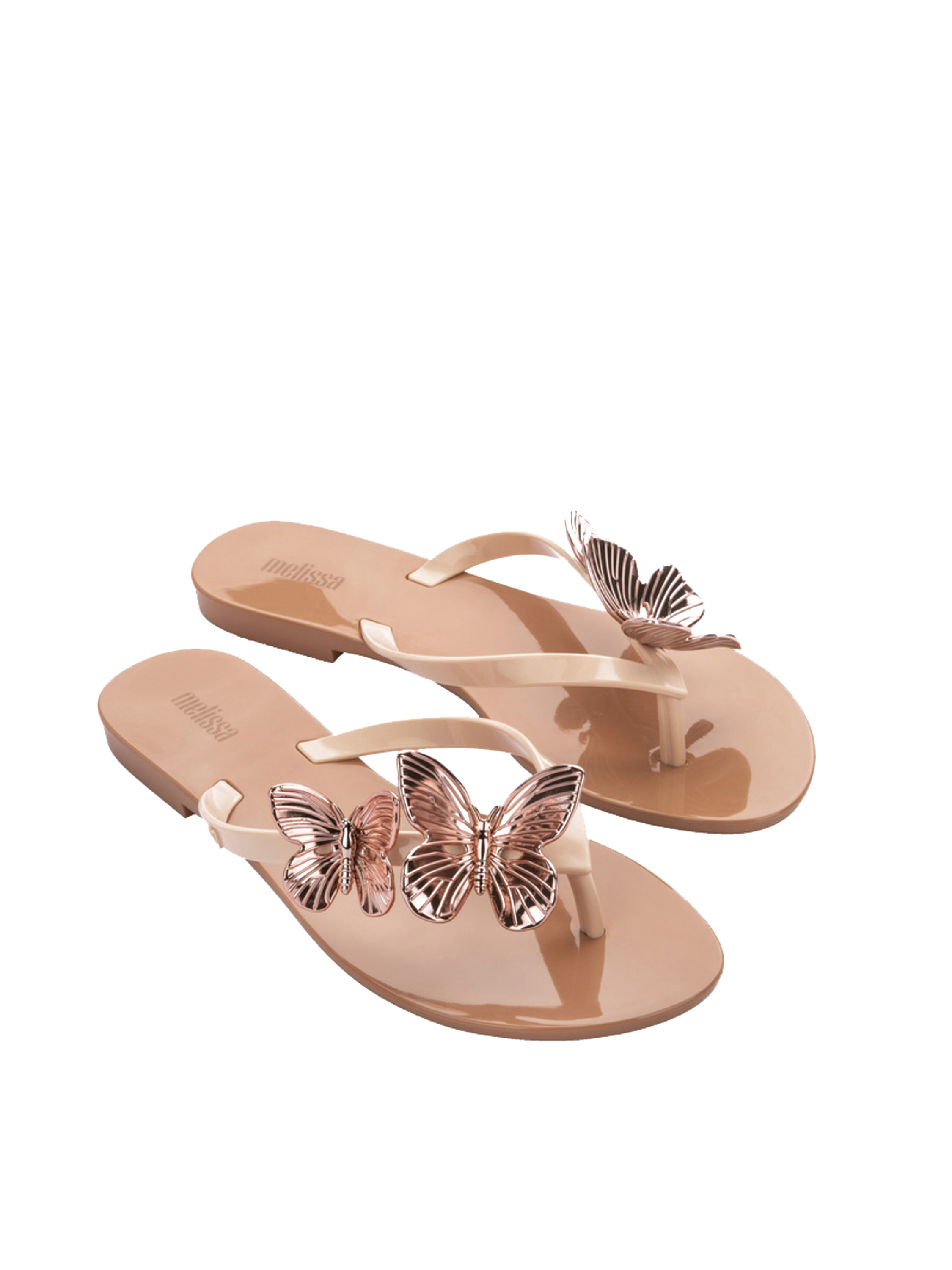 Japonki damskie Melissa Harmonic wykonane są z wygodnego tworzywa Mel-flex, pachnącego gumą balonową. Materiał ten to połączenie kauczuku i naturalnej gumy, co sprawia, że są biodegradowalne. Zostały zaprojektowane tak, aby jak najlepiej dopasowywały się do kształtu stopy. Są lekkie i wygodne w codziennym użytkowaniu. Model z dwoma cienkimi paskami wzbogacony został o stylową ozdobę w postaci motyli.