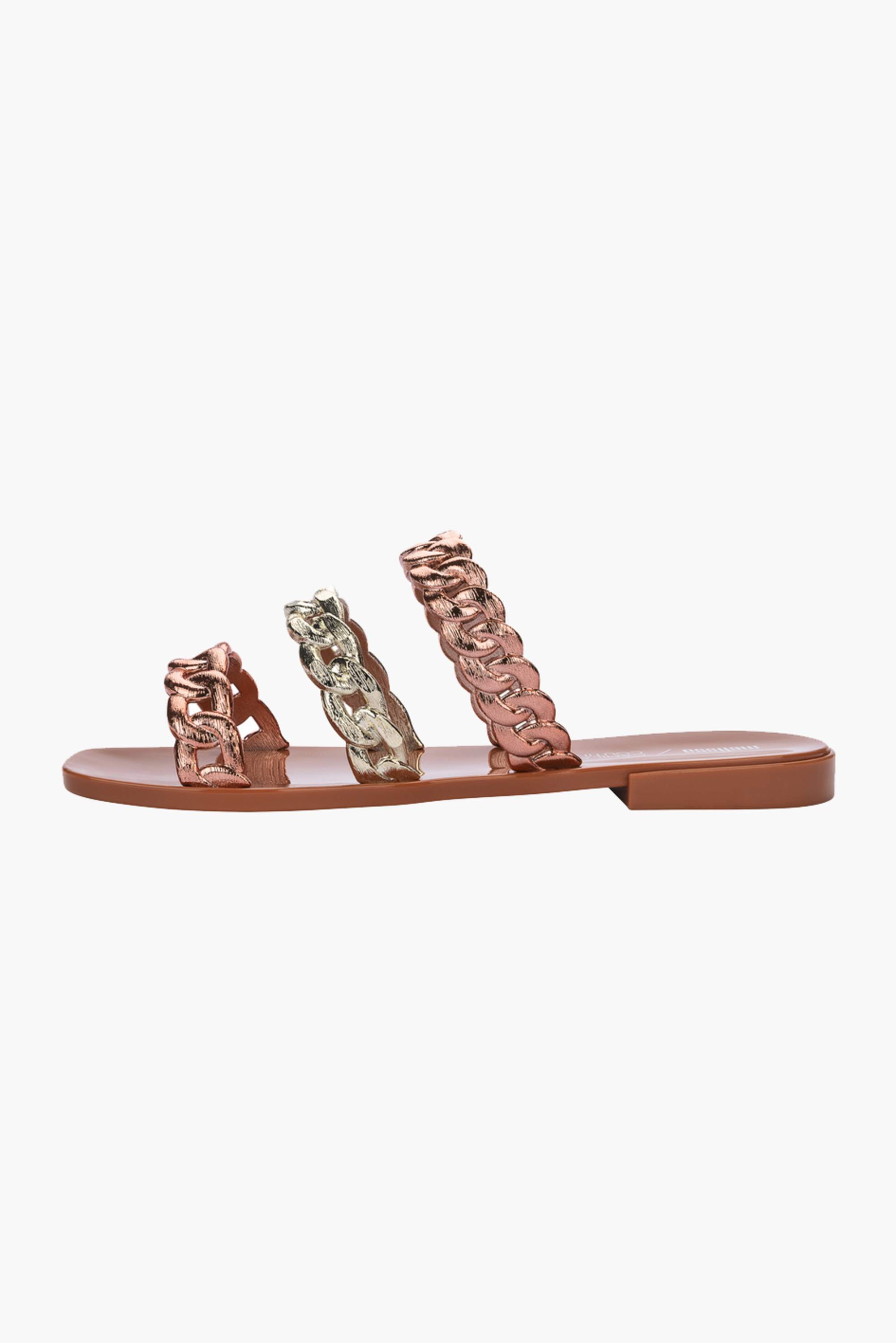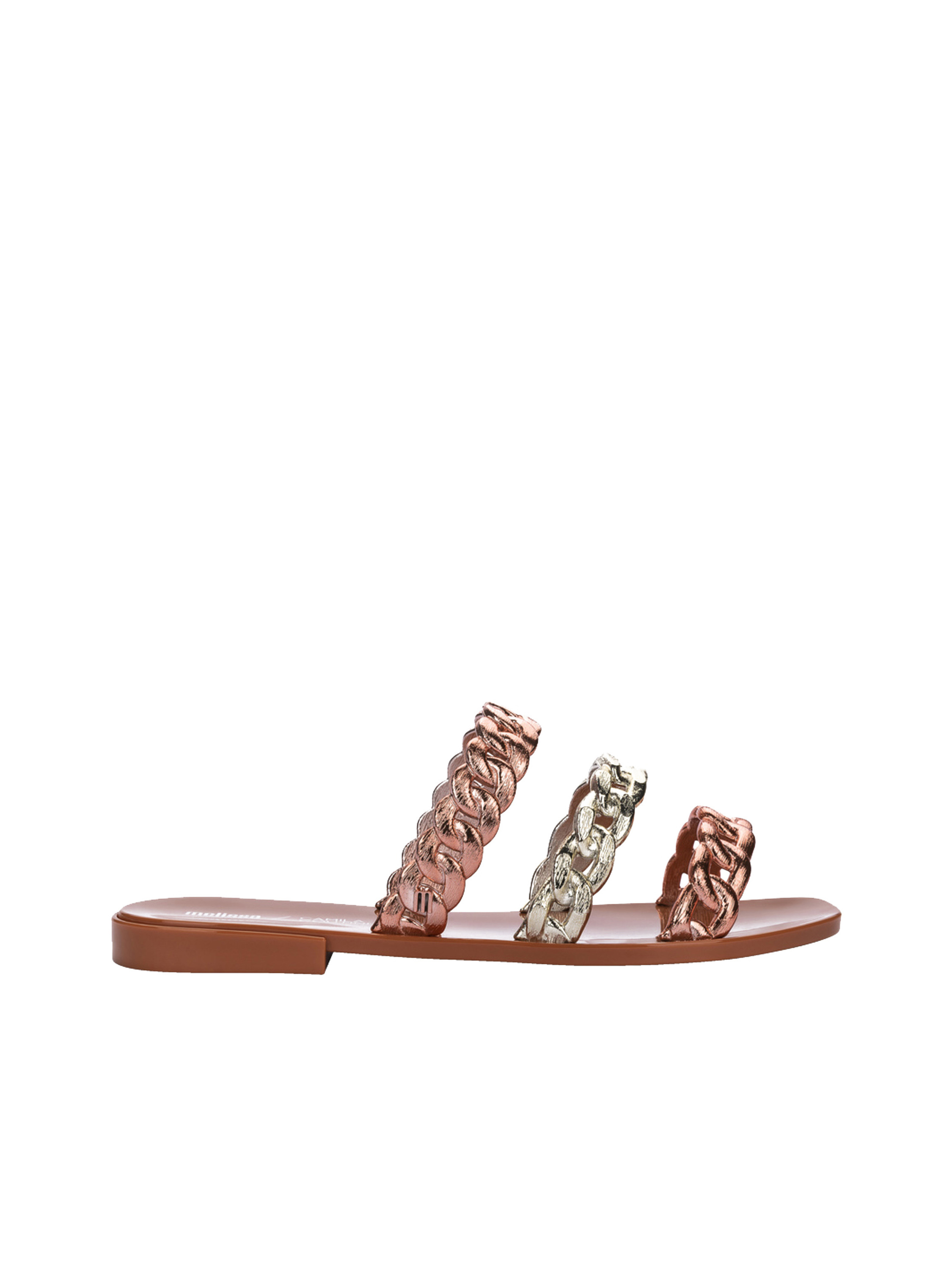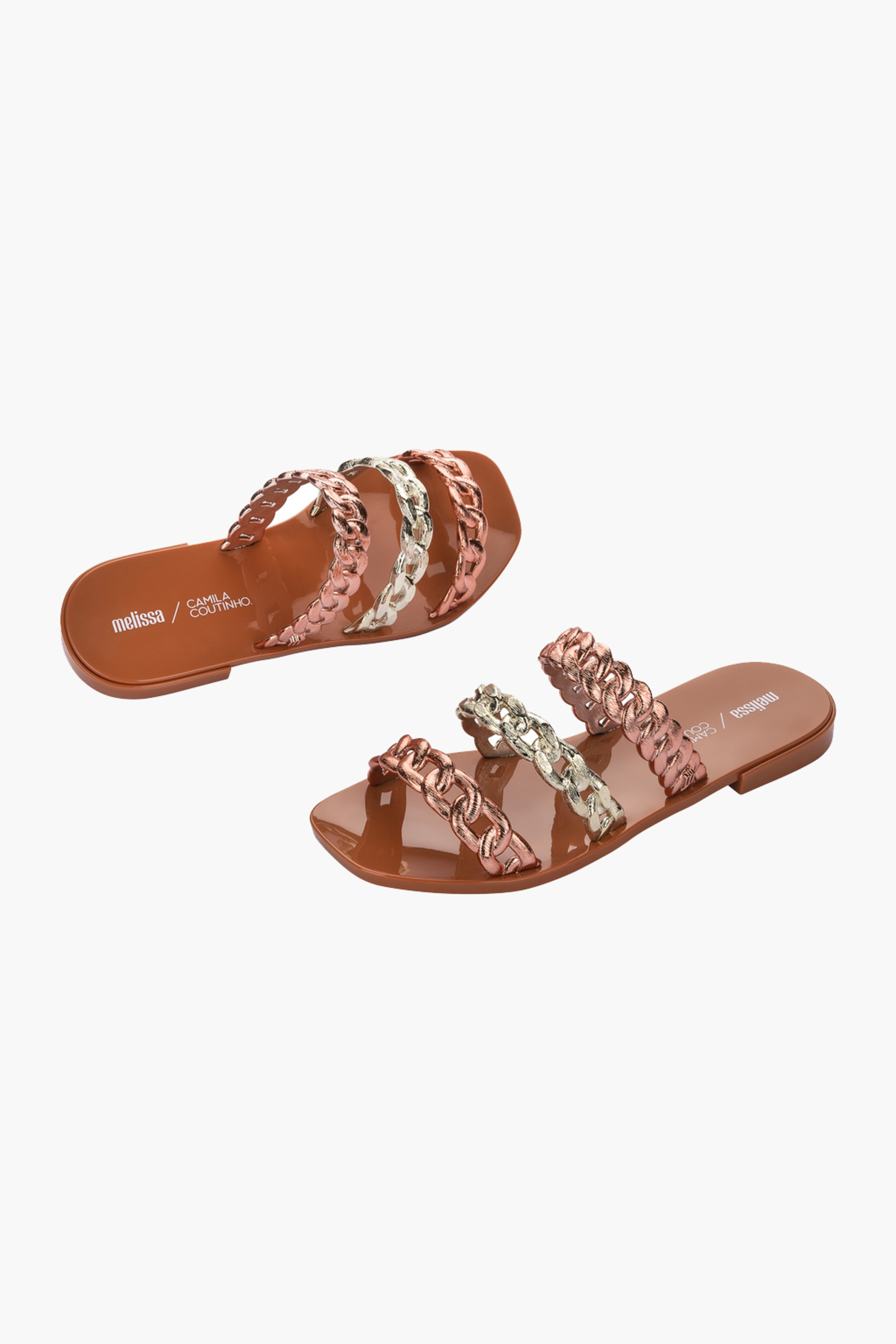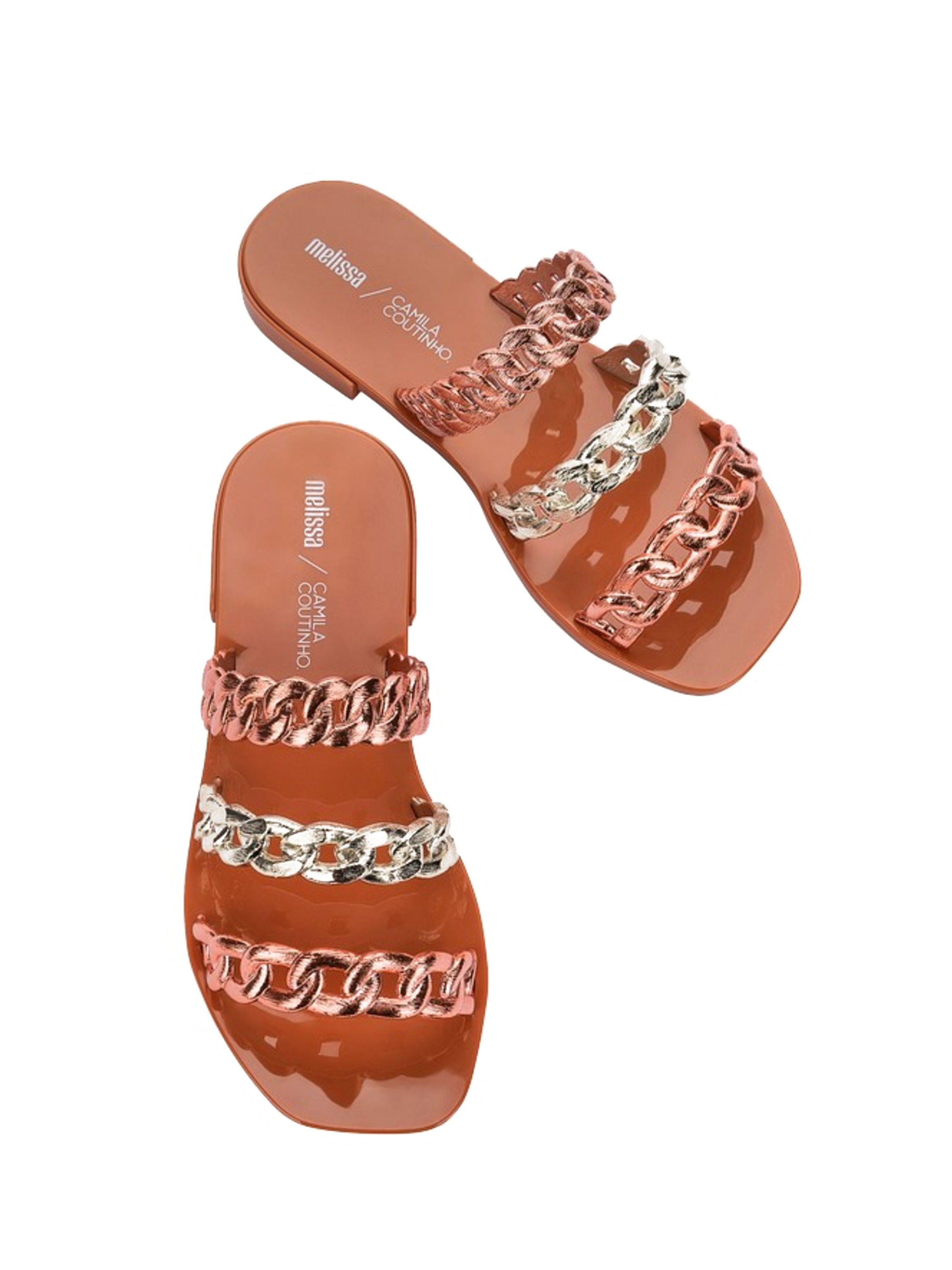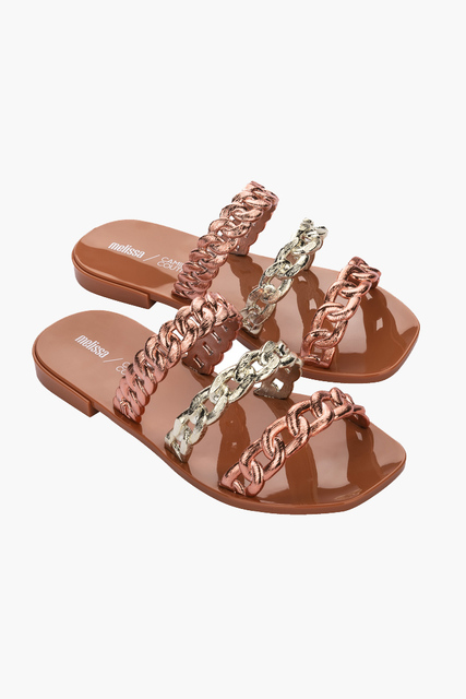Klapki damskie Melissa Shiny wykonane są z wygodnego tworzywa Mel-flex, pachnącego gumą balonową. Materiał ten to połączenie kauczuku i naturalnej gumy, co sprawia, że są biodegradowalne. Zostały zaprojektowane tak, aby jak najlepiej dopasowywały się do kształtu stopy. Są lekkie i wygodne w codziennym użytkowaniu. Model zbudowany z cienkich, pasków przypominających łańcuch.