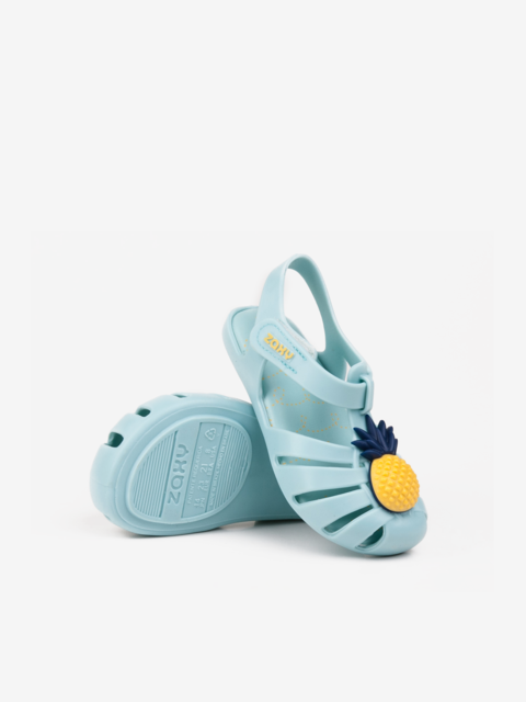 Dziewczęce i urocze sandałki marki Zaxy, wykonane z elastycznego, przyjaznego dla skóry tworzywa. Miękka wkładka oraz zapięcie na rzep zapewnią wygodę i dopasowanie się do stopy. Ciekawa aplikacja w postaci żółtego ananasa przykuwa wzrok, więc będzie to idealna propozycja dla najmłodszych miłośniczek gumowych butów.