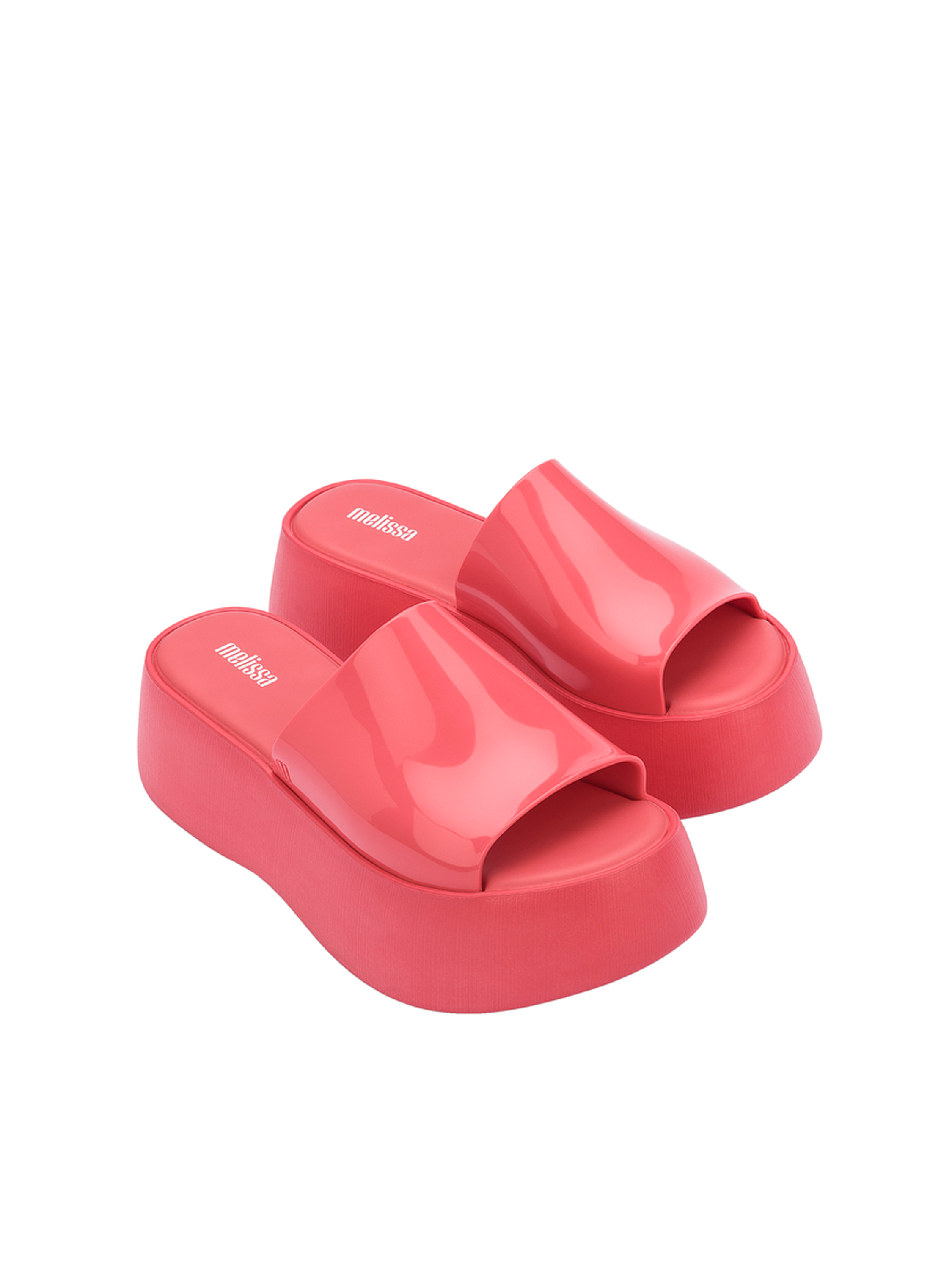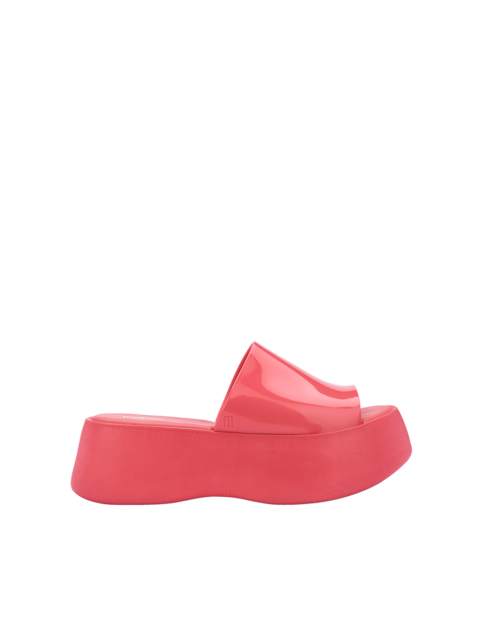 Wsuwane klapki na platformie wykonane są z kultowego tworzywa Mel-Flex, które pachnie gumą balonową. Materiał ten to mieszanka przetworzonego plastiku i kauczuku. Łatwo zachować go w czystości, a jego elastyczność sprawia, że doskonale dopasowują się do stopy. Wygodna wkładka oraz stabilna, masywna podeszwa odpowiada za komfort chodzenia przez cały dzień. Wodoodporne. Klapki w modowym kolorze będą uzupełnieniem letnich stylizacji.
