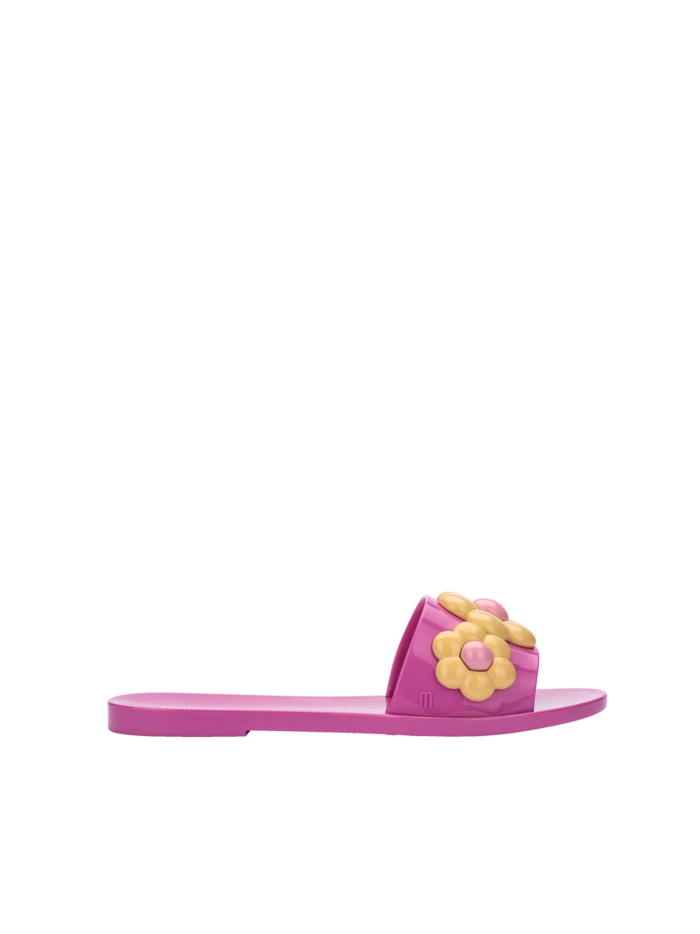 Klapki damskie Melissa wykonane są z wygodnego tworzywa Mel-flex, pachnącego gumą balonową. Materiał ten to połączenie kauczuku i naturalnej gumy, co sprawia, że są biodegradowalne. Zostały zaprojektowane tak, aby jak najlepiej dopasowywały się do kształtu stopy. Są lekkie i wygodne w codziennym użytkowaniu. Model z jednym szerokim paskiem  wzbogacony został o stylową ozdobę w postaci kwiatów. Pastelowe kolory to must have sezonu.