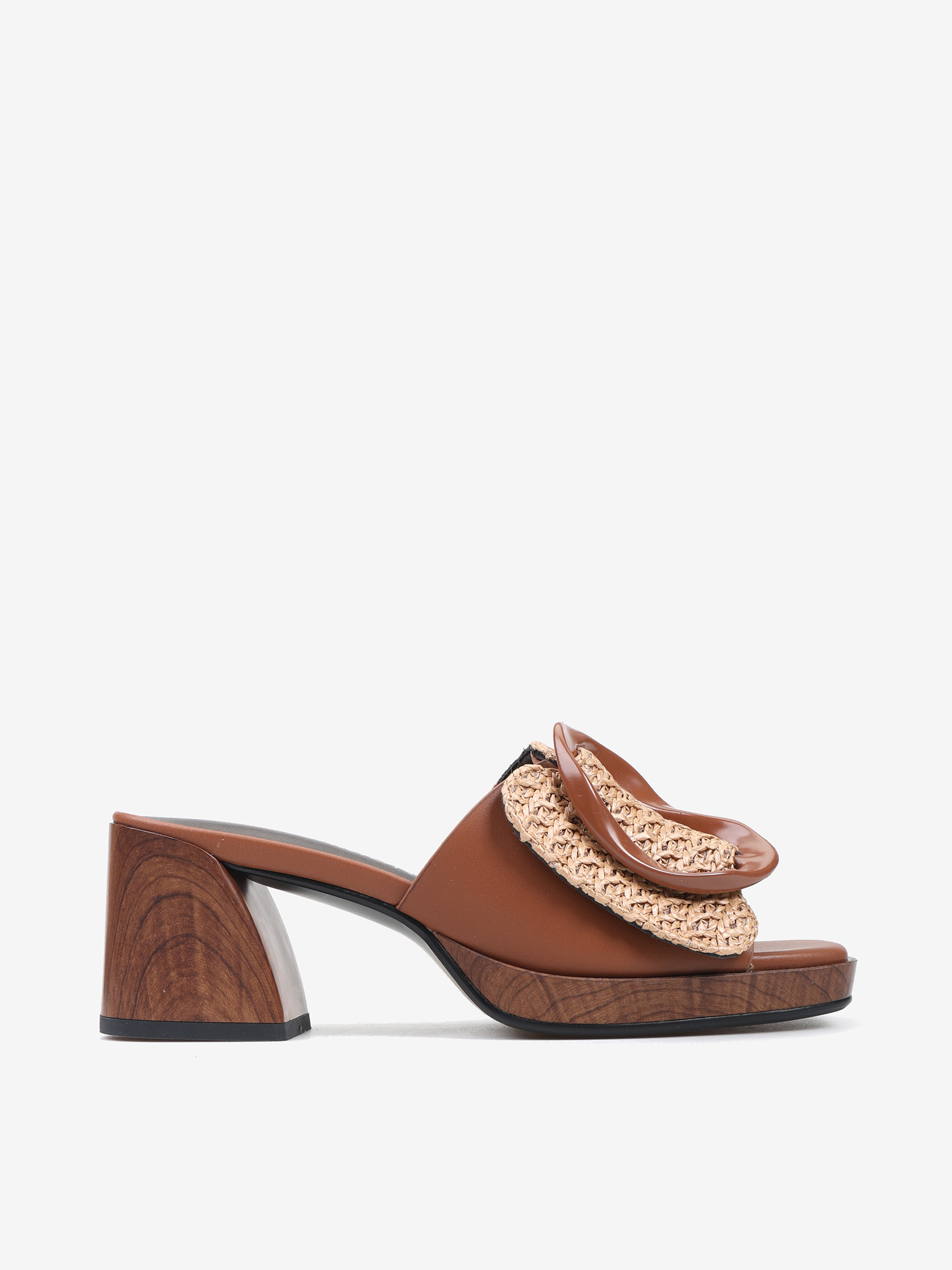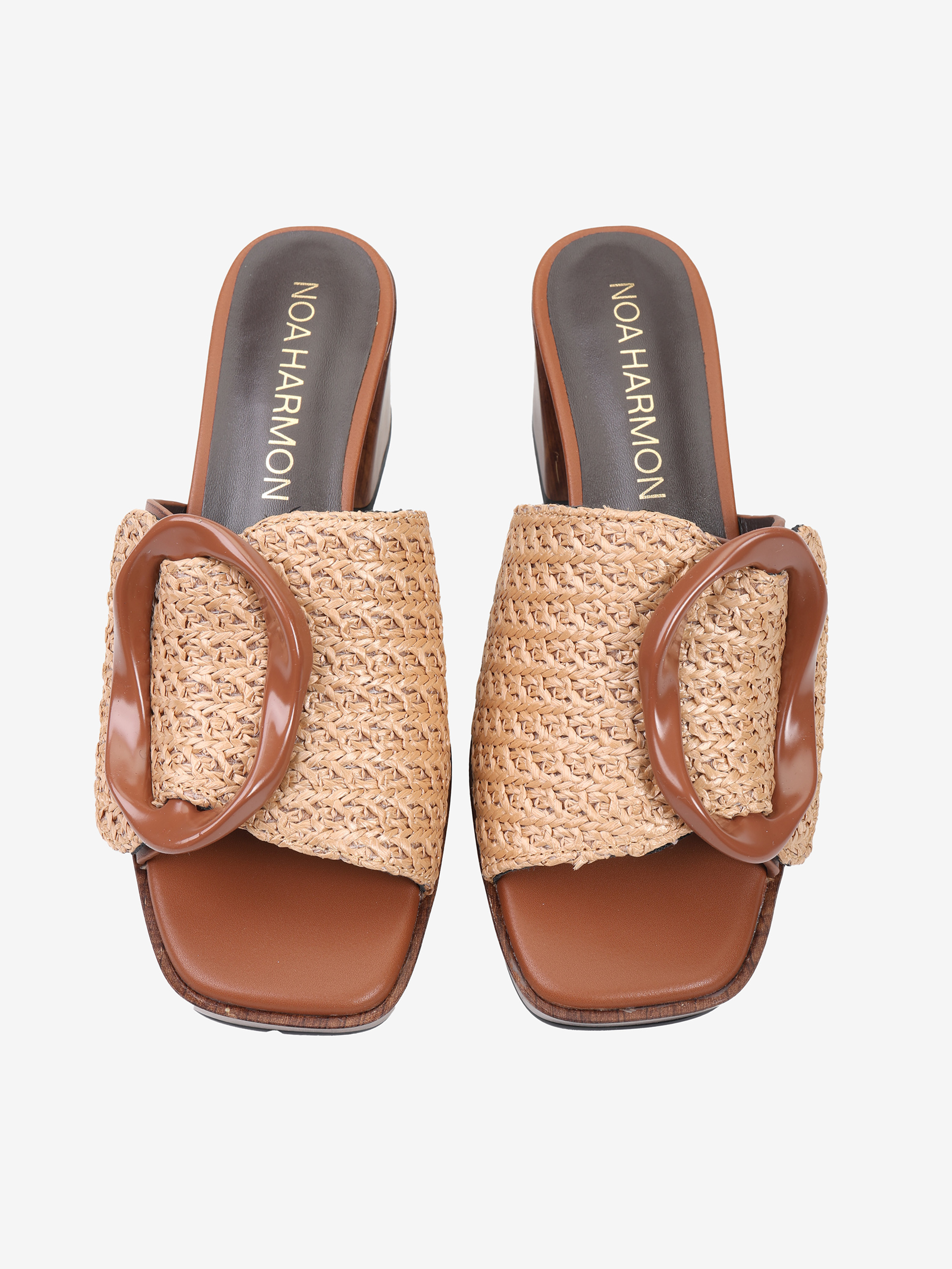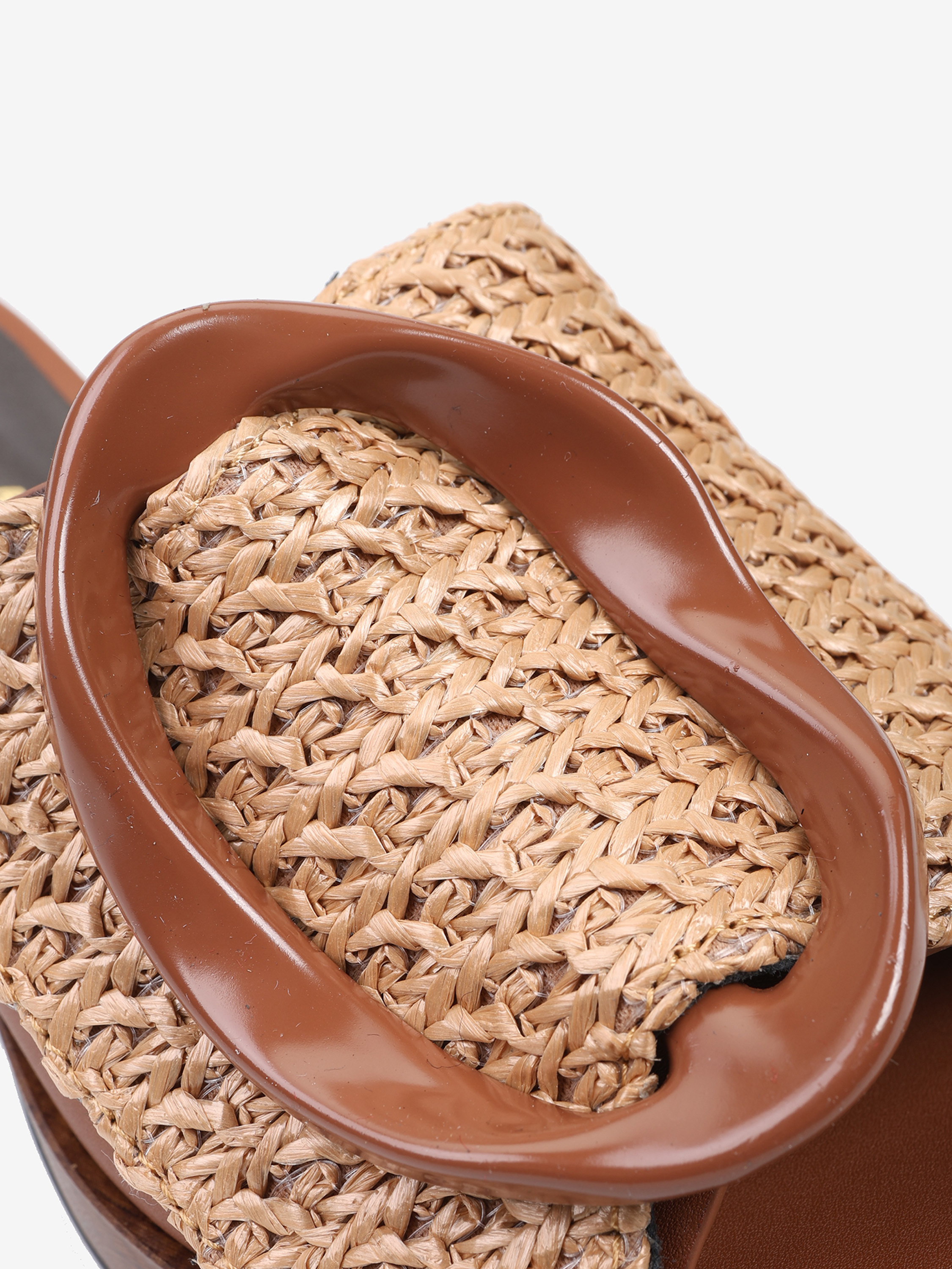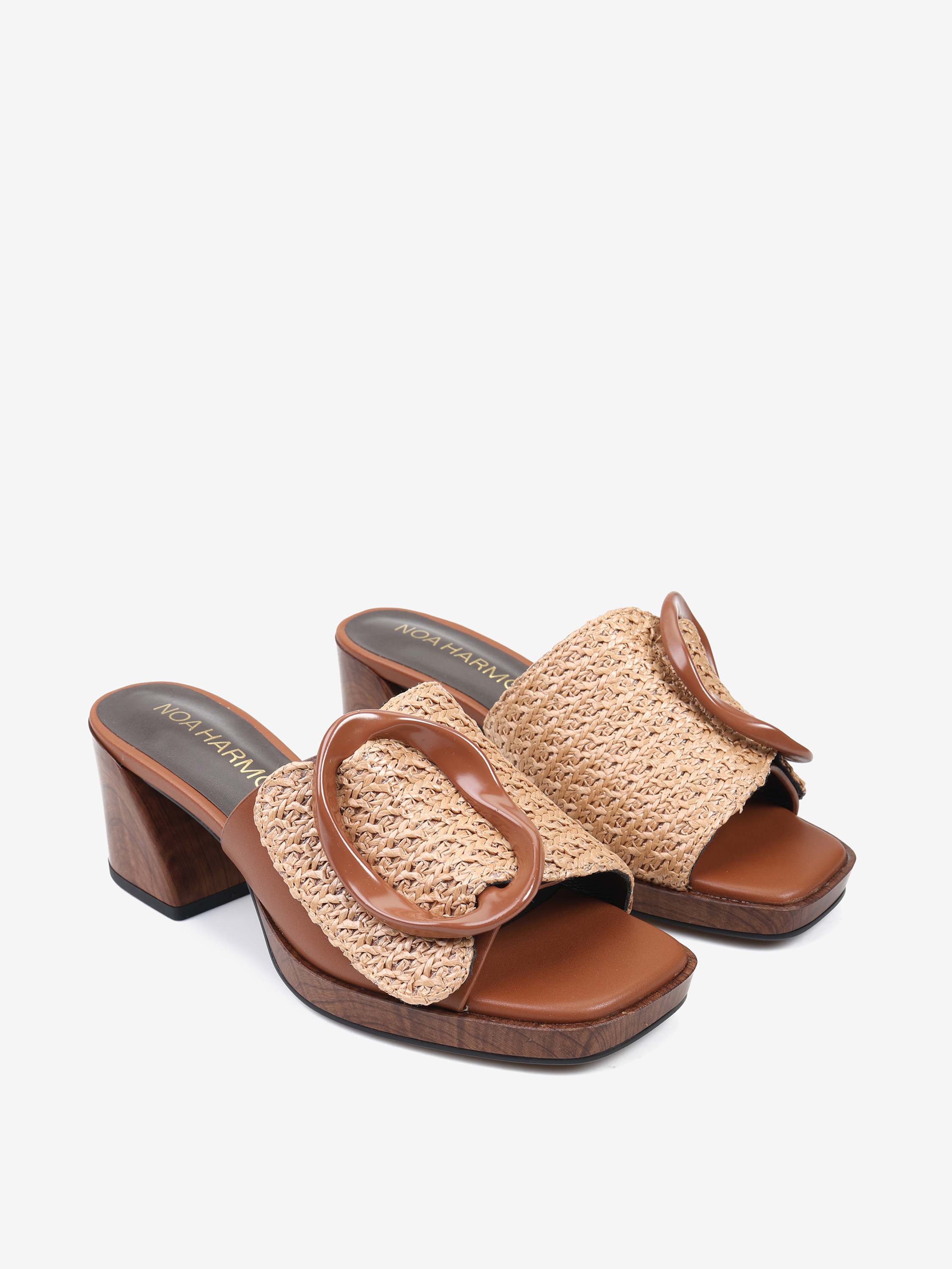 Klapki NOA HARMON z szerokim, plecionym paskiem i ozdobną klamrą. Obcas i platforma z efektem drewna.