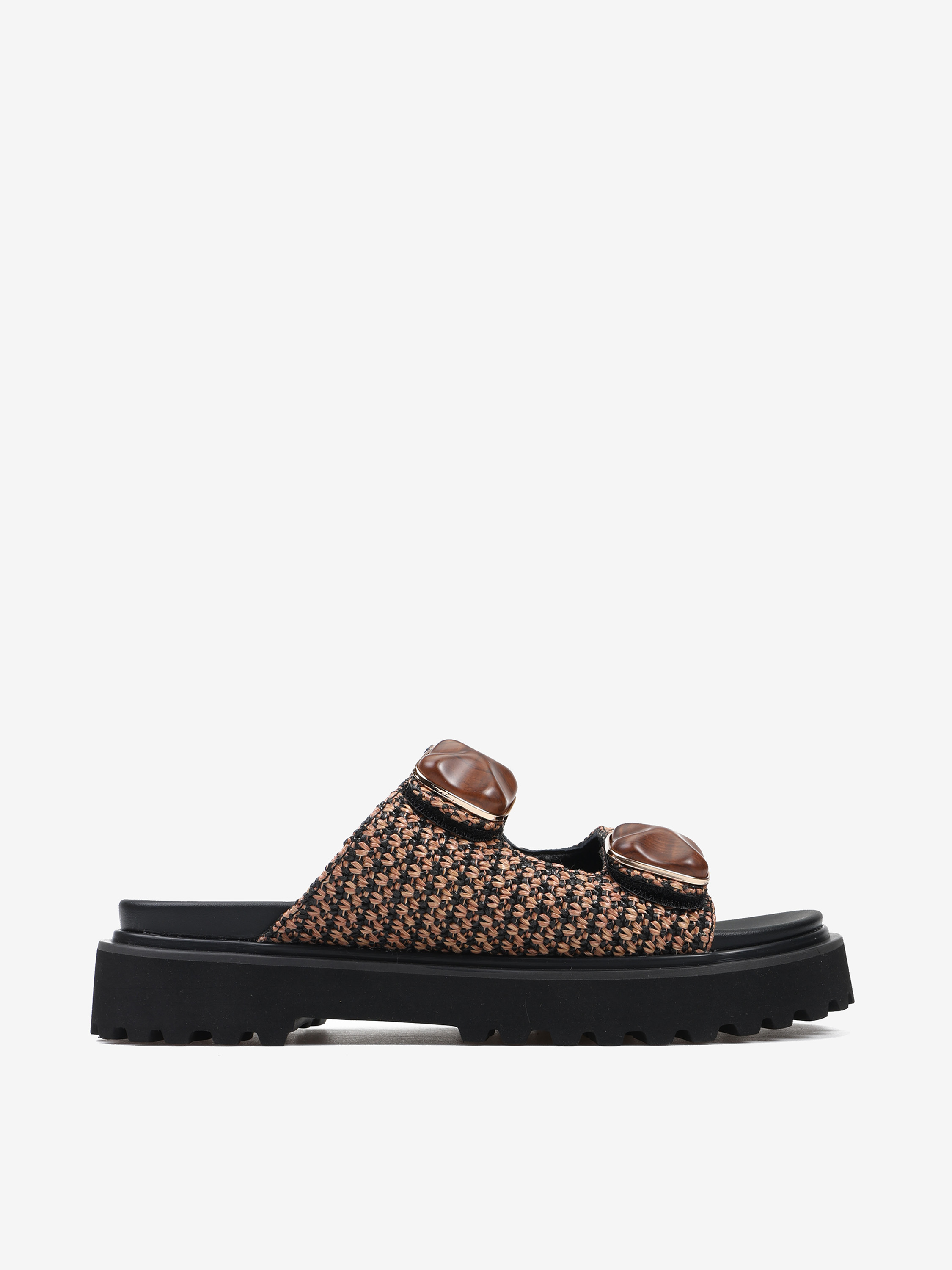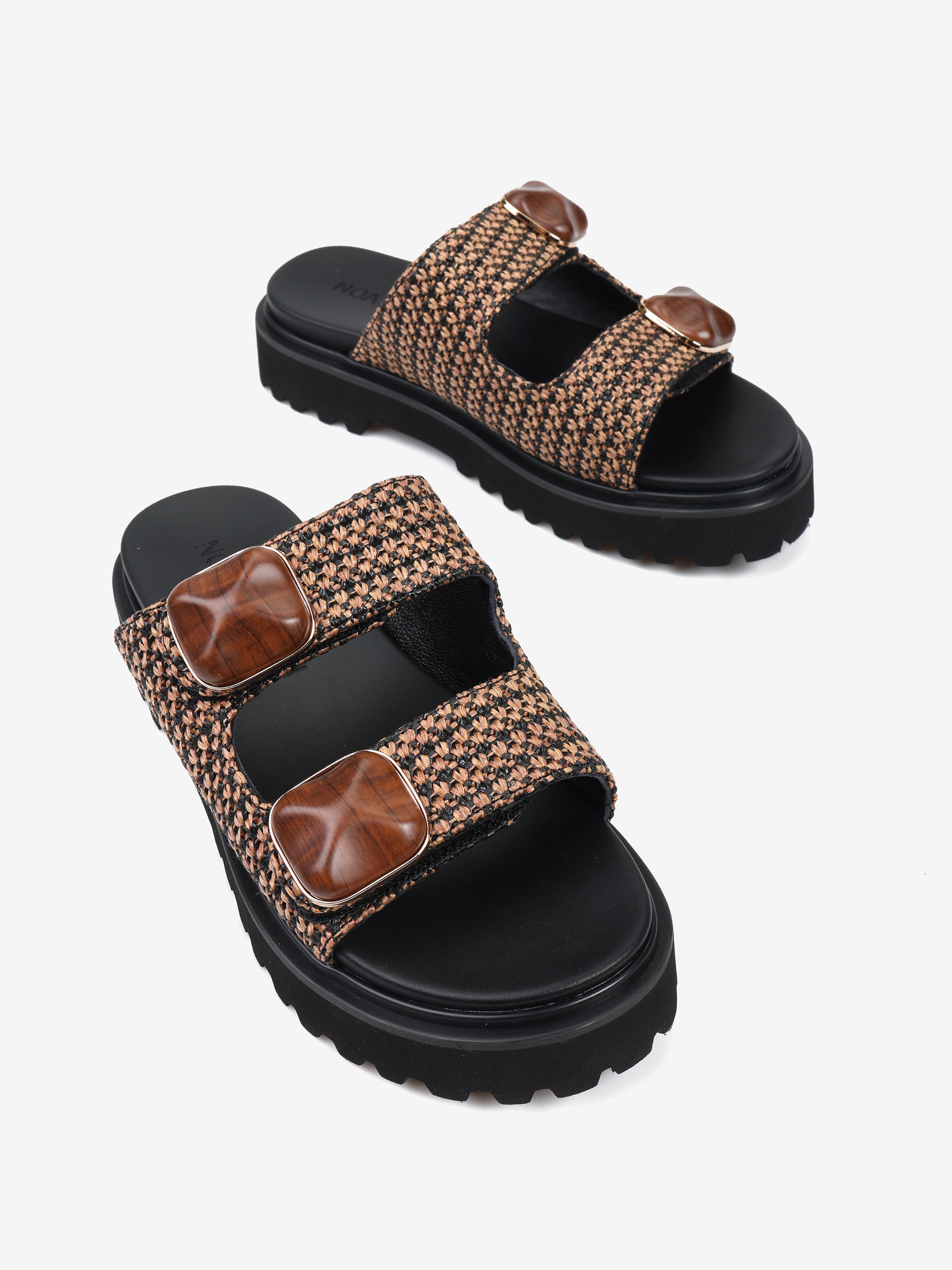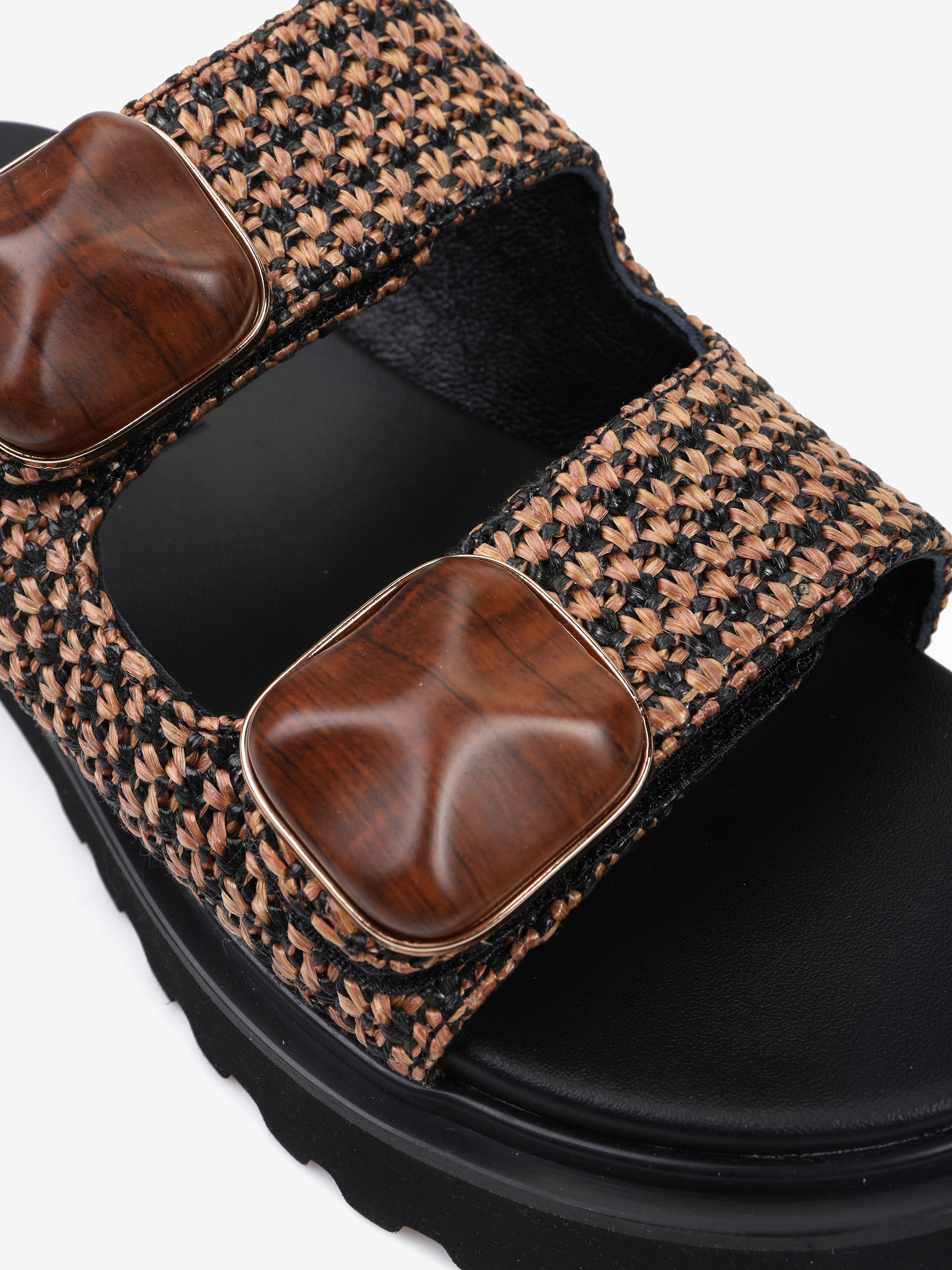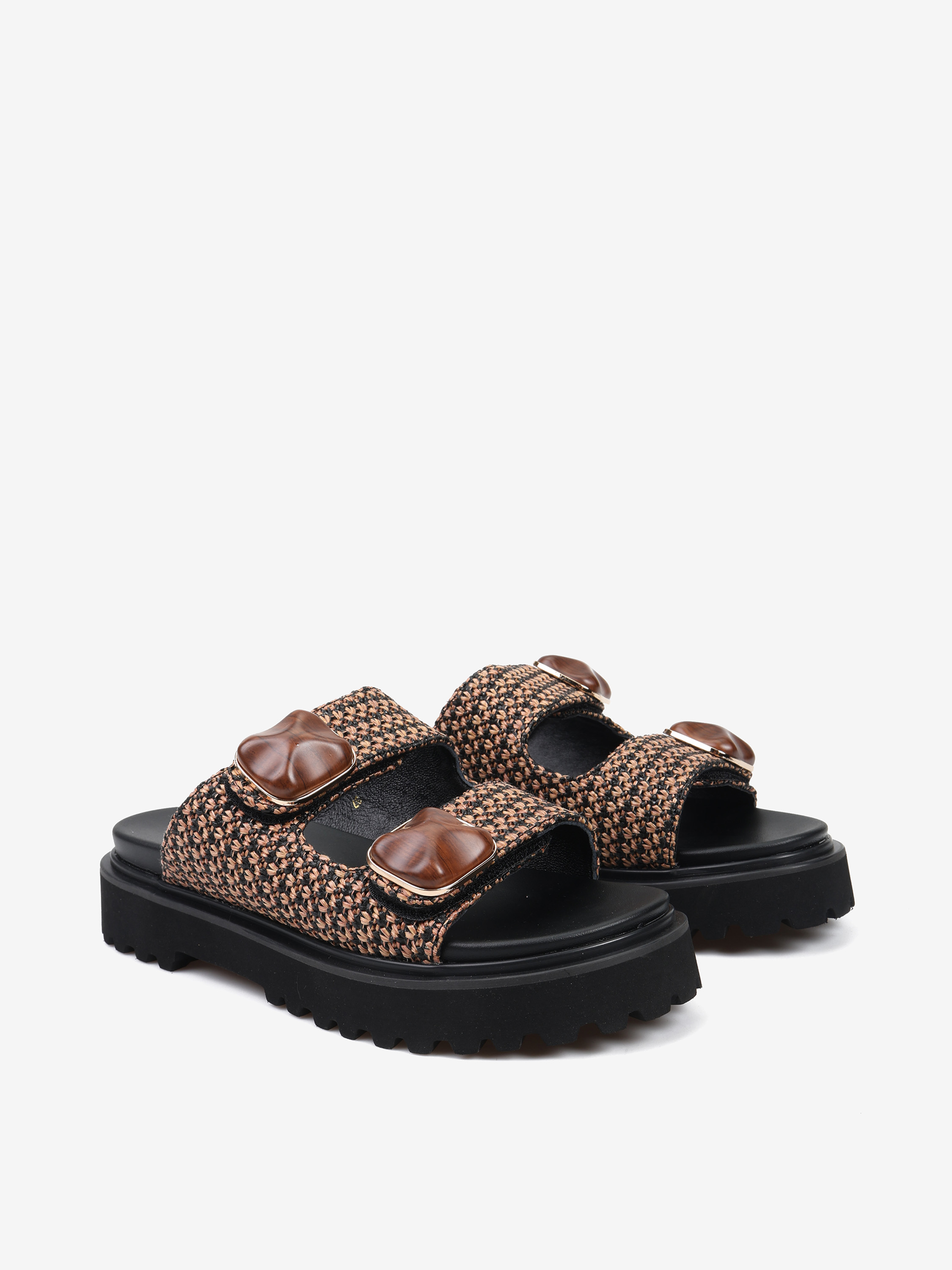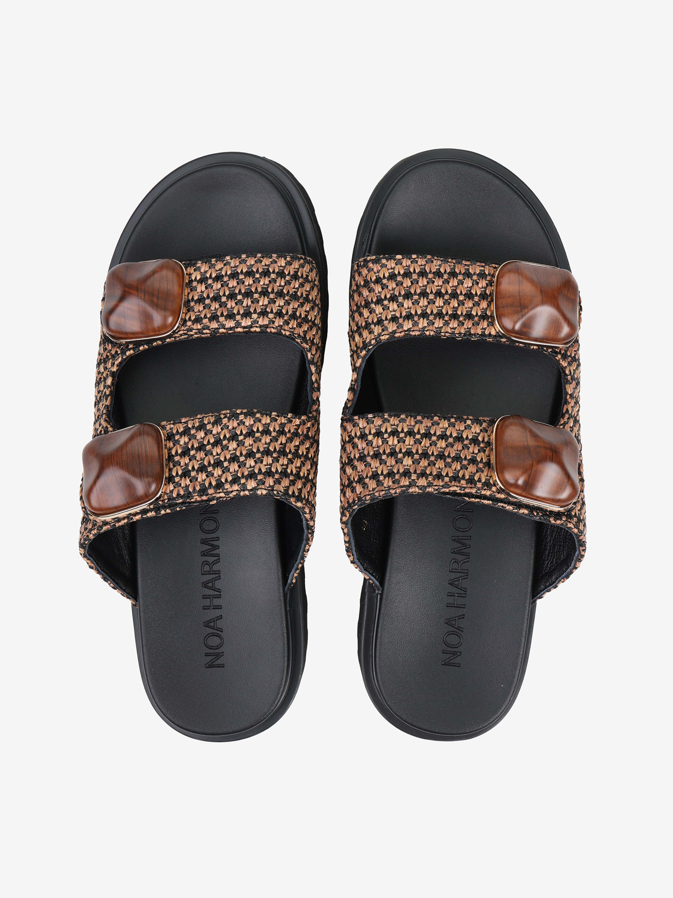 Klapki NOA HARMON z ozdobną aplikacją i plecionymi paskami zapinanymi na rzep. Czarna wkładka i podeszwa.