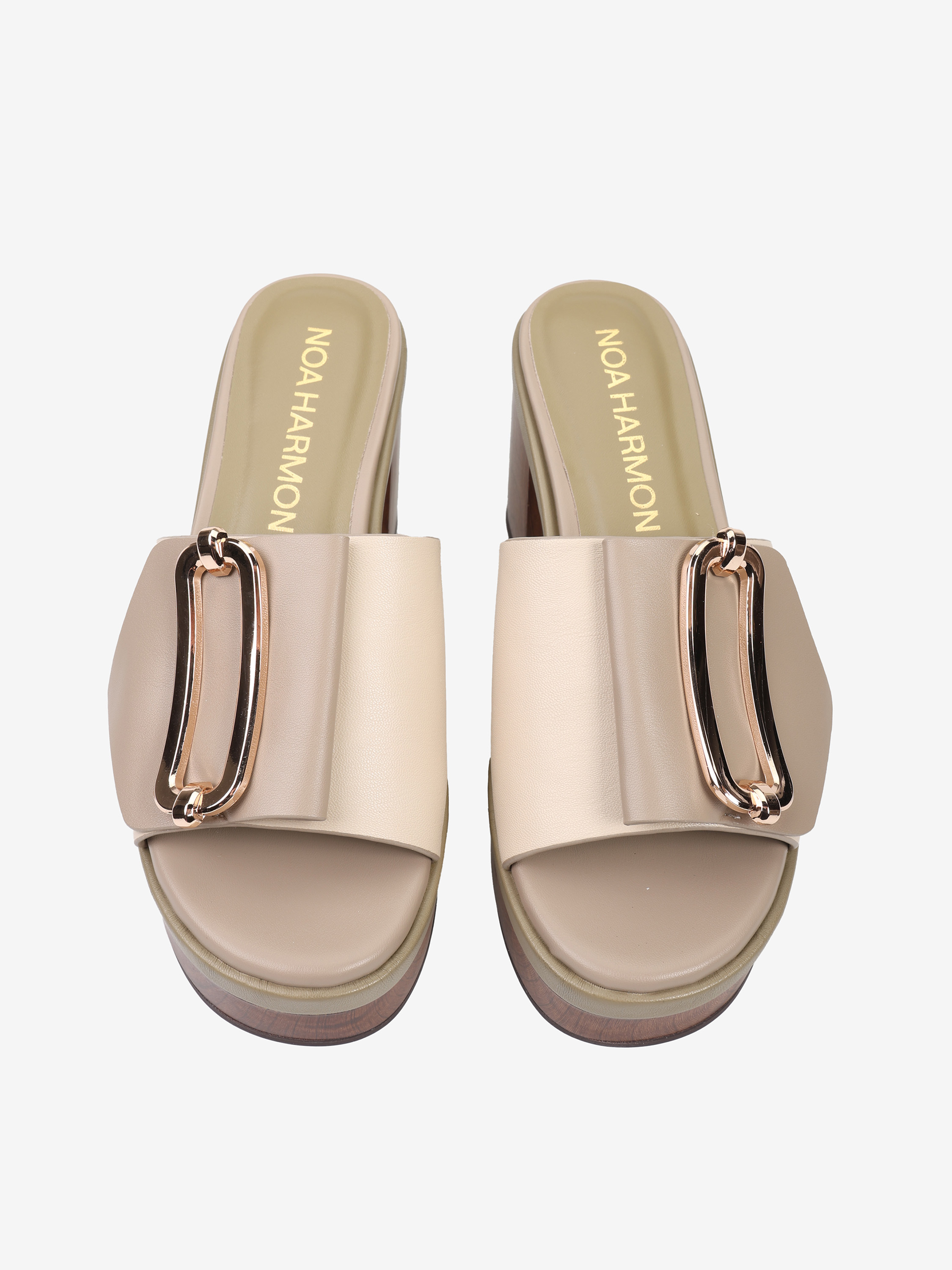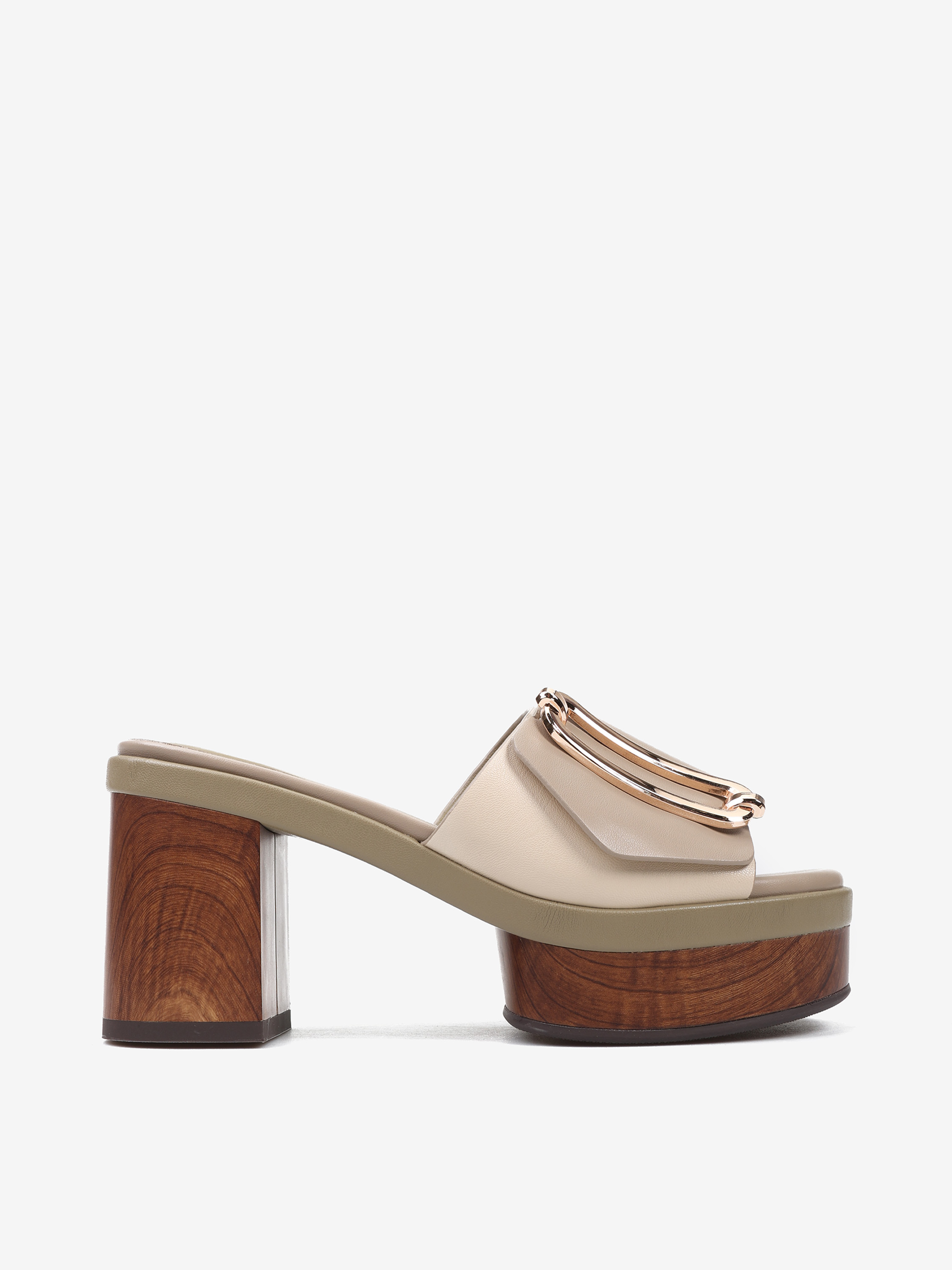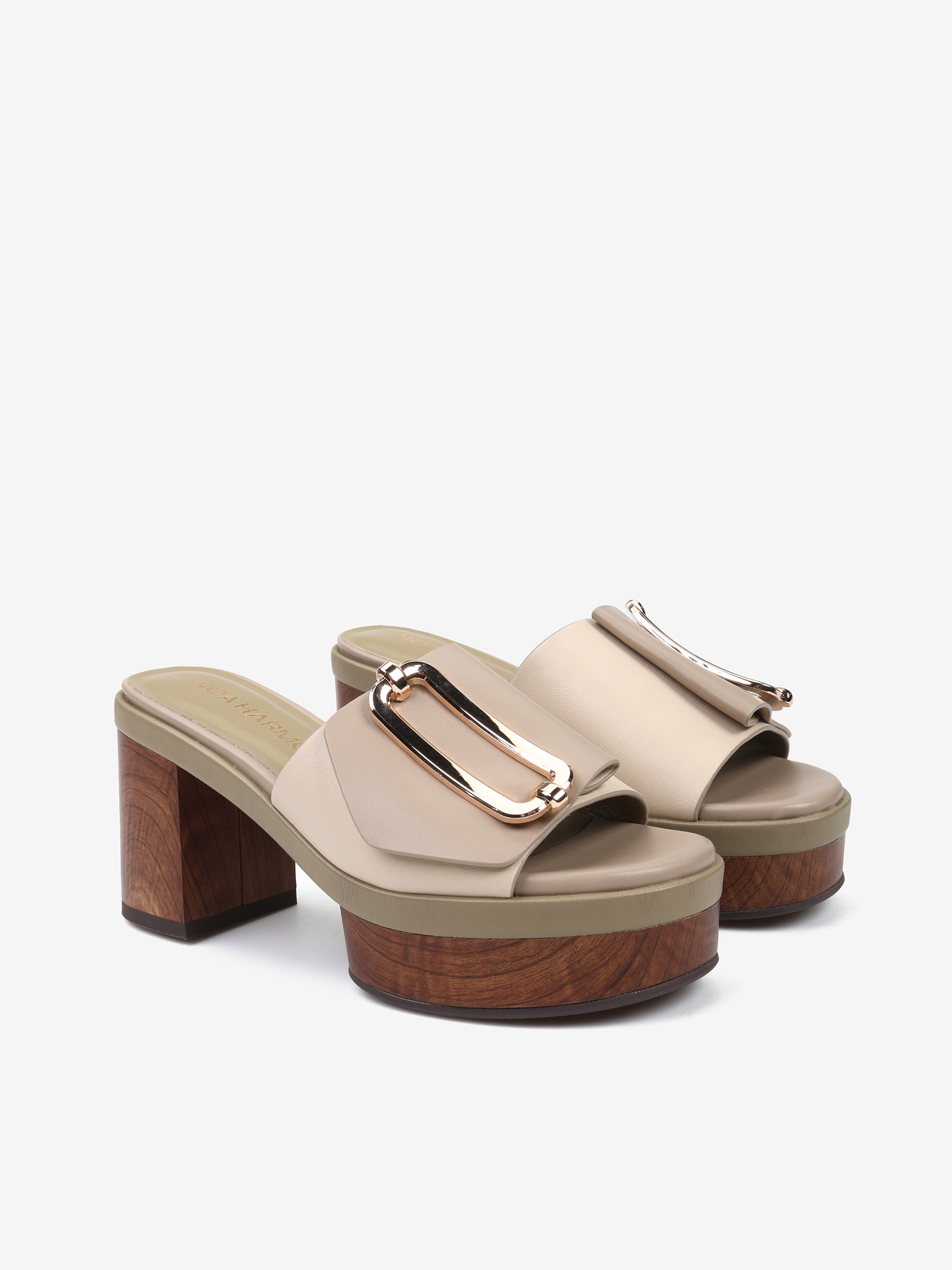 Klapki NOA HARMON z szerokim paskiem i ozdobną klamrą. Obcas i platforma z efektem drewna.