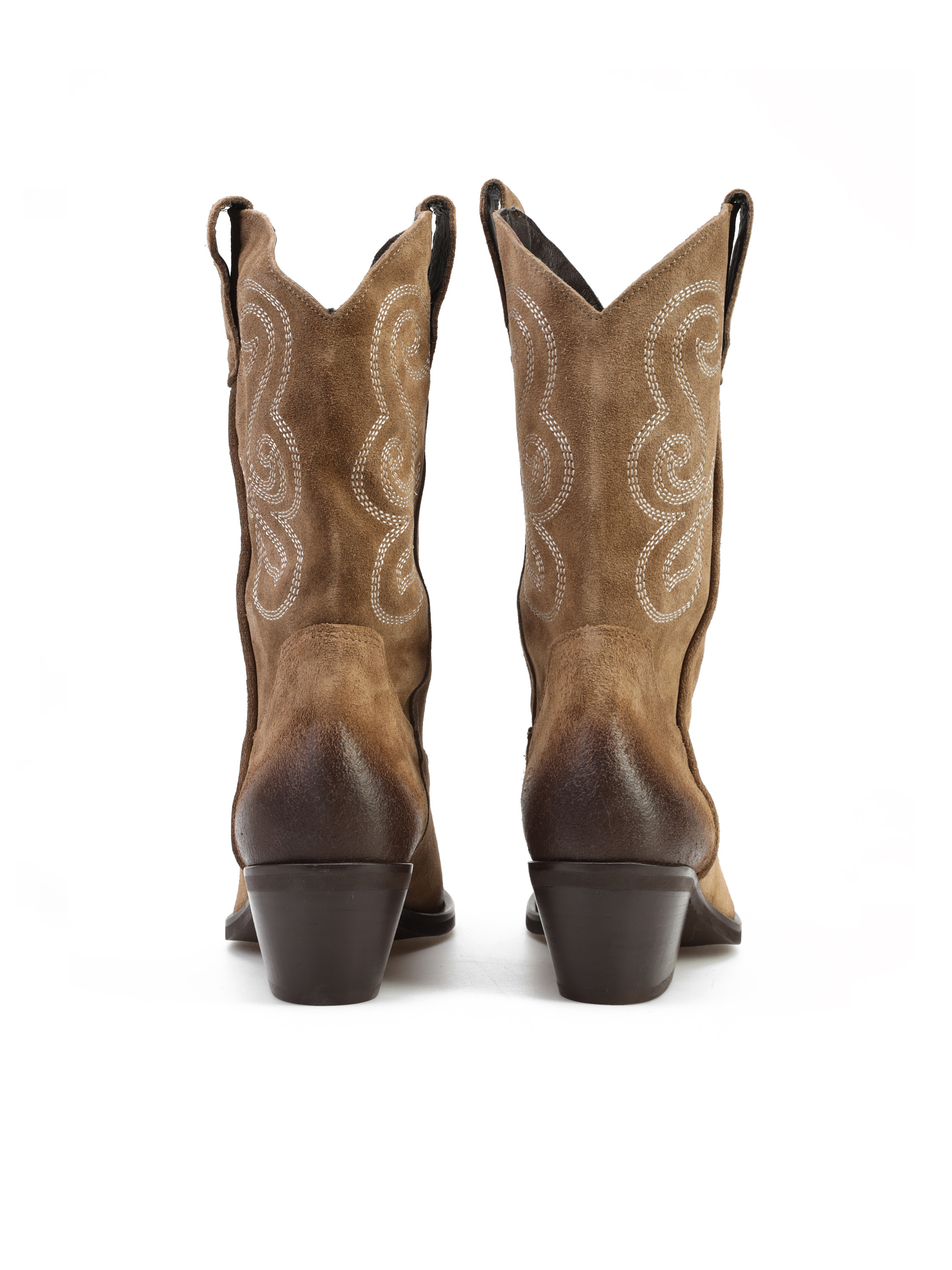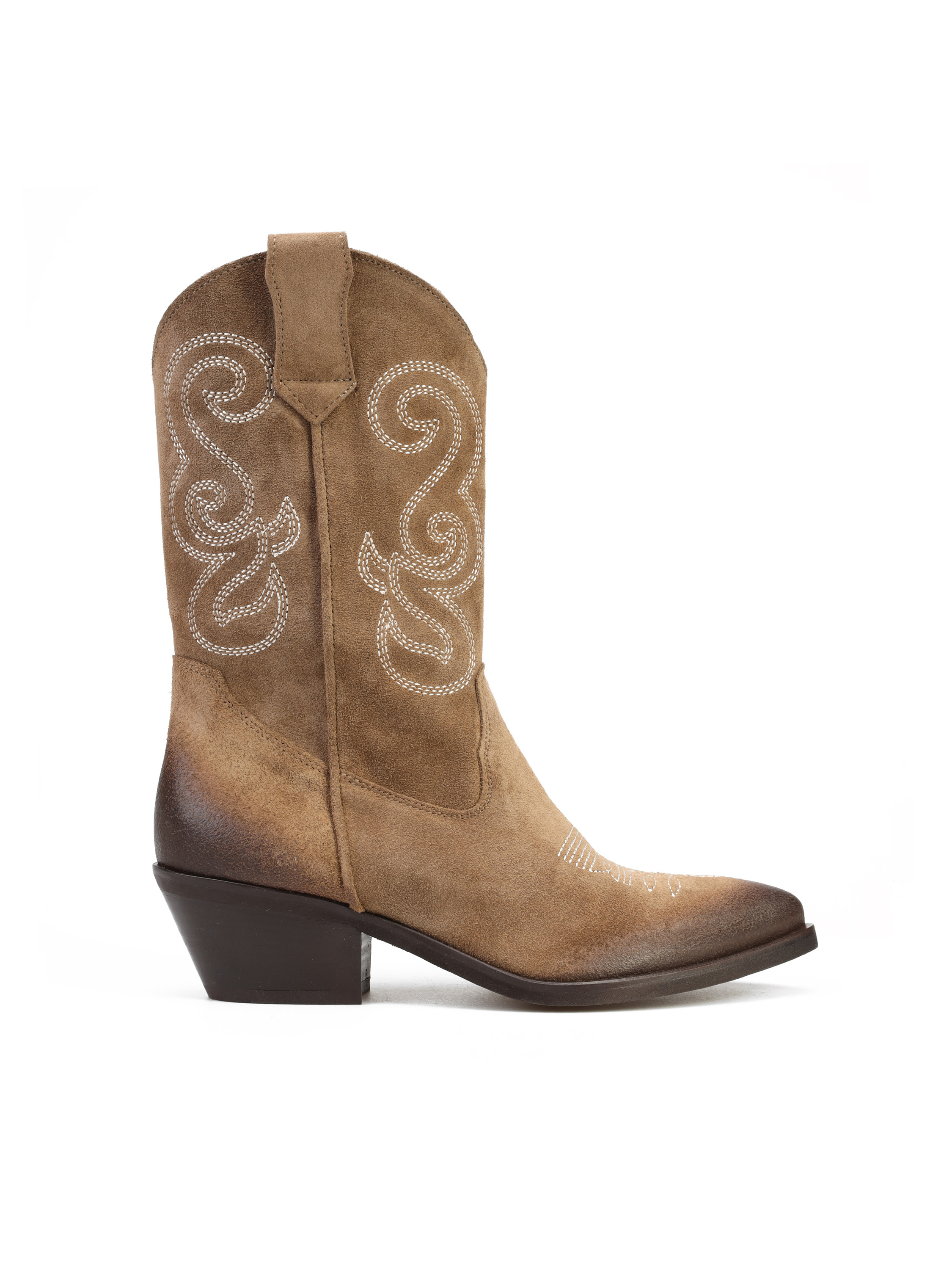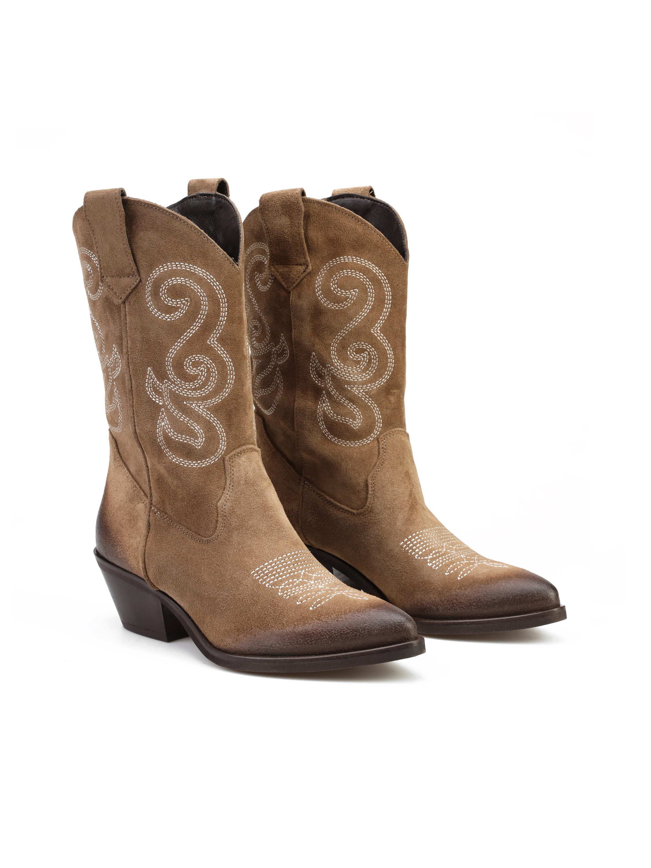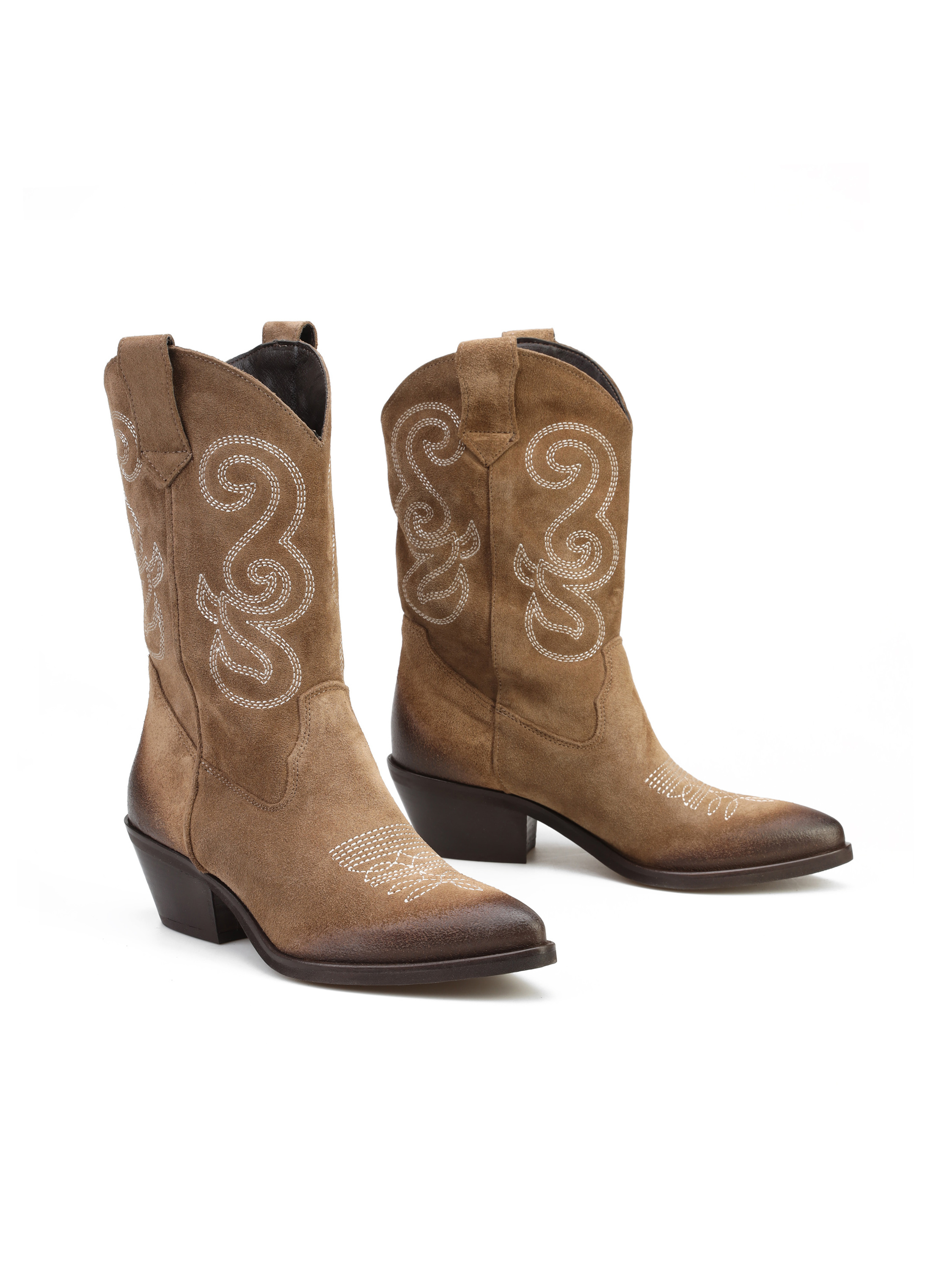 Wsuwane kowbojki to must have sezonu. Cholewka za kostkę w szarym kolorze wykonana jest z włoskiej, zamszowej skóry. Model z charakterystycznym ściętym obcasem na słupku oraz noskiem w szpic. Detale w postaci stylowych przeszyć cholewki oraz przyciemniany nosek, wyróżniają ten model.