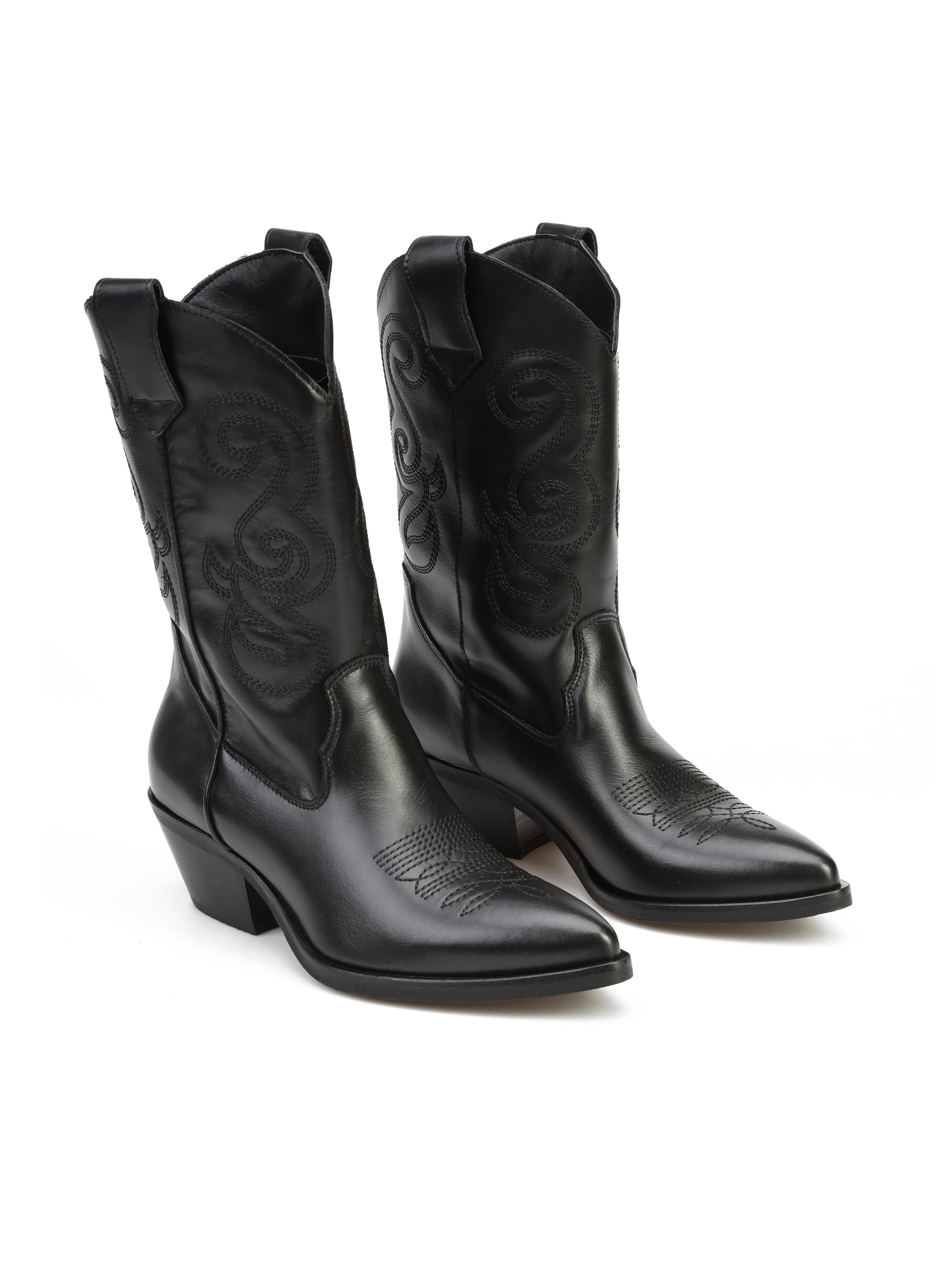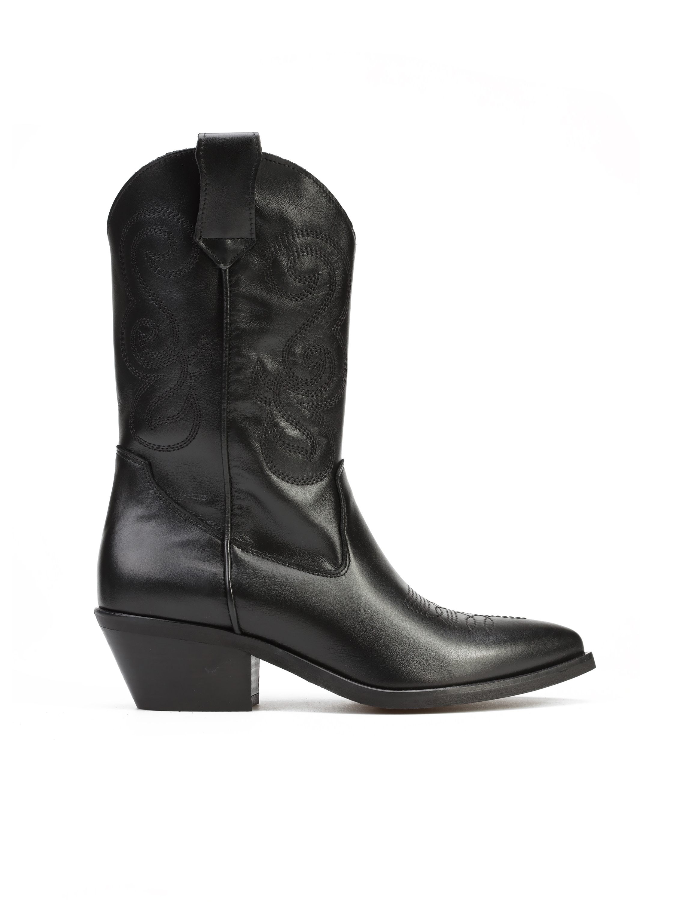 Wsuwane kowbojki to must have sezonu. Cholewka za kostkę w klasycznym, czarnym kolorze wykonana jest z włoskiej skóry naturalnej. Model z charakterystycznym ściętym obcasem na słupku oraz noskiem w szpic. Detale w postaci stylowych przeszyć oraz wycięta cholewka wyróżniają ten model.
