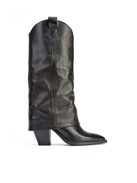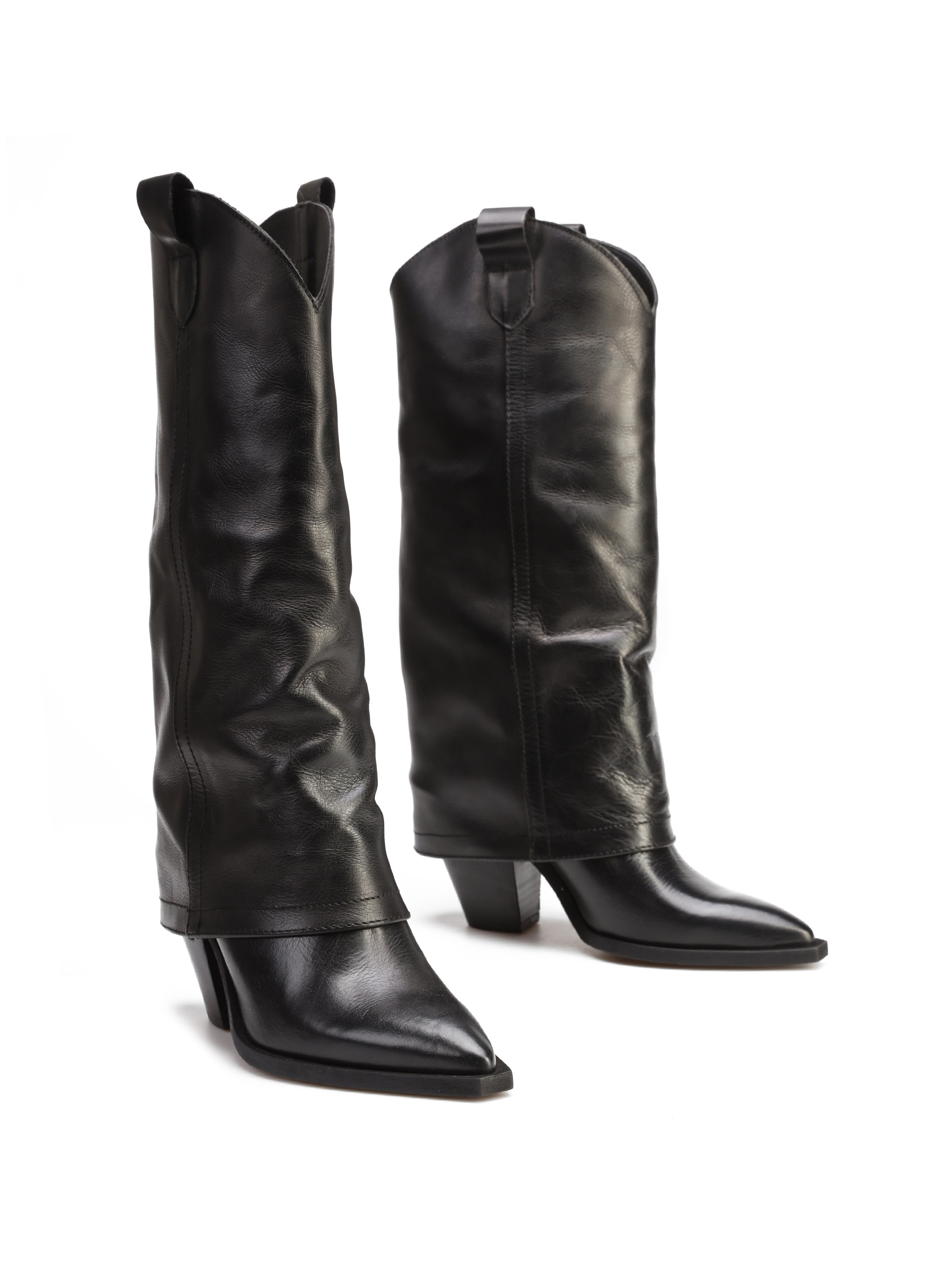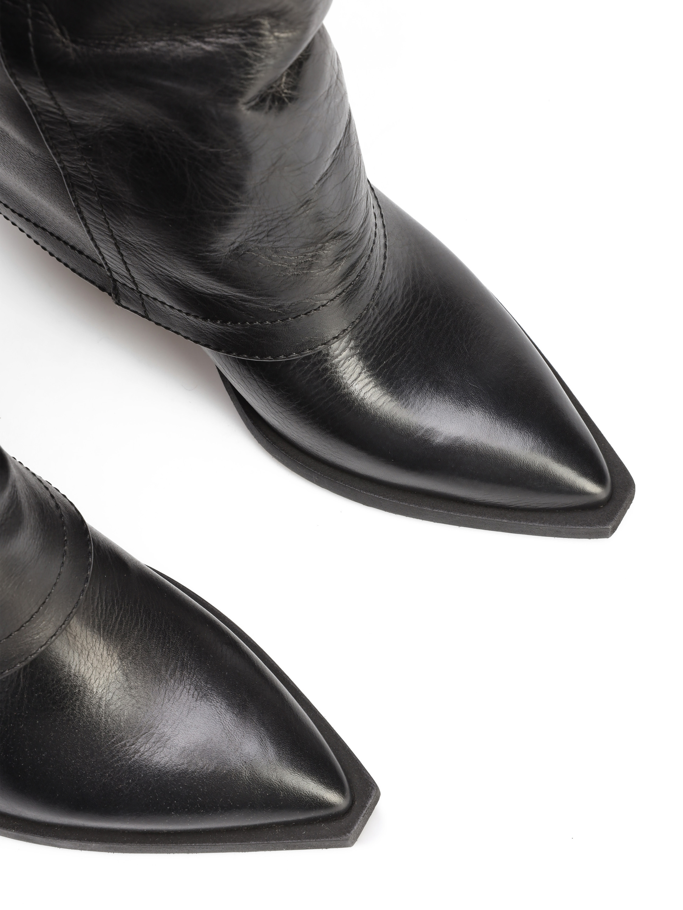 Długie kowbojki to must have sezonu. Wsuwana cholewka w klasycznym, czarnym kolorze wykonana jest z włoskiej skóry naturalnej. Model z charakterystycznym ściętym obcasem na słupku oraz noskiem w szpic.