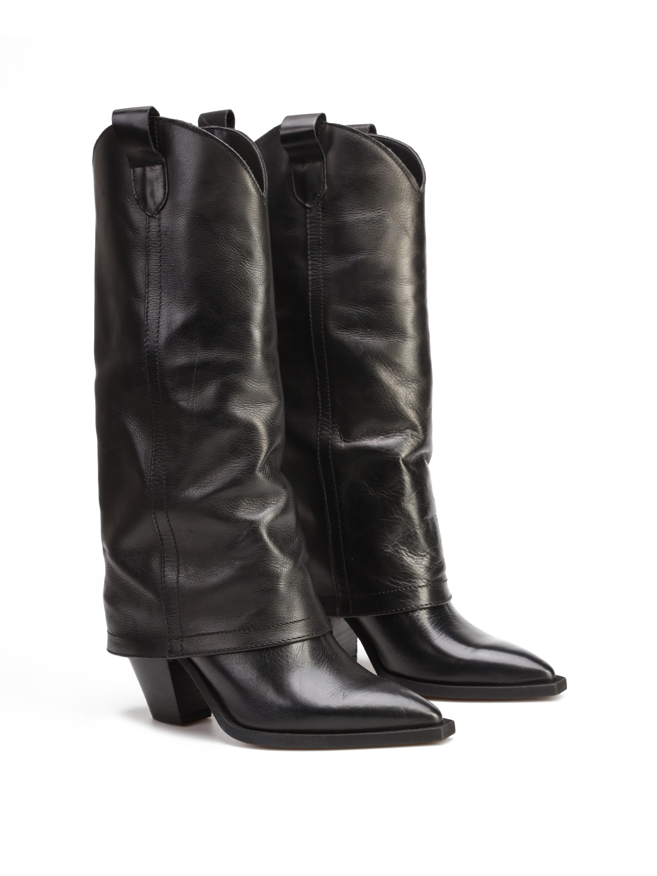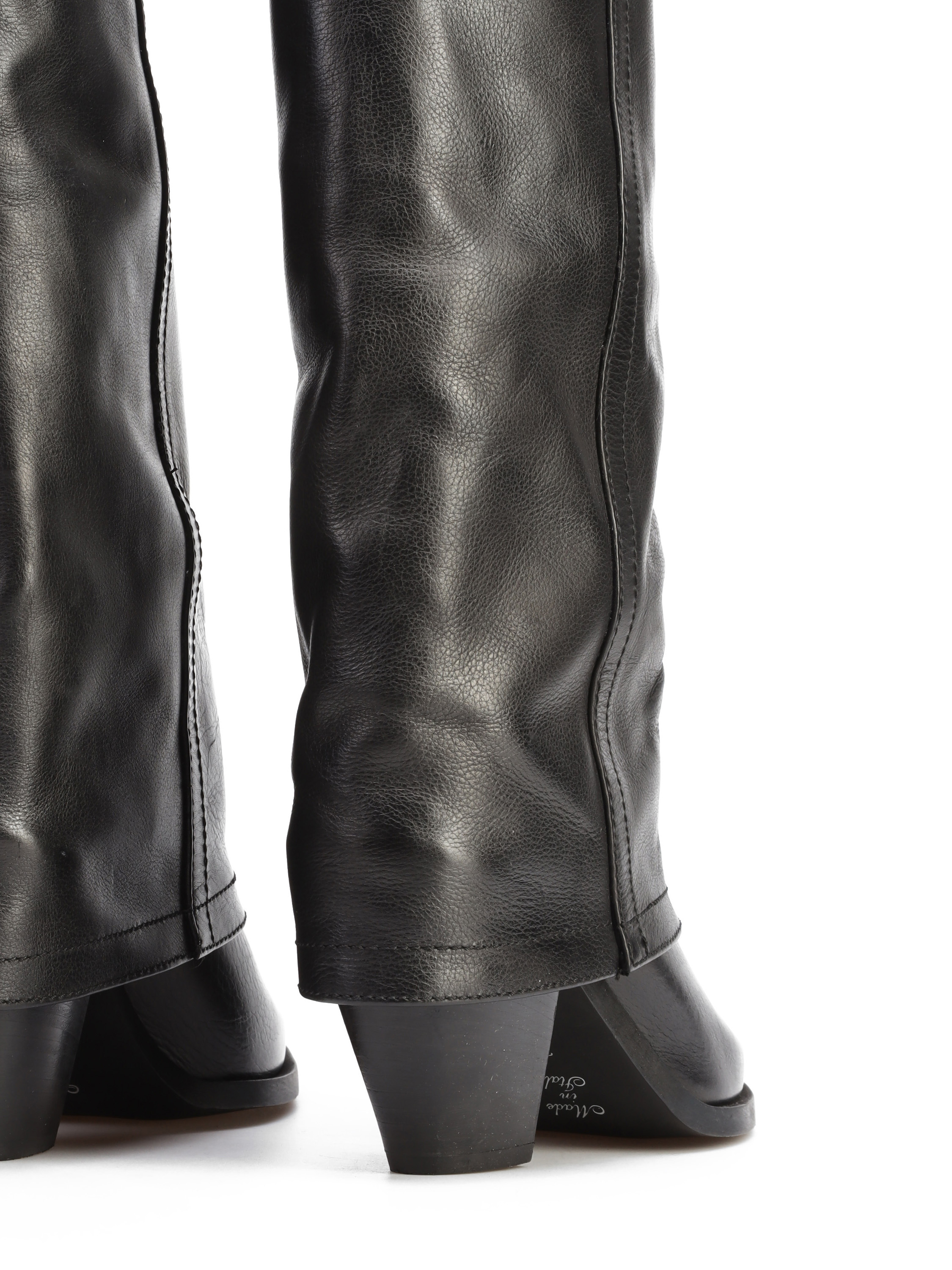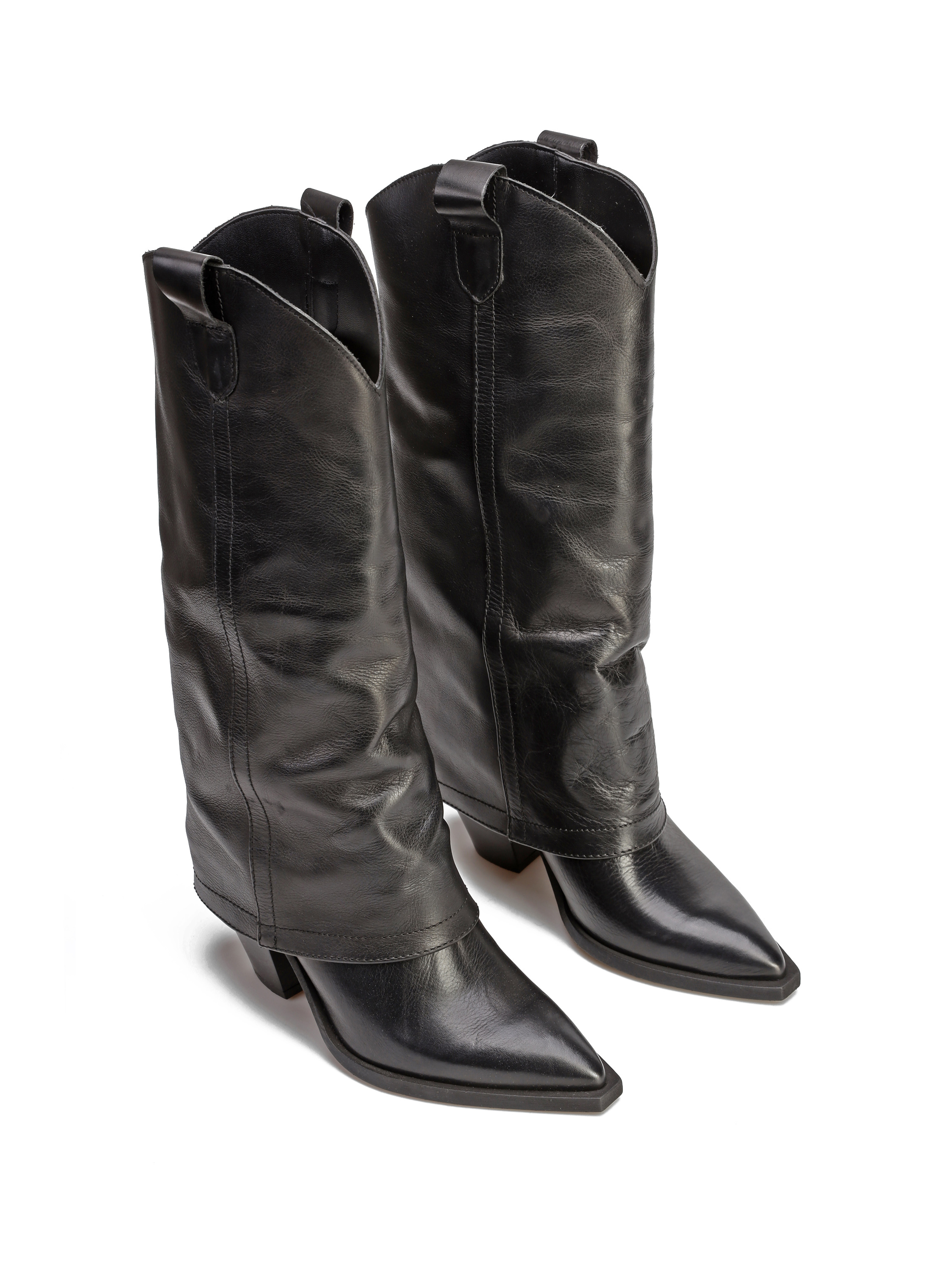 Długie kowbojki to must have sezonu. Wsuwana cholewka w klasycznym, czarnym kolorze wykonana jest z włoskiej skóry naturalnej. Model z charakterystycznym ściętym obcasem na słupku oraz noskiem w szpic.