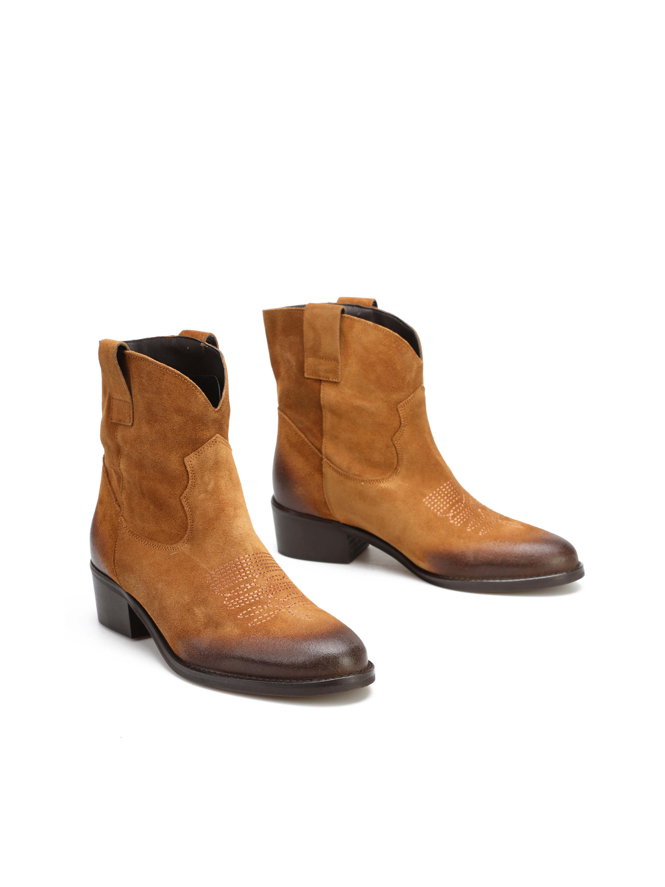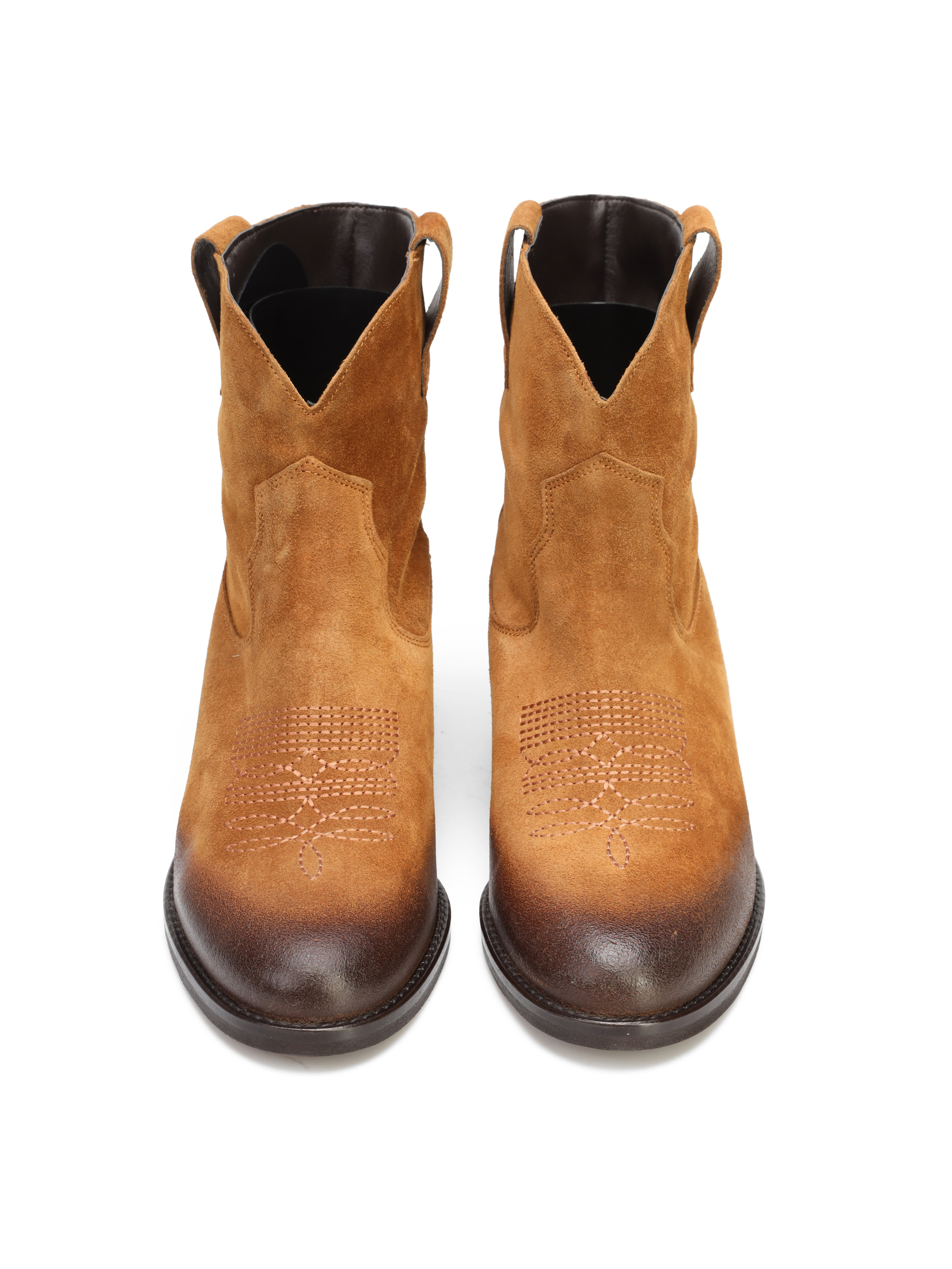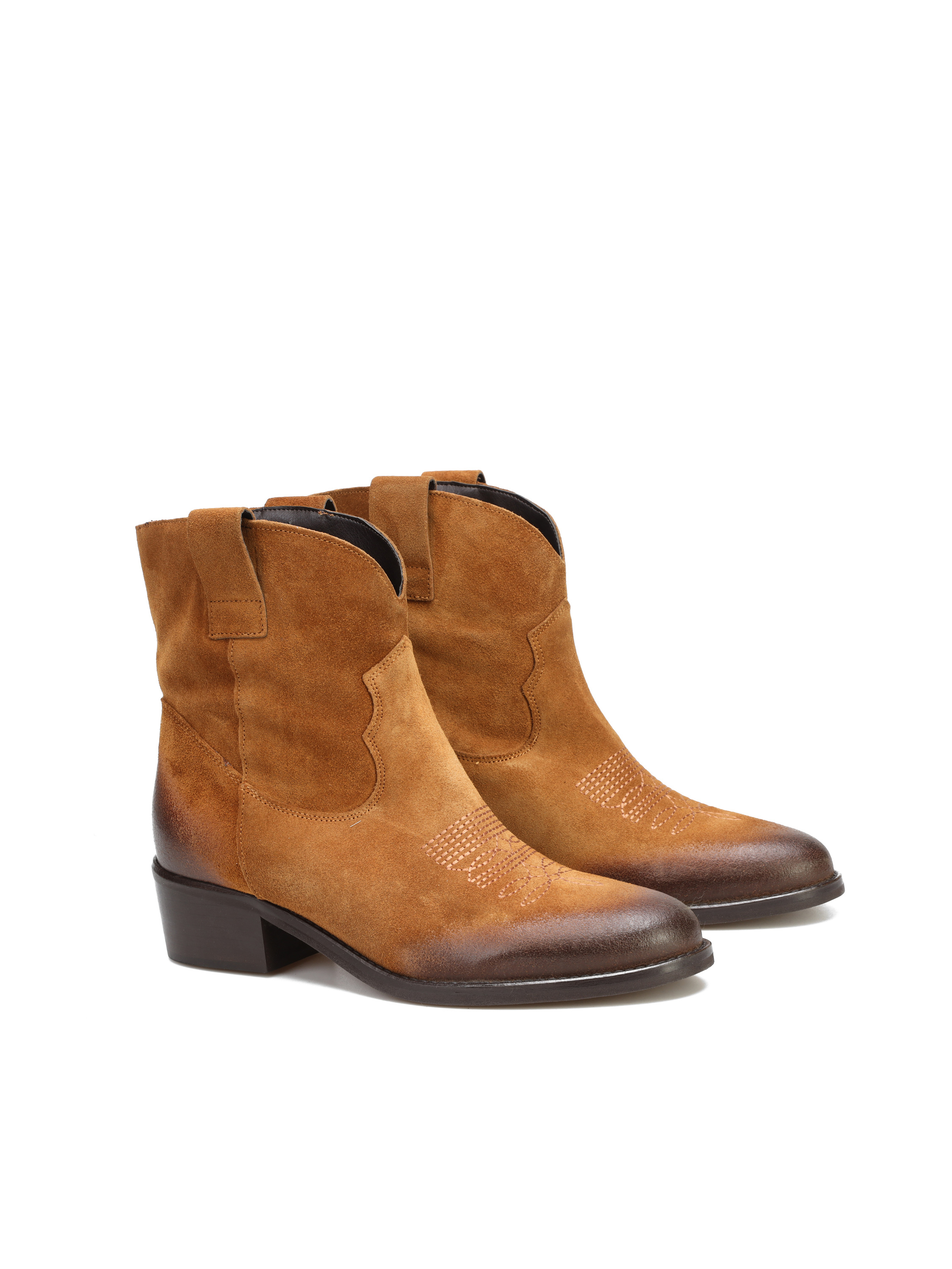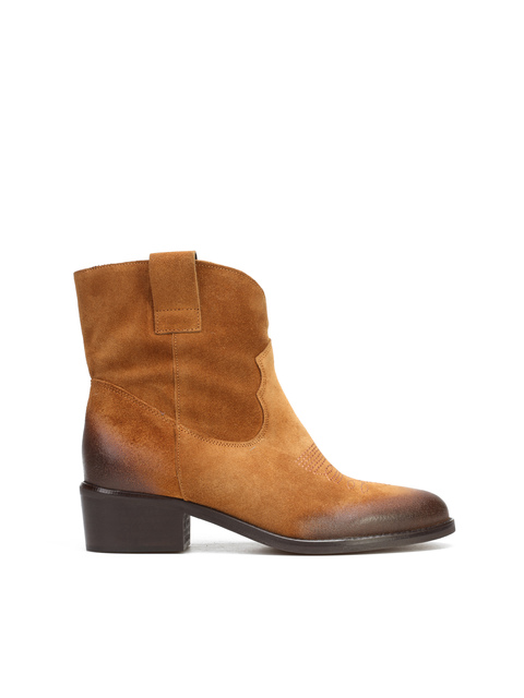 Krótkie zamszowe kowbojki to gorący Trend sezonu. Wsuwana cholewkaw rudym kolorze wykonana jest z naturalnej skóry zamszowej. Charakterystyczny dla tego fasonu ścięty obcas i nosek w szpic wyróżniają ten model.