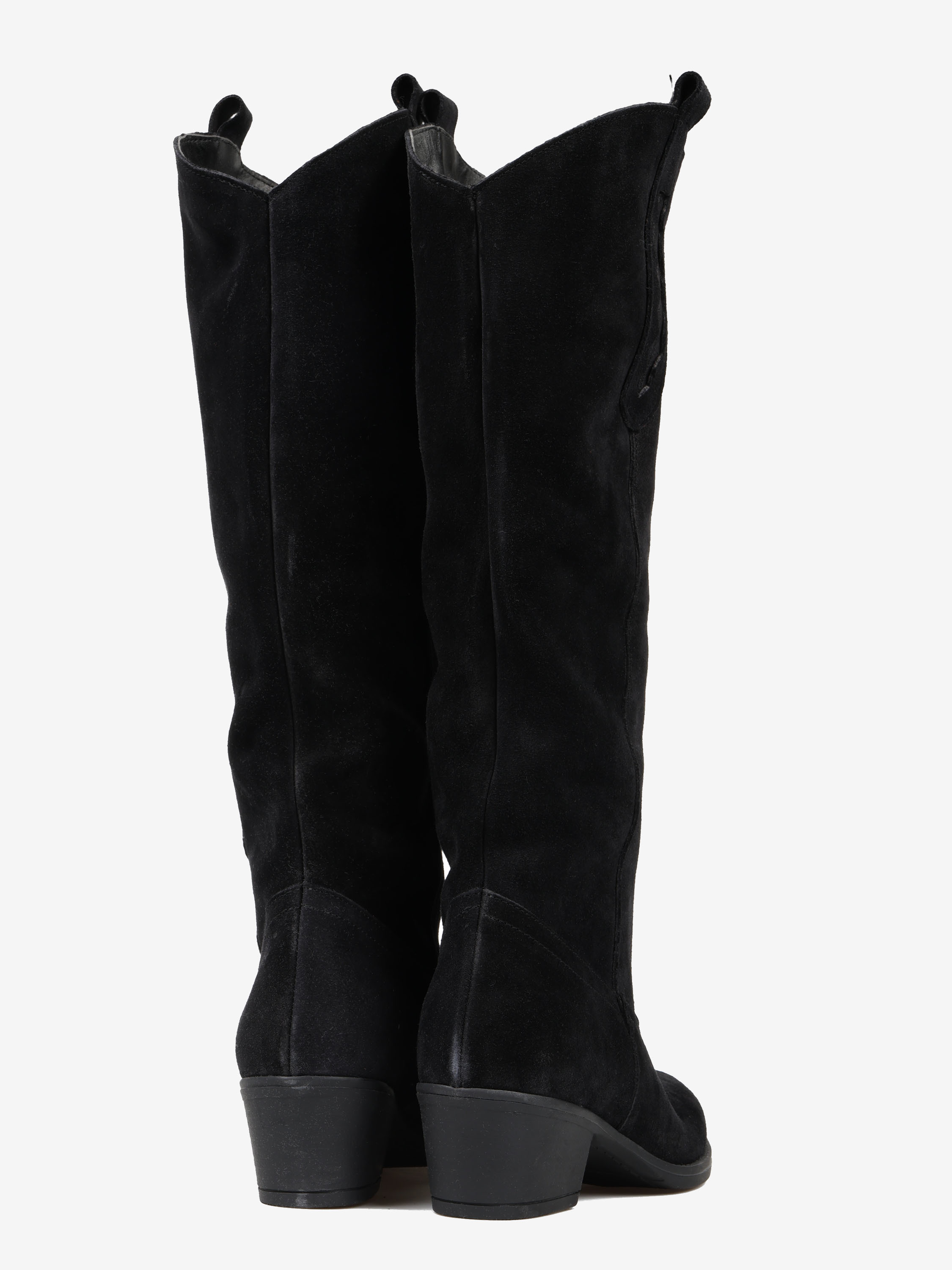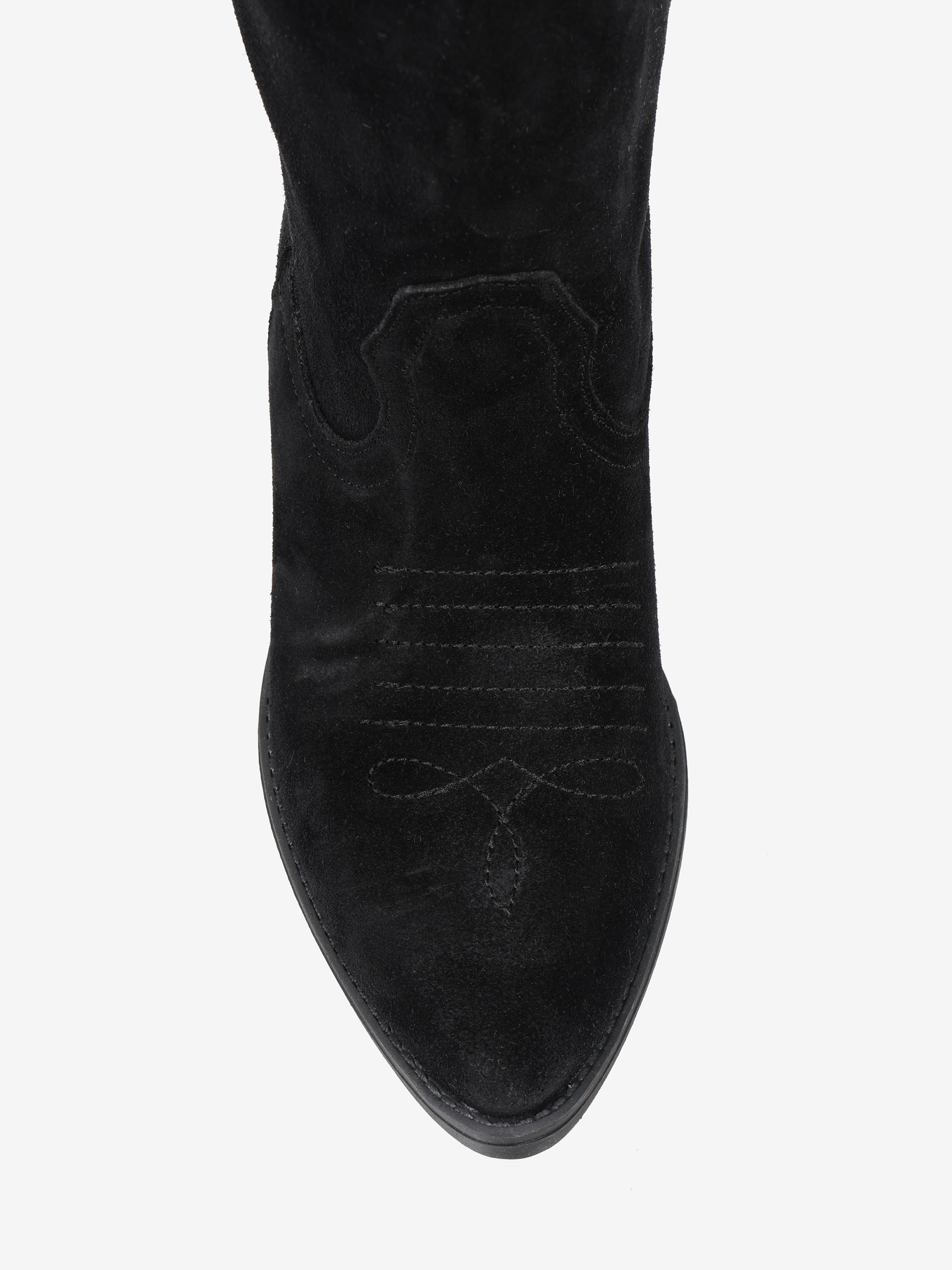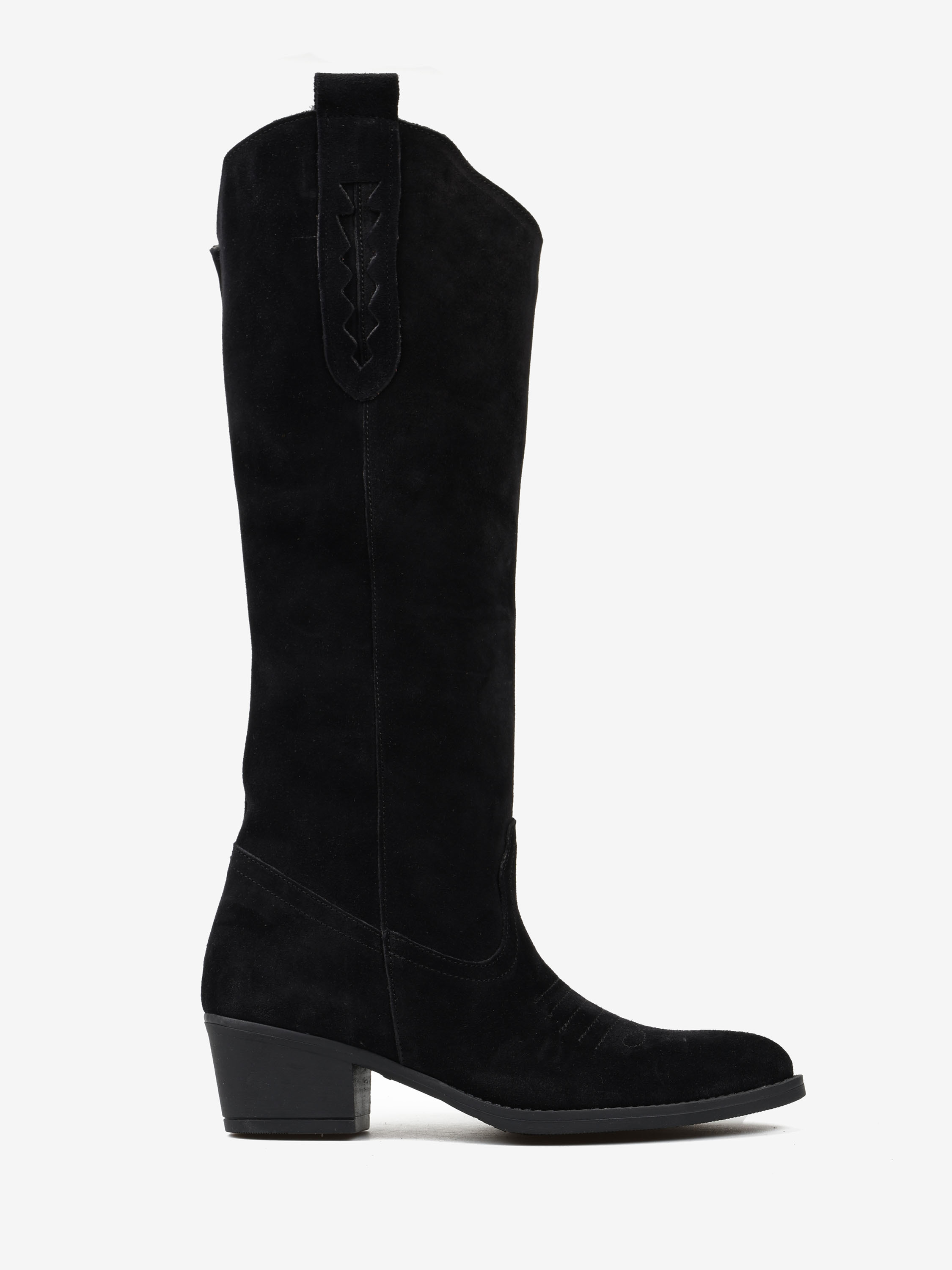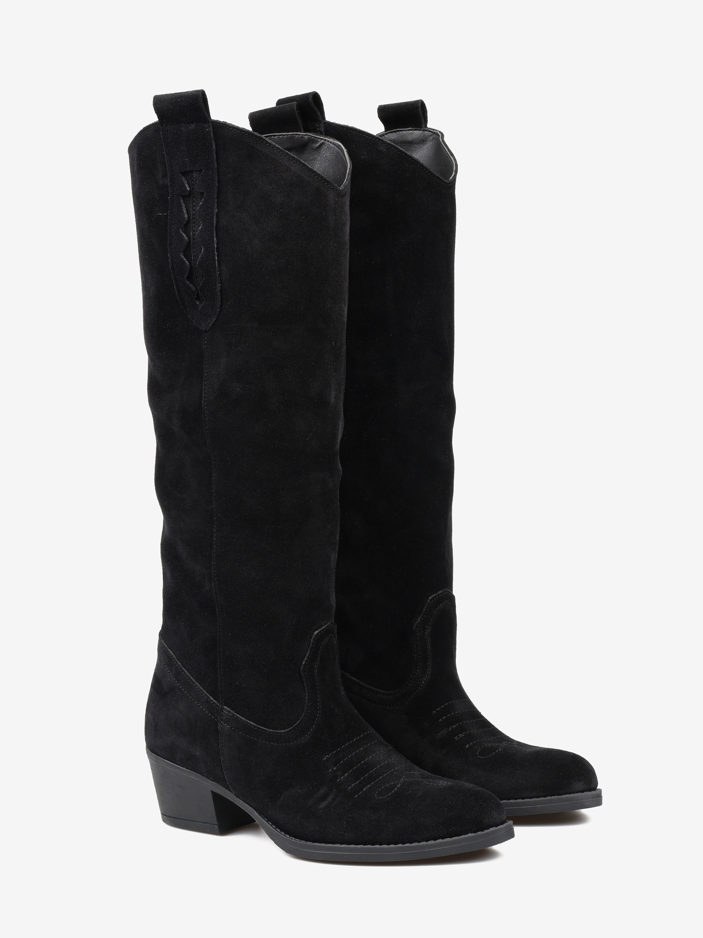 Klasyczne, zamszowe kowbojki z ozdobną szlufką na cholewie i haftem na noskach.