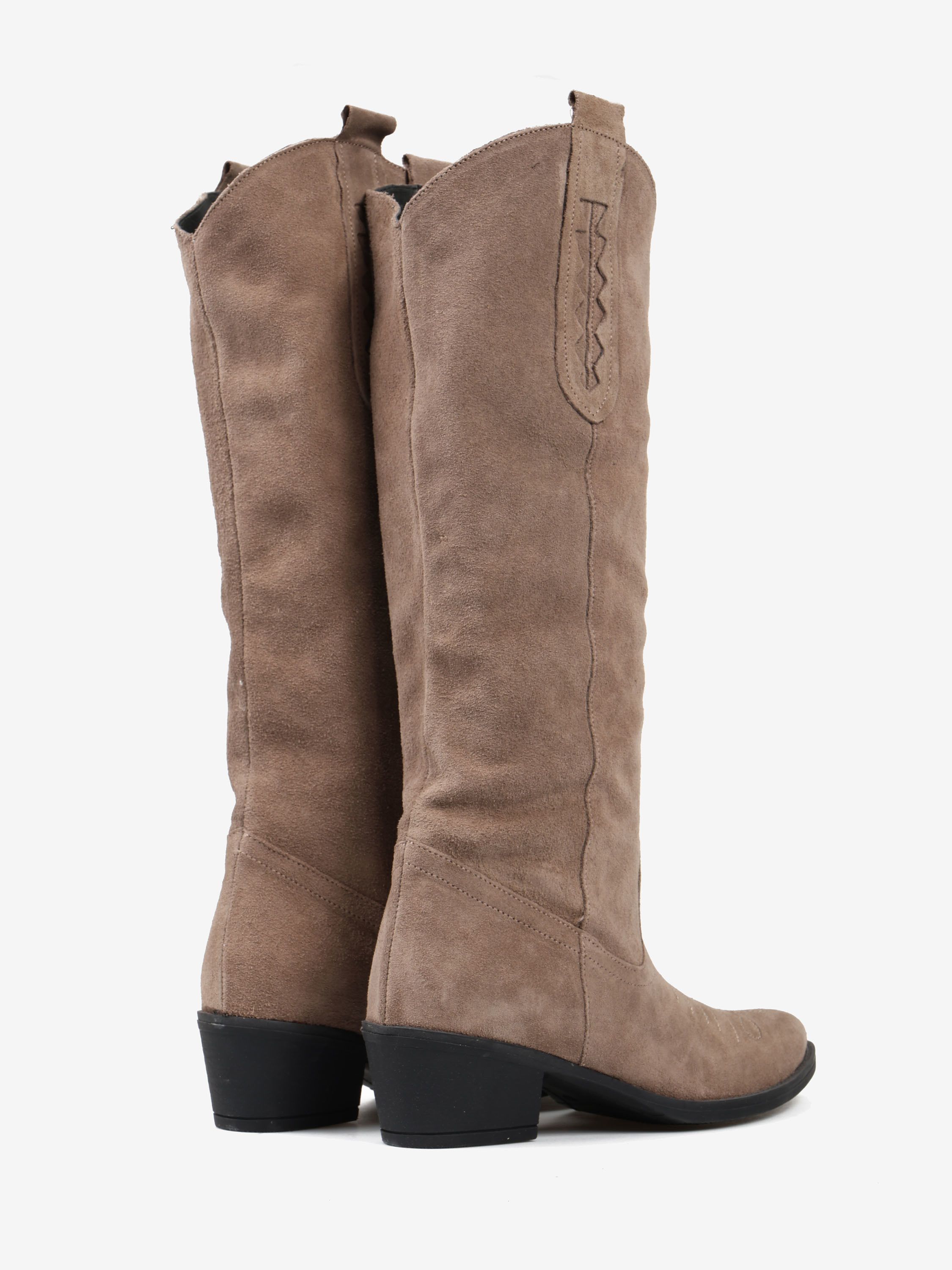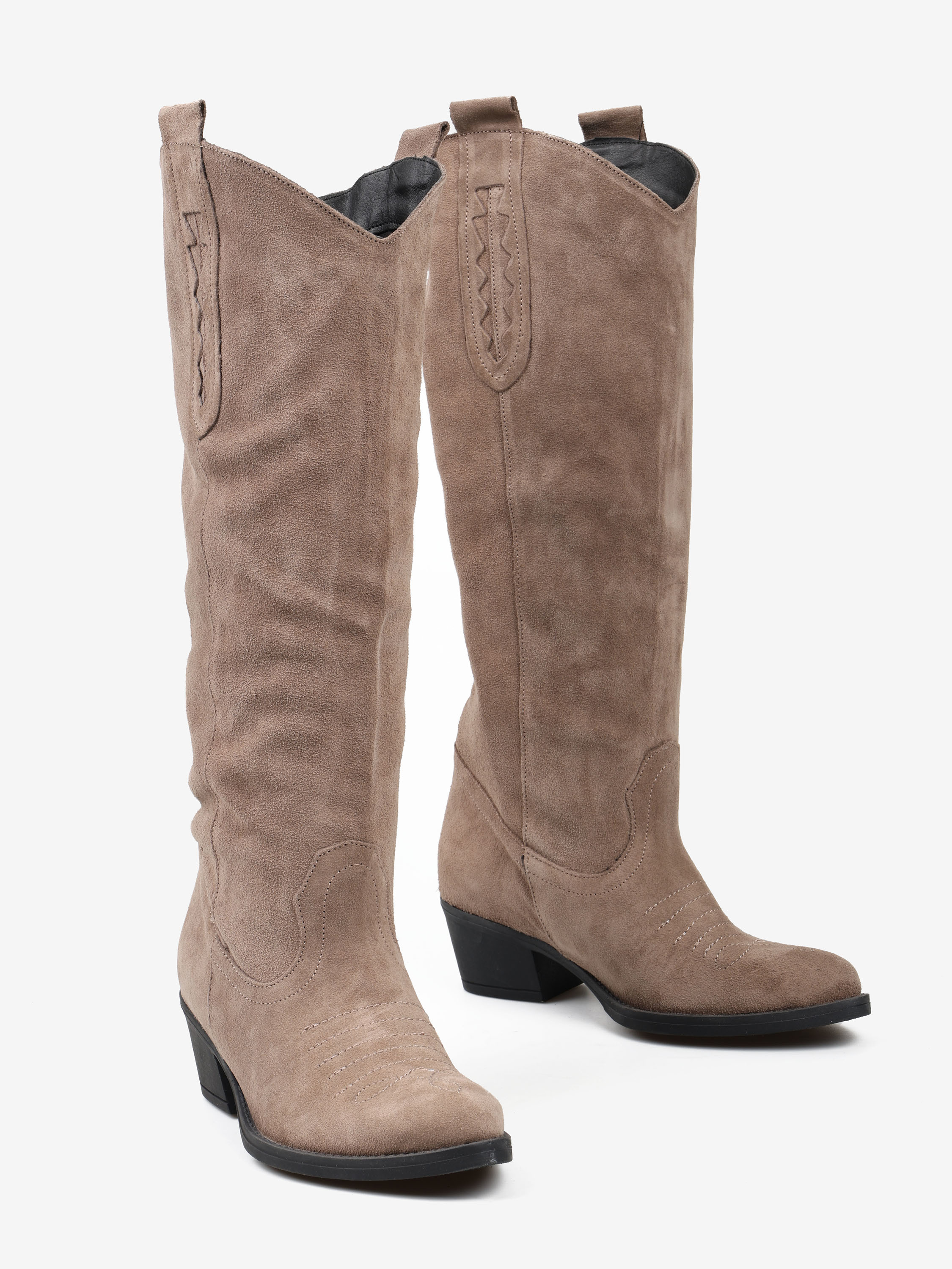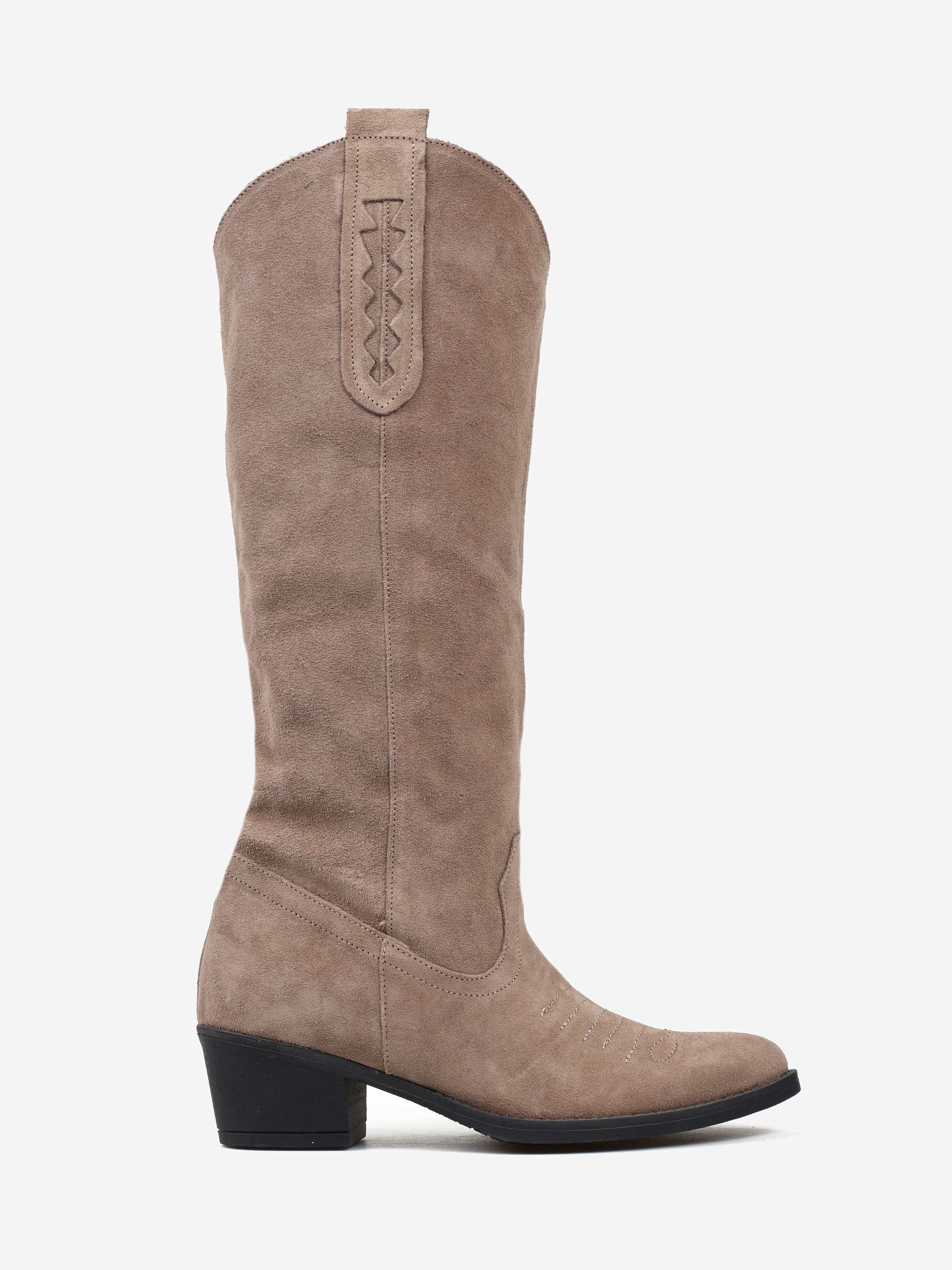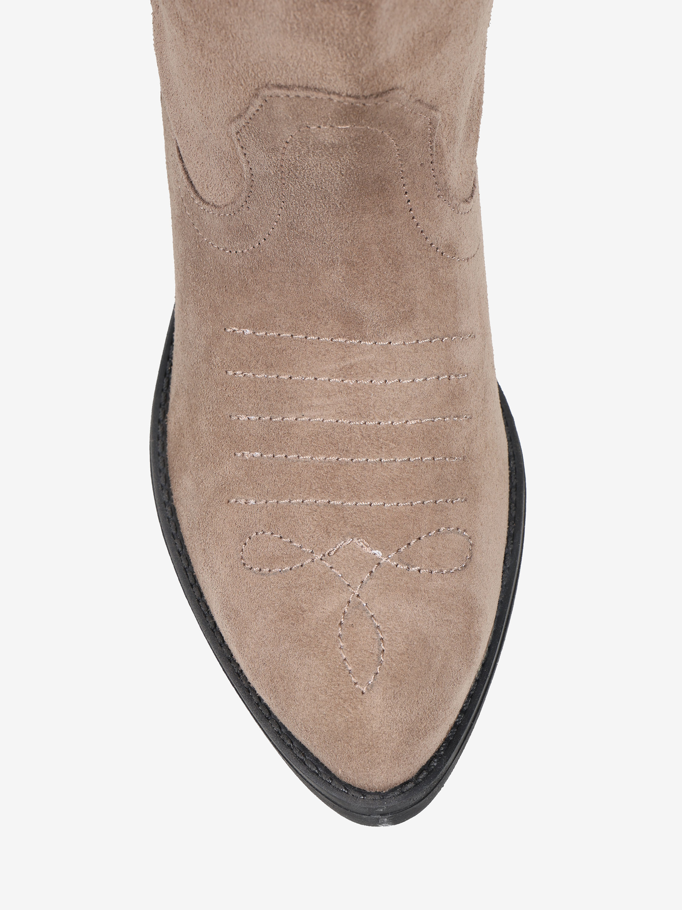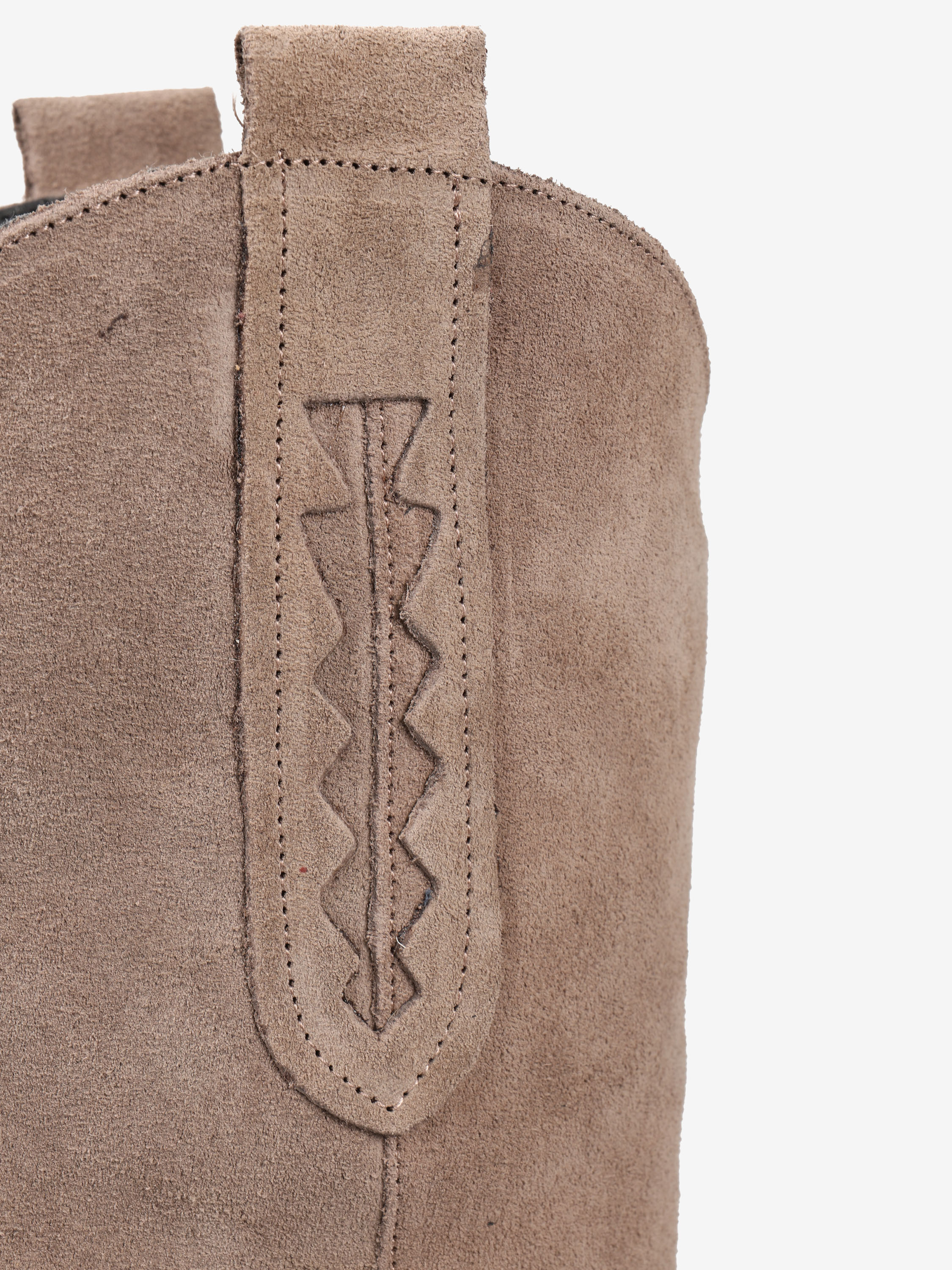 Klasyczne, zamszowe kowbojki z ozdobną szlufką na cholewie i haftem na noskach.