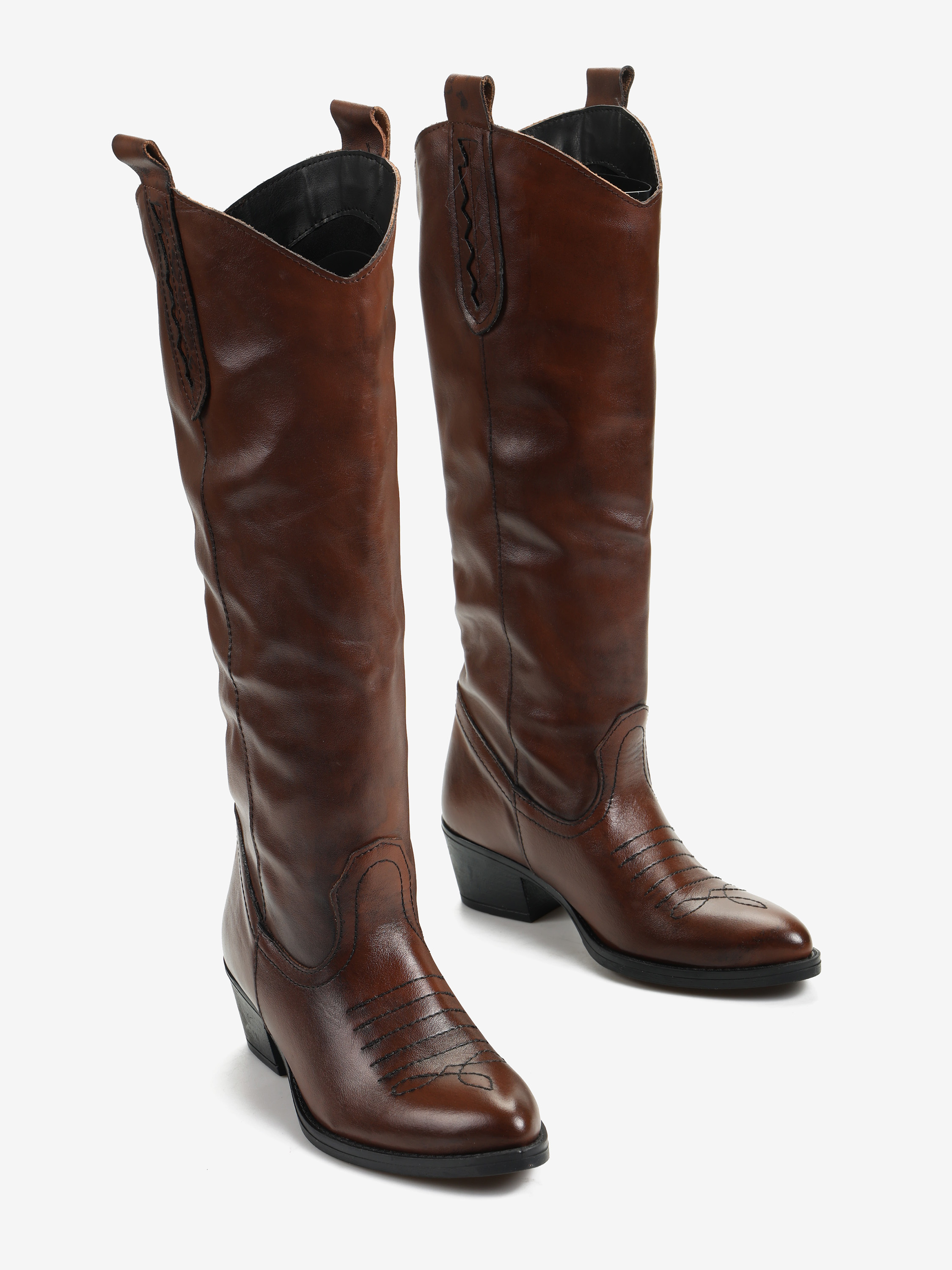 Klasyczne, rude kowbojki z ozdobną szlufką na cholewie i haftem na noskach.
