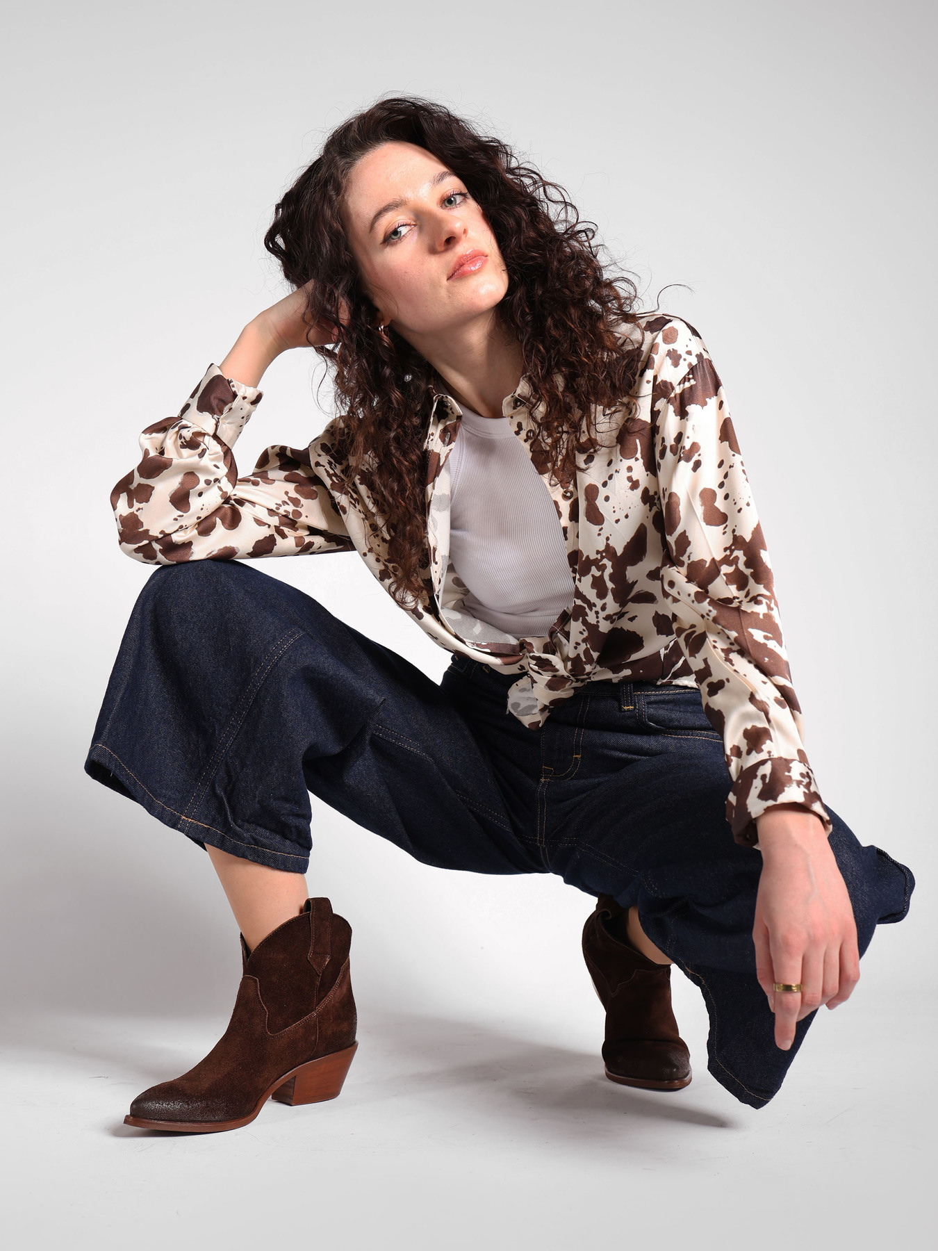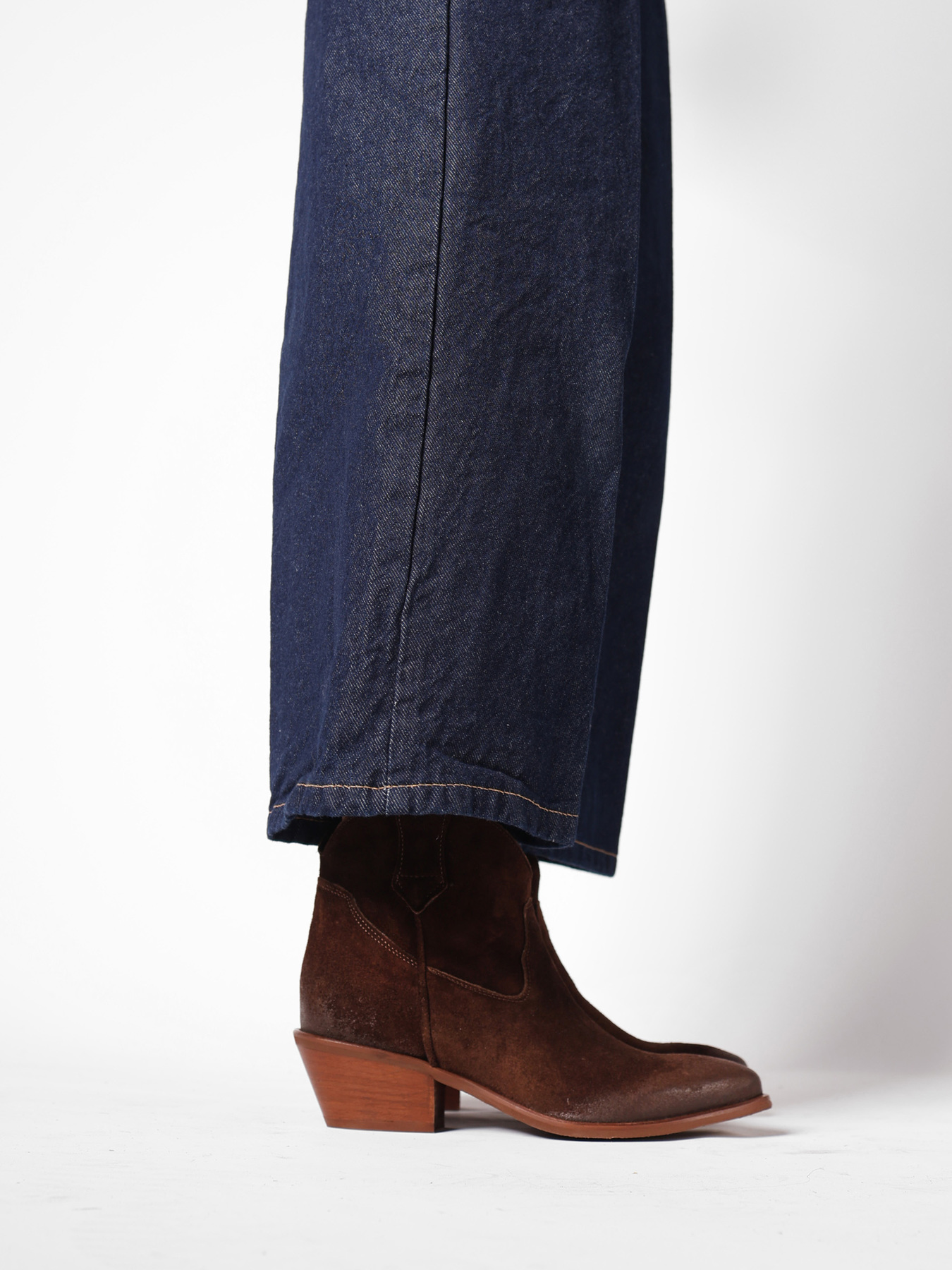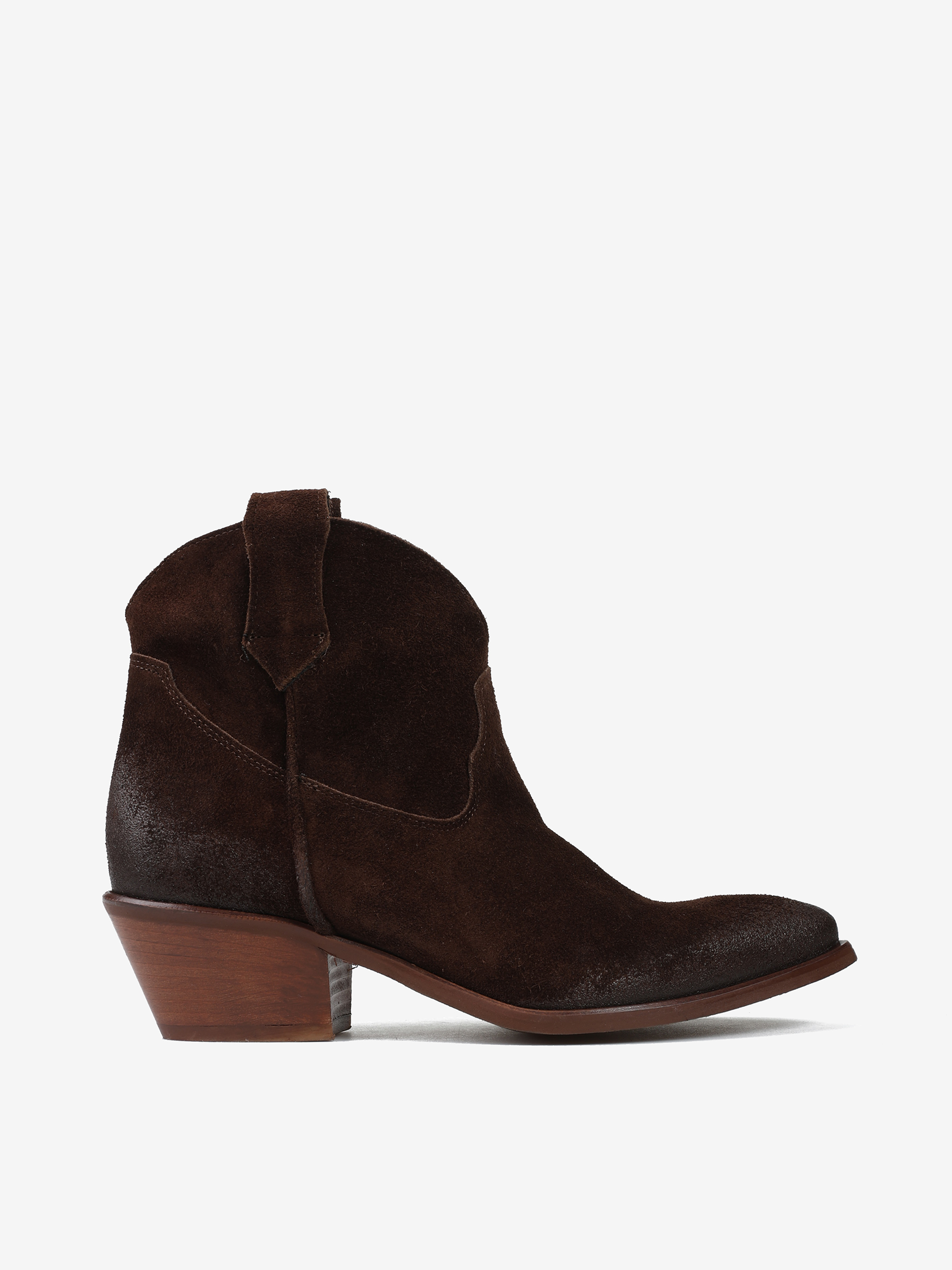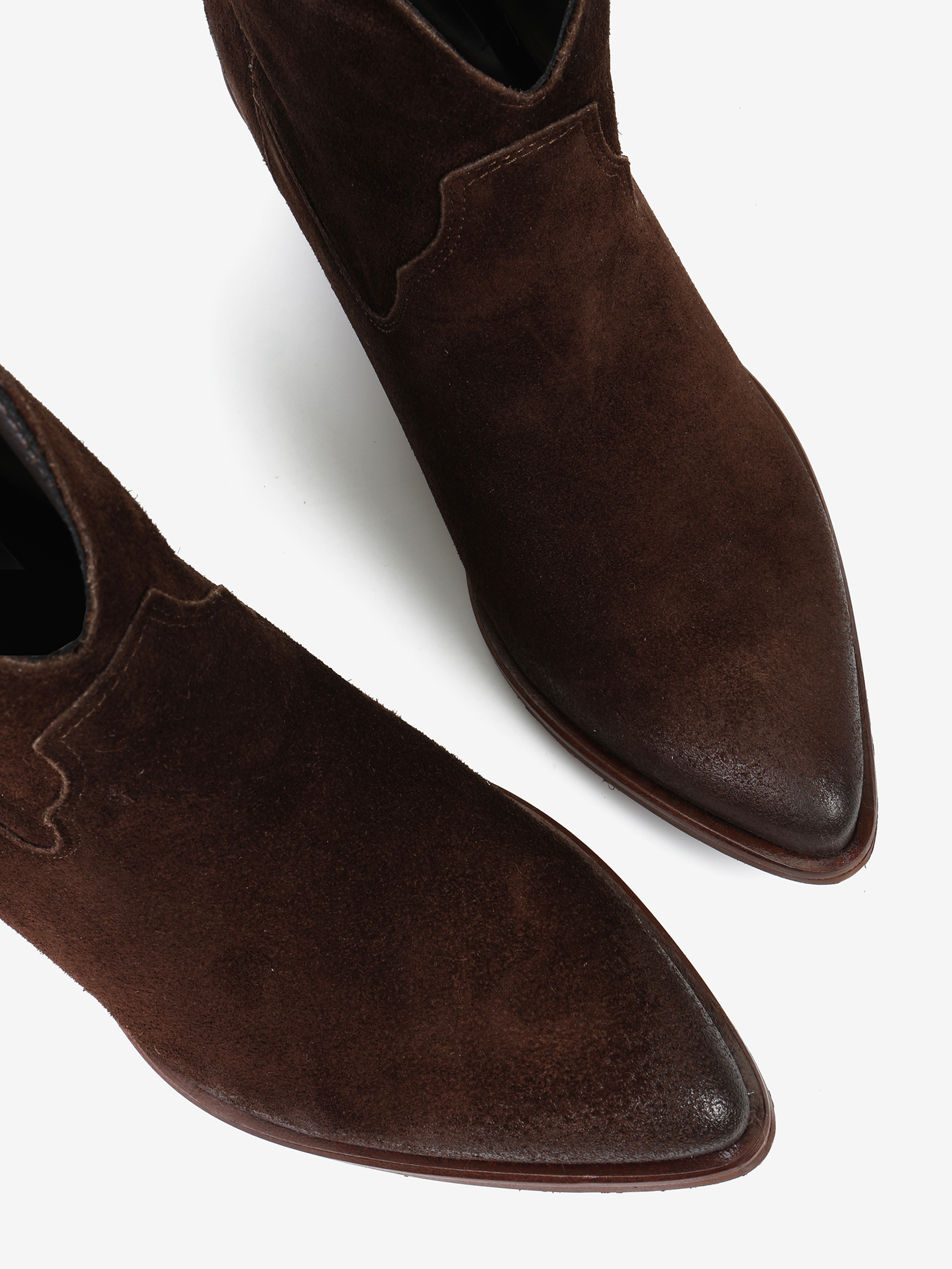 Krótkie kowbojki to gorący Trend sezonu. Wsuwana cholewka w brązowym kolorze wykonana jest z naturalnej skóry zamszowej. Charakterystyczny dla tego fasonu ścięty obcas i nosek w szpic wyróżniają ten model.